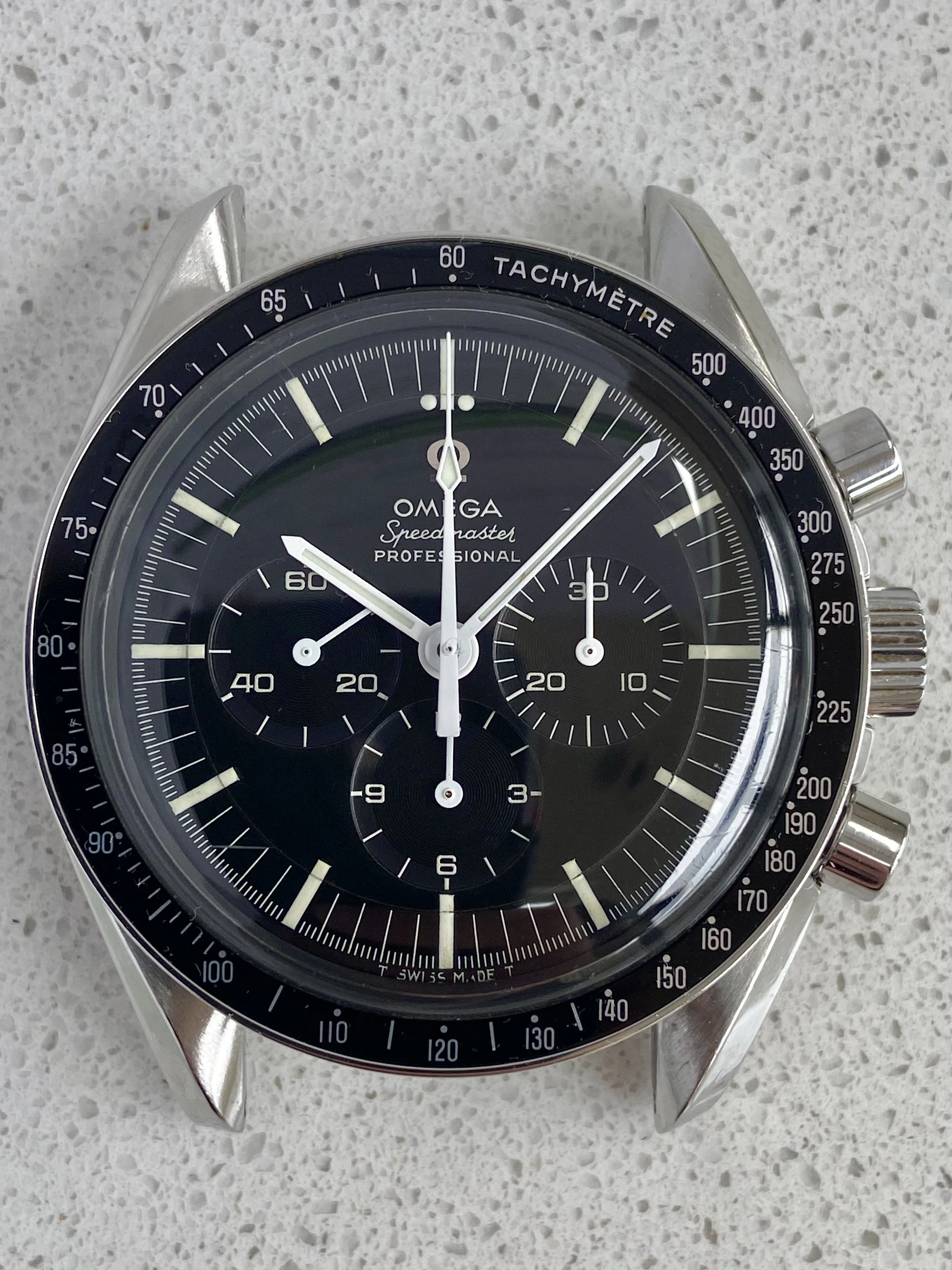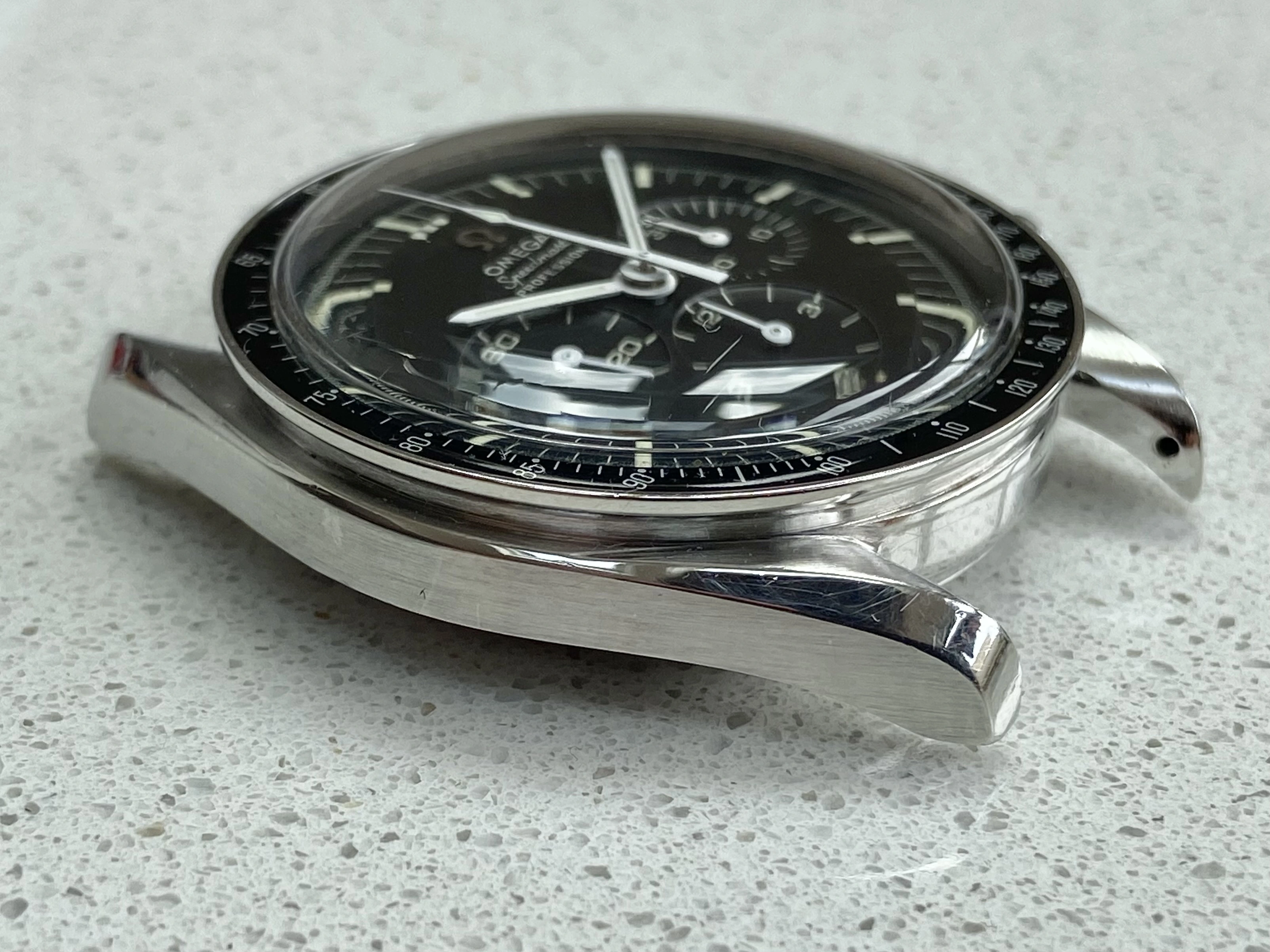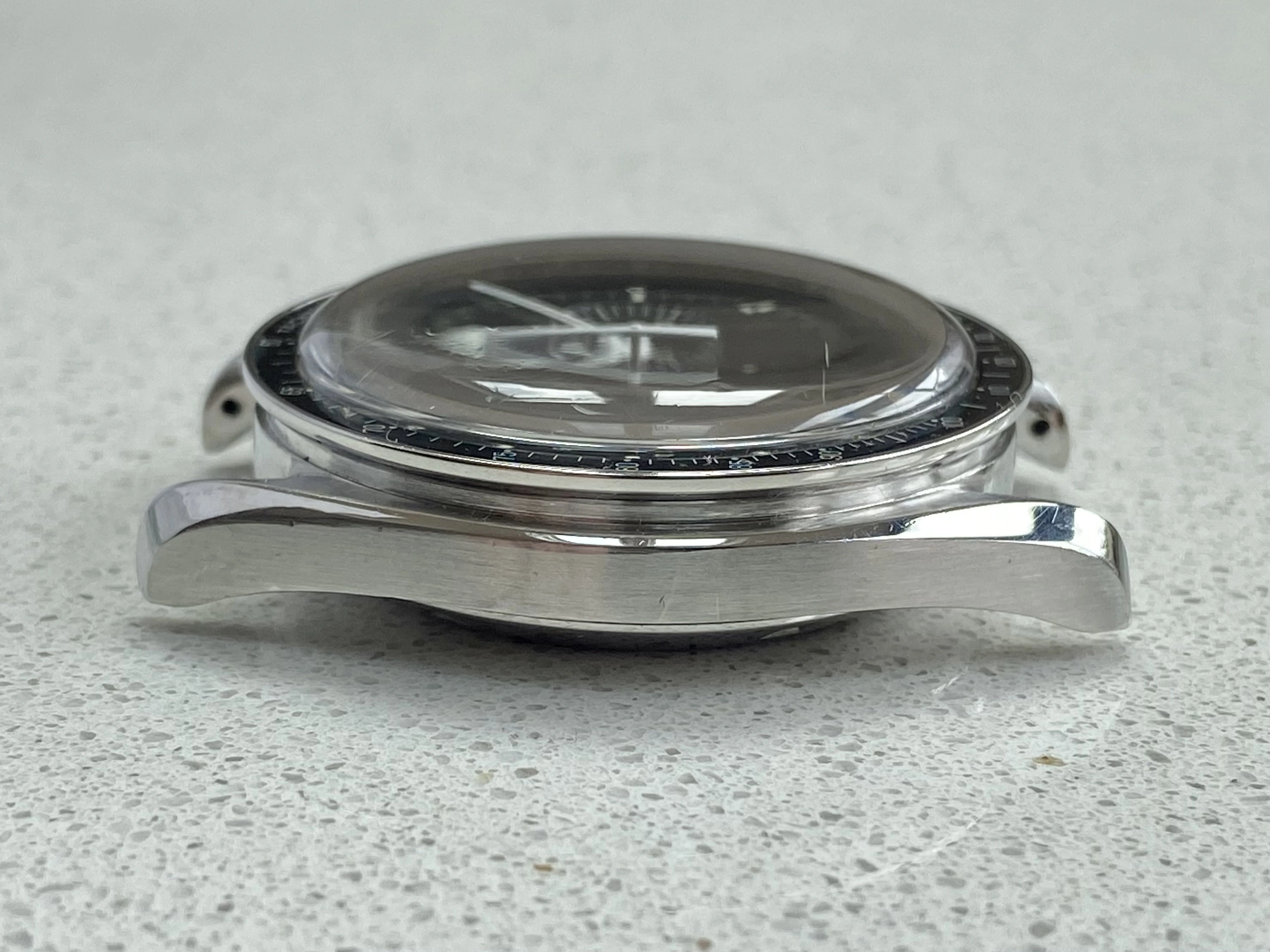 Original case, correct caseback and dust cover. Has been polished but still nice and thick with polished/brushed areas evident. No damage or corrosion. Passed waterproof test in 2015. Omega signed crystal, service crown, pushers and bezel (installed in 2015).