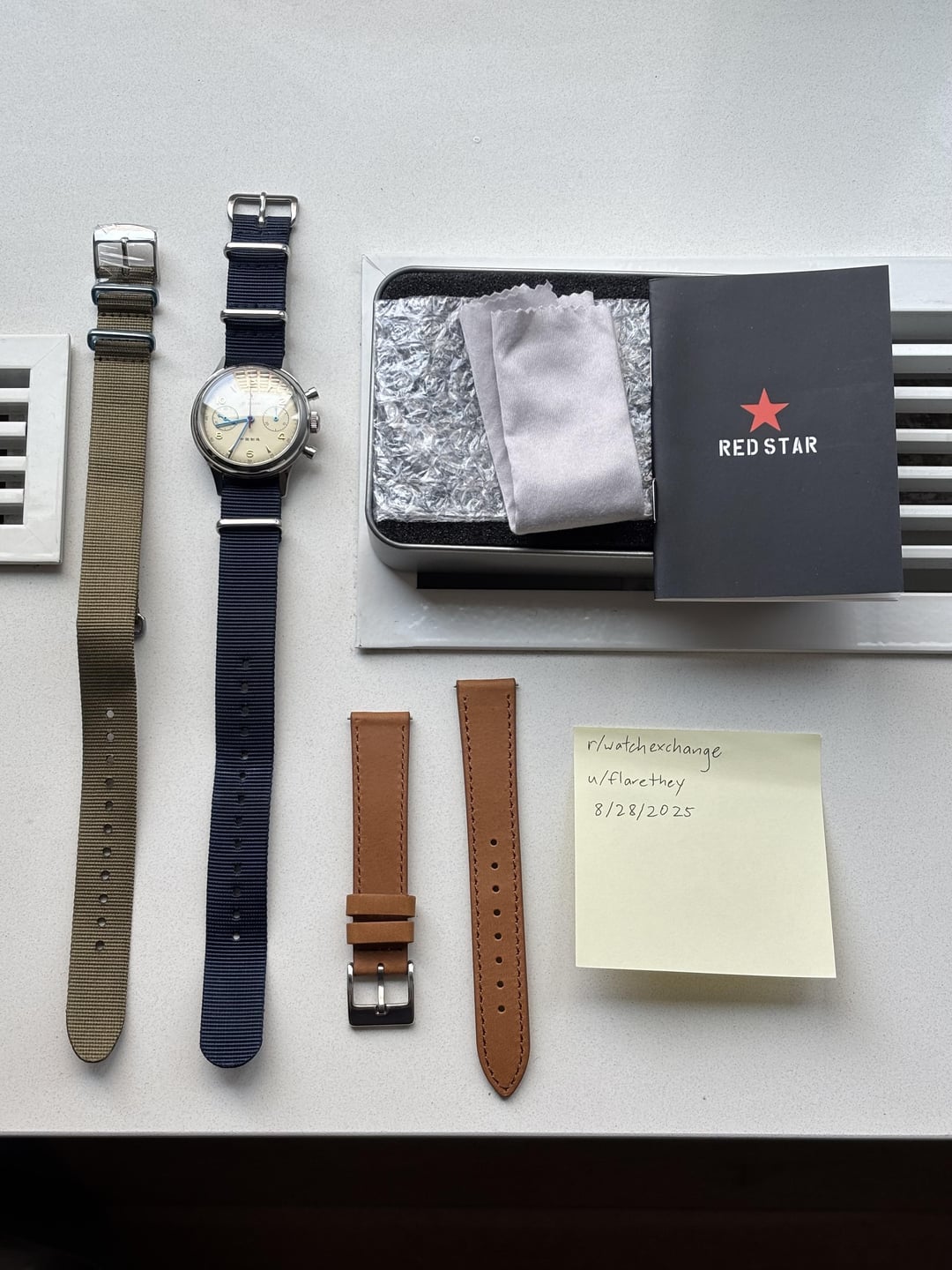 Selling my Red Star Seagull 1963. I bought this after regretting selling my last 1963, but am now selling due to acquiring my grail chronograph. Comes with 2 nato straps and a leather strap. Condition is used, scratches pictured. Asking for $150 CONUS, Paypal and Venmo accepted. Pictures: [https://imgur.com/a/8gpYNin](https://imgur.com/a/8gpYNin) Timestamp: [https://imgur.com/UBsqByI](https://imgur.com/UBsqByI)