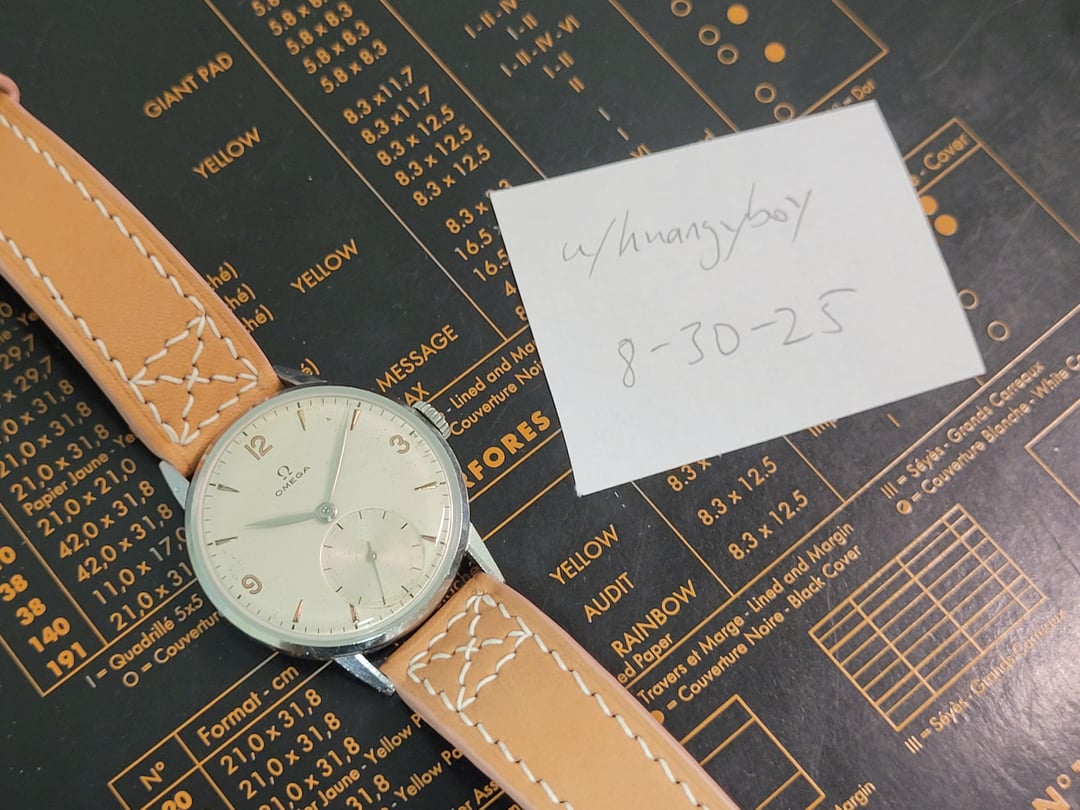 Selling a 1940s Omega (ref. 2271-12)! Bought this a while ago on watchex [here](https://www.reddit.com/r/Watchexchange/comments/1l1nb0i/wts_1947_omega_ref_227112_cal_260_360/), but still am in need of funds, so more stuff has to go. The indices are subtly gilded, which makes them really pop under natural light. Expect heavy scratching on the case; there is a tiny scratch on the dial; the crown is also slightly bent. The watch has been fitted with a sweet handmade leather strap- I don’t cheap out on straps, and it feels & looks great during the time I wore it. The watch has been serviced about 2 months ago, and is running very strong. The crystal and mainspring have been replaced with genuine omega parts, but everything else has been left original. The crown is original, and the gasket has been replaced with an o-ring. *Do not* expect the watch to be waterproof in any metric though, since it’s a snapback case. I will include the original crystal with the watch, just for fun. * Case diameter: 34.8mm * Lug width: 17.5mm (but can fit 18mm straps) * Lug-lug: 41.5mm * Thickness: 8.8mm (including crystal) * Movement: cal 260 * Rate: +/- 15 s/d * Amplitude: 300 * Beat error: 2.5 ms (see timegrapher pic) The rate mostly depends on the state of wind on the mainspring (which is pretty normal)- fully wound the watch runs at a positive rate, but leave it for a day and it runs slow. I’ve been winding it once every 24h, and it’s been keeping within 5 seconds per day. If you so desire, you can probably take the watch to a watchmaker to dial in the beat error. I am asking **$490** \+ free US shipping through Paypal G+S, due to the service cost and new ($40) strap. Feel free to send an offer though! Apologies for the wall of text lol I will consider trades but prefer sale. **If you happen to have a hanhart 417 39mm** ***bracelet*****, I will gladly do a 1-1 trade.**