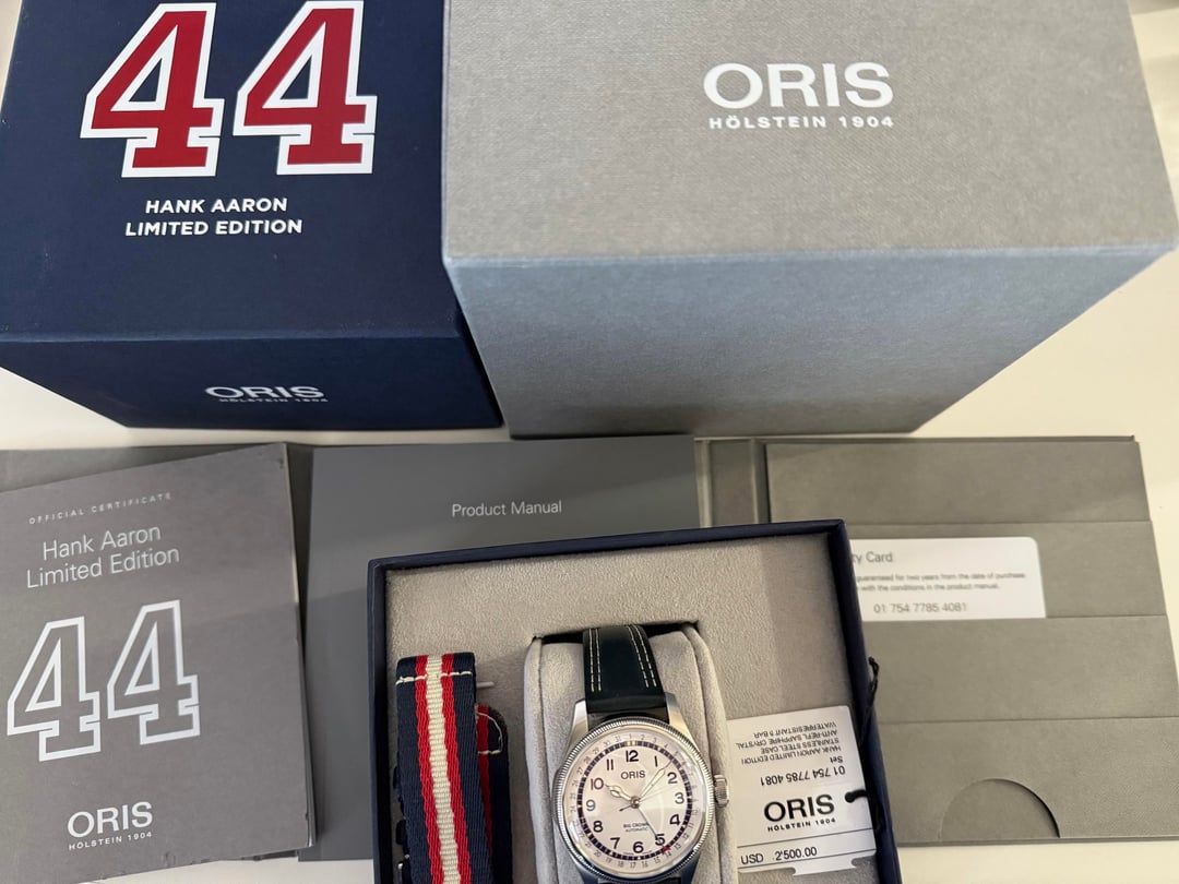 Oris Hank Aaron Limited Edition 01 754 7785 4081-Set (#21 of 2,297) Excellent condition, comes with box and papers. Under Casa D'Oro warranty until July 2026. $1,795 shipped (US lower 48 states only)
