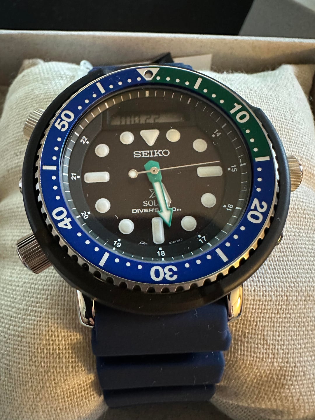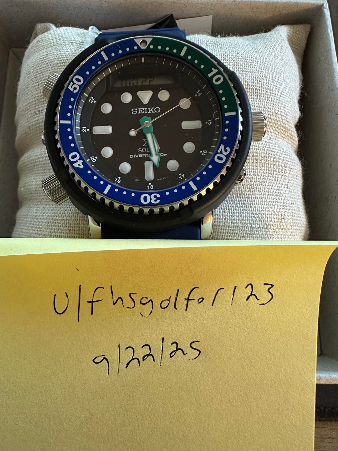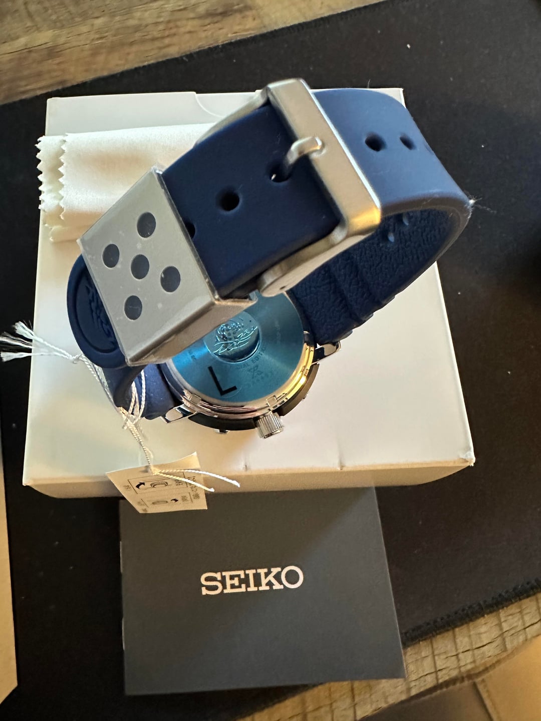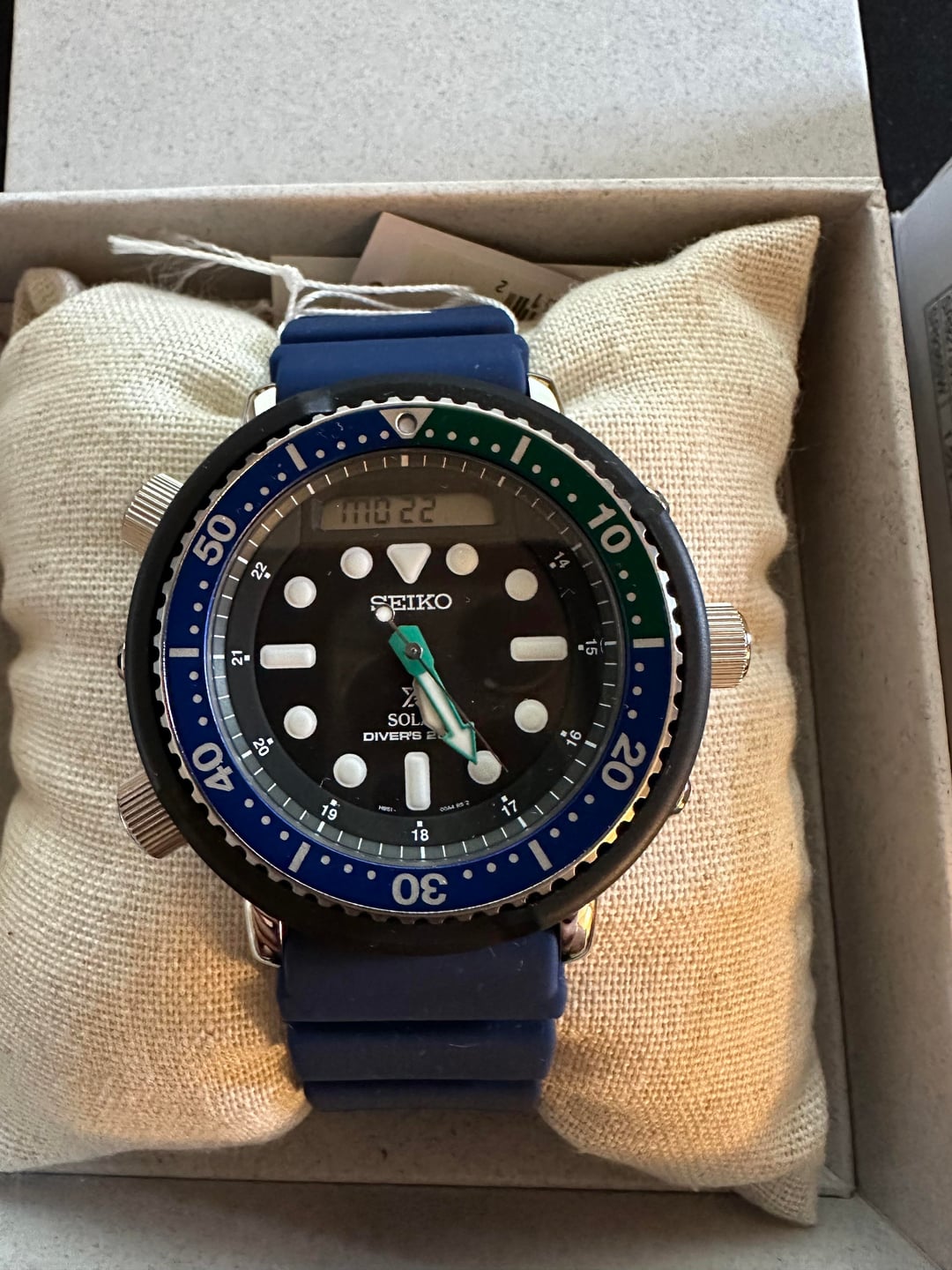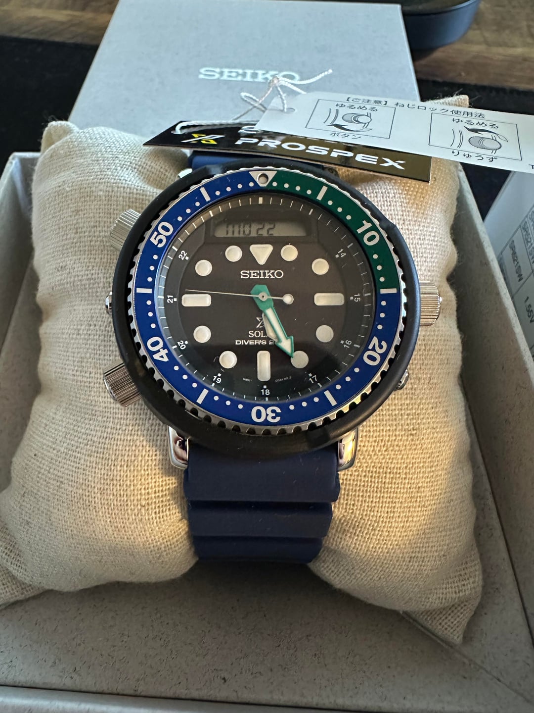 Selling this brand new in box Seiko Arnie special edition SNJ039. I think it’s the tropical lagoon special edition. I purchased it new last week from an AD with another colorway to see which I like better and I like the classic all black better. This is brand new, still has all the protective stickers and hang tags on it that have never been taken off. I’ve never worn it. It also has the inner and outer box and instruction manual. I’m planning to return it but wanted to give someone a chance to purchase it for what I got it for (which I think is a good) before I do so. So I’m asking $285 shipped in CONUS firm. I have many transactions on here, hundreds on eBay, and my own Etsy shop. Feel free to ping me for any references.