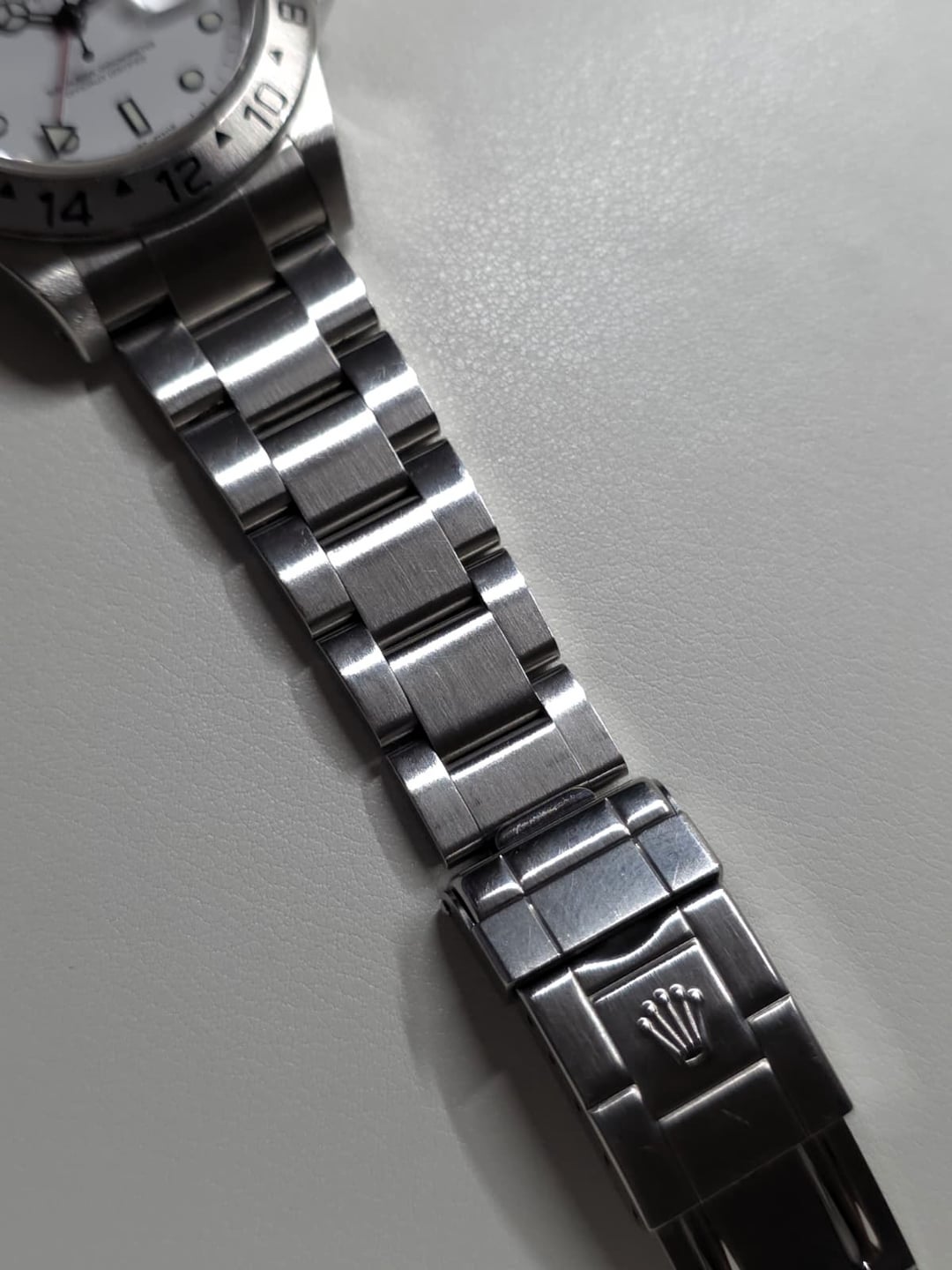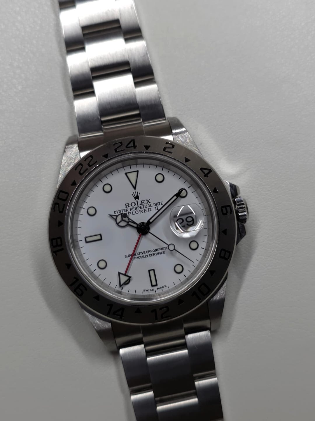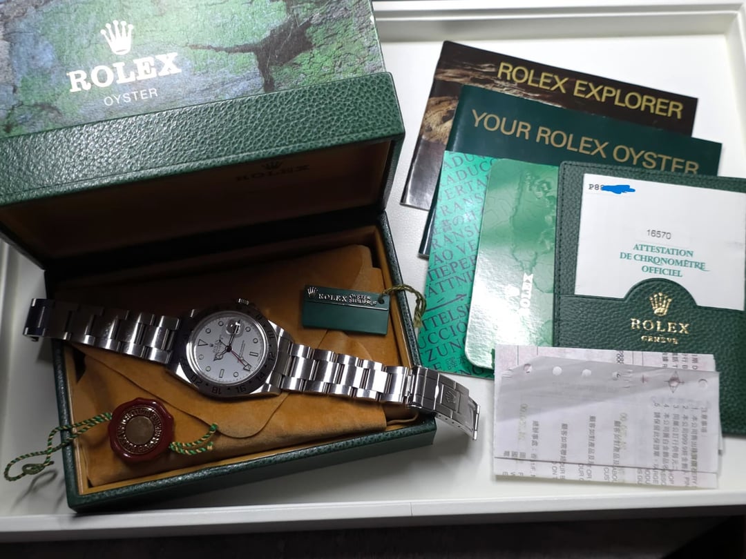 **Rolex Explorer II – Polar Dial** Ref: 16570 Serial: P (2000) Up for sale is a true collector’s set of the highly desirable Rolex Explorer II “Polar Dial.” This piece remains in **unpolished condition** with only light wear throughout, showcasing its original lines and sharp case edges since leaving the factory in 2000. From the look of it, this watch has spent the majority of its life stored safely away. It is a **full and complete set**, including: * Double box with pillows   * Serial and hang tags   * All booklets and calendar   * Original punched papers, dated 9/2/2001   * Original purchase receipt (rare to find)   The Oyster bracelet comfortably fits a 7.5" wrist, shows very minimal stretch, and carries the correct clasp code **DE (2001)**. The movement is running strong and within spec on the timegrapher. This is an incredible opportunity to acquire a sought-after Explorer II Polar with everything a collector could ask for—unpolished condition, full set, and even the original sales receipt. Price = $8,499 shipped Pics & Timestamp - [https://imgur.com/a/xp19K9J](https://imgur.com/a/xp19K9J) IG = watchfornia Cheers, Adam