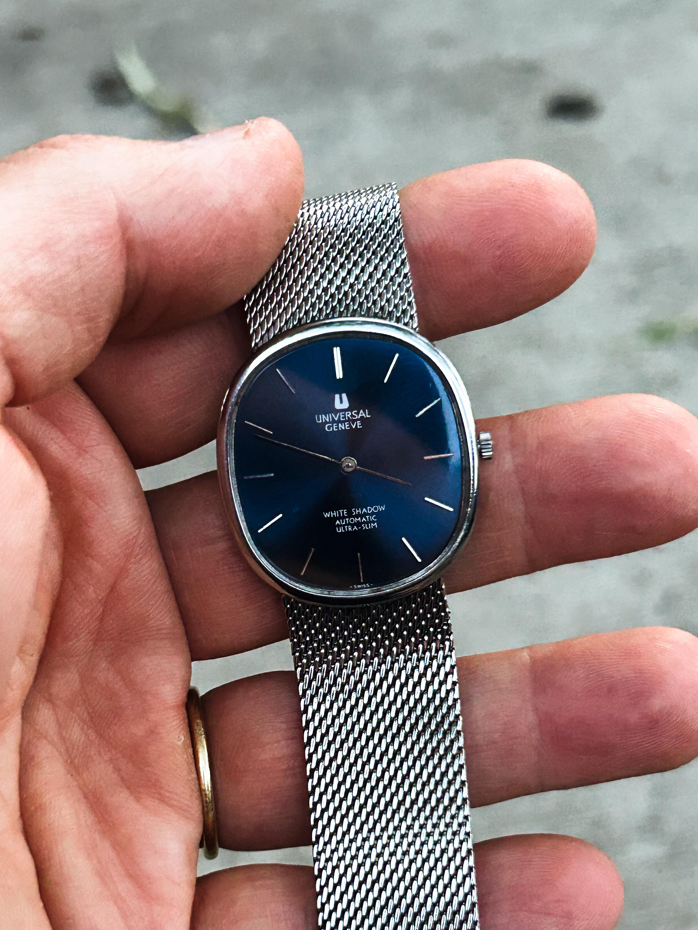 Universal Geneve White Shadow ref. 866104 An absolutely stunning example of the elegant UG White Shadow. A beautiful stainless steel integrated bracelet piece from the late 60s/early 70s. Micro-rotor automatic movement makes it slim and beautiful. Incredible condition. Running extremely well. Most of these are located in Europe (meaning tariffs!) if you wanted to find one in the USA, now is your chance! Asking $2,999 or best offer Pictures: https://imgur.com/a/9QVpvYj Timestamp: https://imgur.com/a/iYL5K71