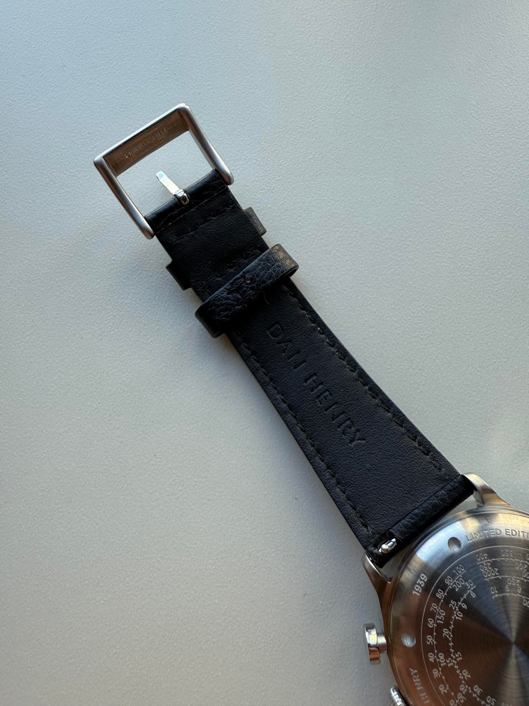 For sale is my Dan Henry 1939 Chronograph. This is the original black dial version which had a limited production of 1939 pieces. This example is number 1078. I bought this watch brand new and have only worn it a handful of times. As a result, the watch and its original straps are in excellent condition. The watch measures 41 mm wide, 13.9mm thick, 49.2 mm lug to lug, and it takes 22 mm straps. The battery was replaced back in June, and everything works as it should. I am asking for $225 plus shipping via PayPal (F&F or G&S). I intend to ship via USPS Priority Mail and would prefer to ship within CONUS. I live near Arlington, VA and would be happy to meet in-person. Don’t hesitate to reach out with any questions. Finally, please note that I will be traveling abroad as of October 4th, so I may be slow to respond and will not be able to ship the watch until I return towards the end of October.
