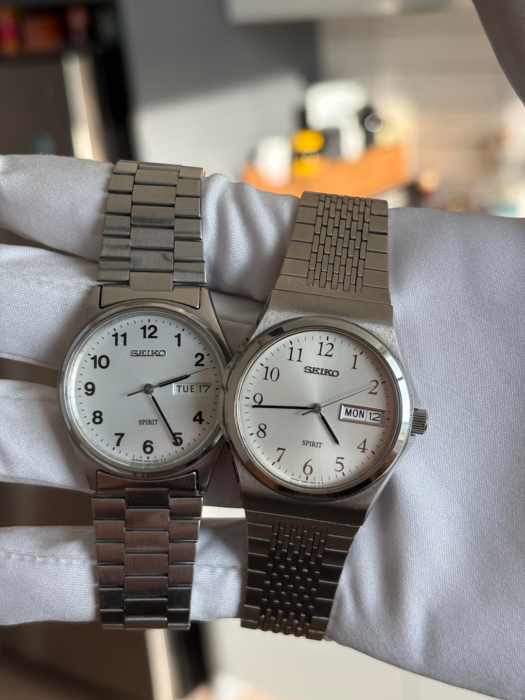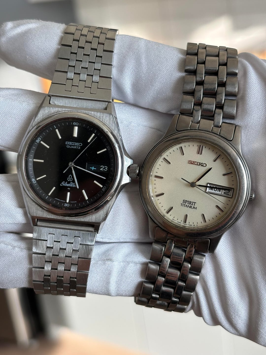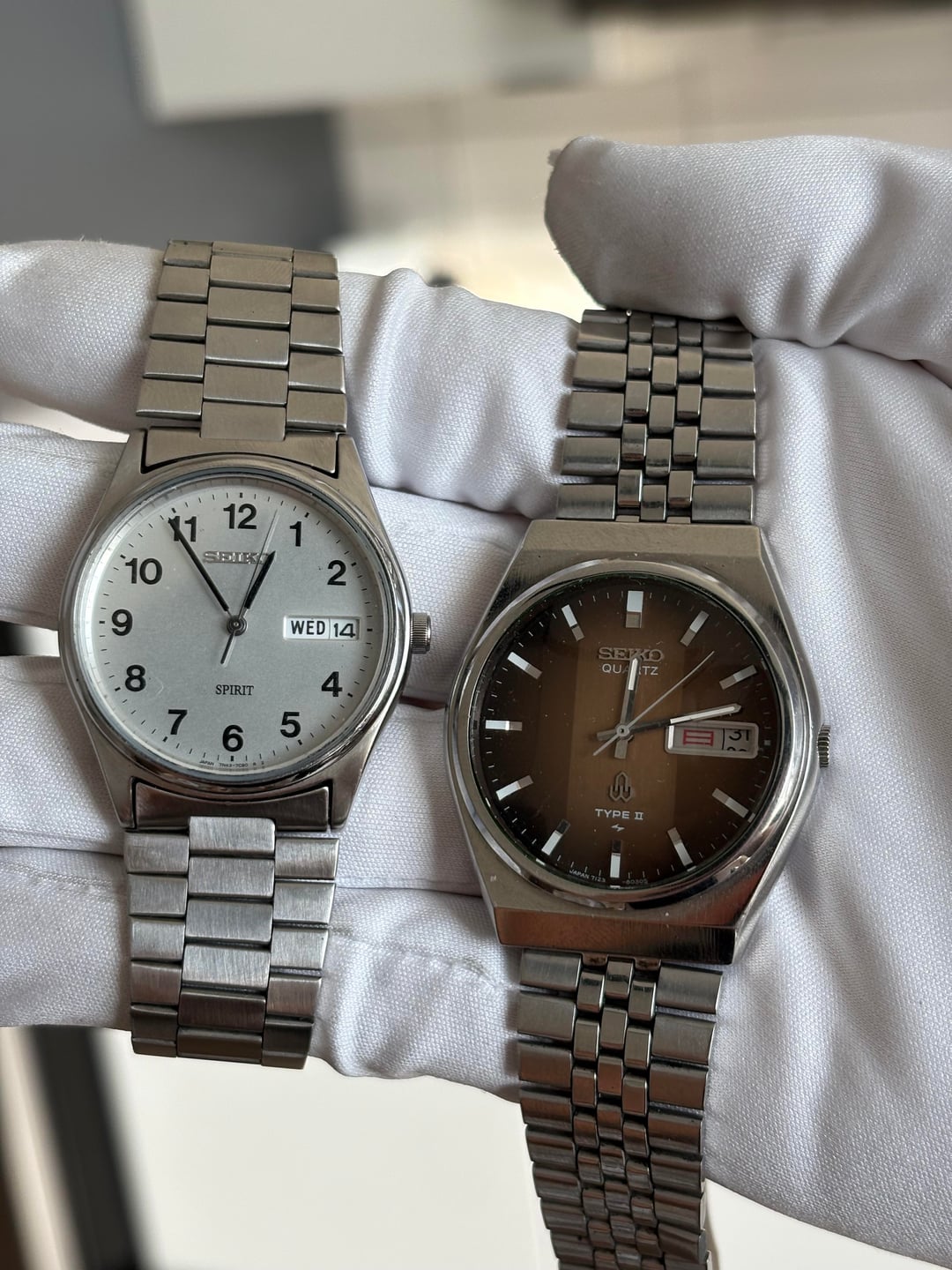 Sunday sale! Looking to sell this collection of vintage Seikos! Based in Durham, NC, USA Prices are in order of pictures from LEFT to RIGHT: Two-tone fluted Chronos 5C23-7000 - $200 Blue Charcoal Dial 7832-8010 - $200 Contemporary Basic 5H23-6890 - $200 Snowflake Chronos 5H23-7060 - $175 Box Waffle Chronos 5H23-5110 - $175 Box Chronos 7433-5080 - $175 Spirit 7N43-7180 - $130 Spirit 7N43-7B60 - $130 Spirit 7N93-7000 - $130 Snowflake Quartz 0843-8040 - $175 Silver Type 2 7546-7050 - $130 Black Silverwave 5933-701A - $100 (functions but crown is jammed) *Spirit Titanium 7N43-7150 - $130 Silver Type 2 4336-8000 - $130 *Black Type 2 4623-6000 - $130 *Black Silverwave 7546-802B - $130 Spirit 7N43-7B70 - $130 Spirit 7N48-7A00 - $130 Brown Faceted Type 2 7123-8020 - $150 Blue SQ 7122-8030 - $150 Silver Type 2 8223-6030 - $130 Blue 5 Actus 6106-7520 - $175 *Silver Type 2 8229-8000 - $130 White Roman 5Y39-8020 - $130 Silver Type 2 0903-8110 - $130 Silver Type 2 7123-8120 (ticks but time does not run) - $50 All have original bracelets unless marked* +Worldwide shipping via insured USPS or UPS I accept Zelle, PayPal FF, PayPal G&S (+5%), and Venmo I’m open to offers and bundle pricing! PM for more images and info! Thanks for looking and comment before PMing!