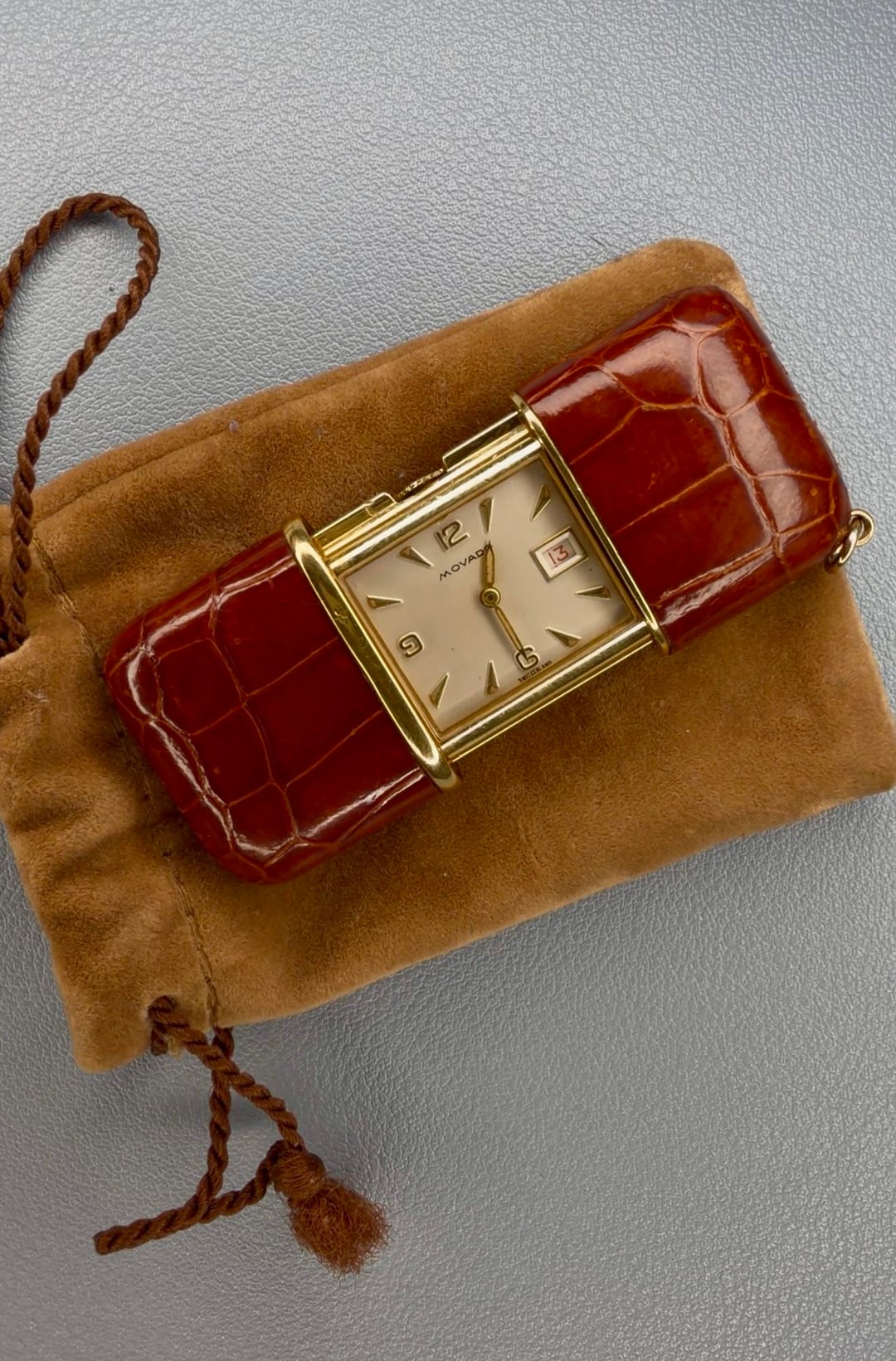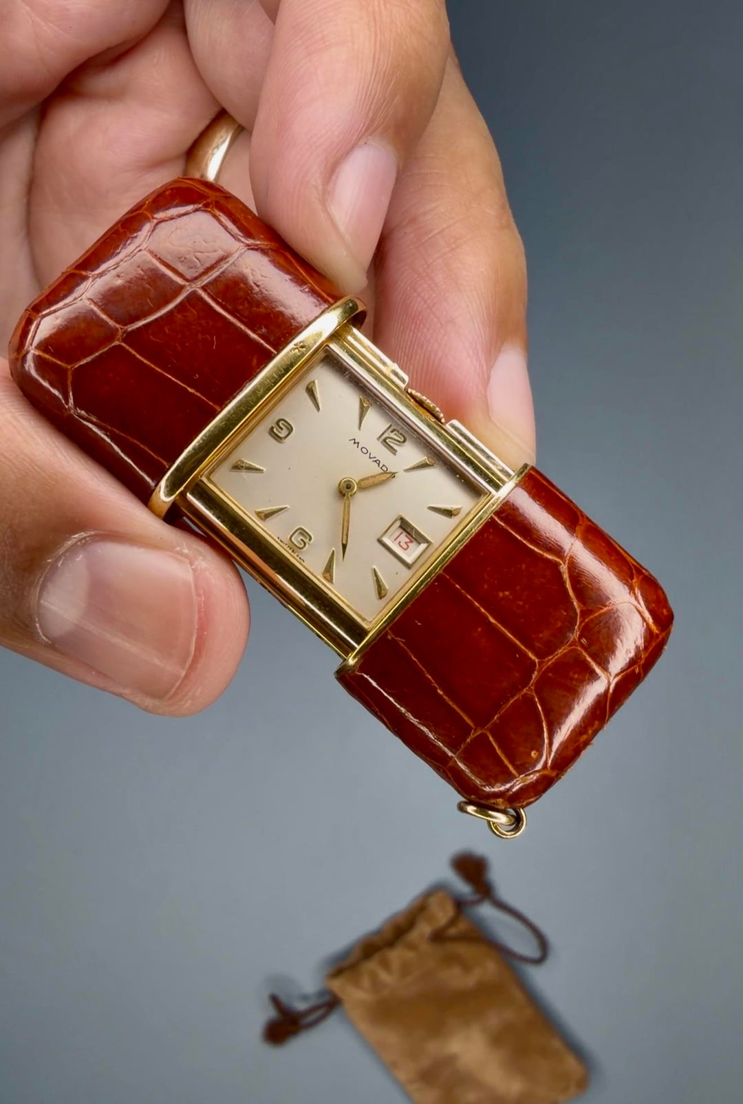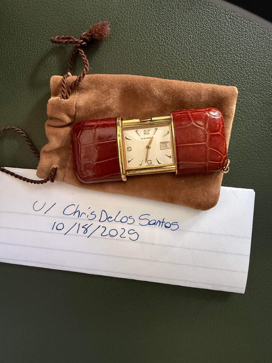 Vintage Movado Ermeto -Details: RARE vintage travel clock from the 1940’s. Needs to be serviced, ticks but doesn’t keep the time or date. Gold plated steel case, wrapped in brown crocodile leather, leather is in amazing condition given its age! Simple time and date function. To wind this gem, you open and close the case a few times or use the crown. This is a project piece, hence the low asking (Fully serviced/functioning examples range from $700 - $2,000). Feel free to watch my TikTok review linked below to learn more about this piece! -$299 USD -Includes shipping (US). I accept Venmo, Zelle, CashApp, and PayPal (+4% if using G&S) -Movement: Manual winding -TikTok Review: https://www.tiktok.com/t/ZTM5Wjqe6/ -Timestamp: https://imgur.com/a/cmVeS0b -Location: Downtown Los Angeles -IG: @ColeccionDeLosSantos -TikTok: Chris.DeLosSantos