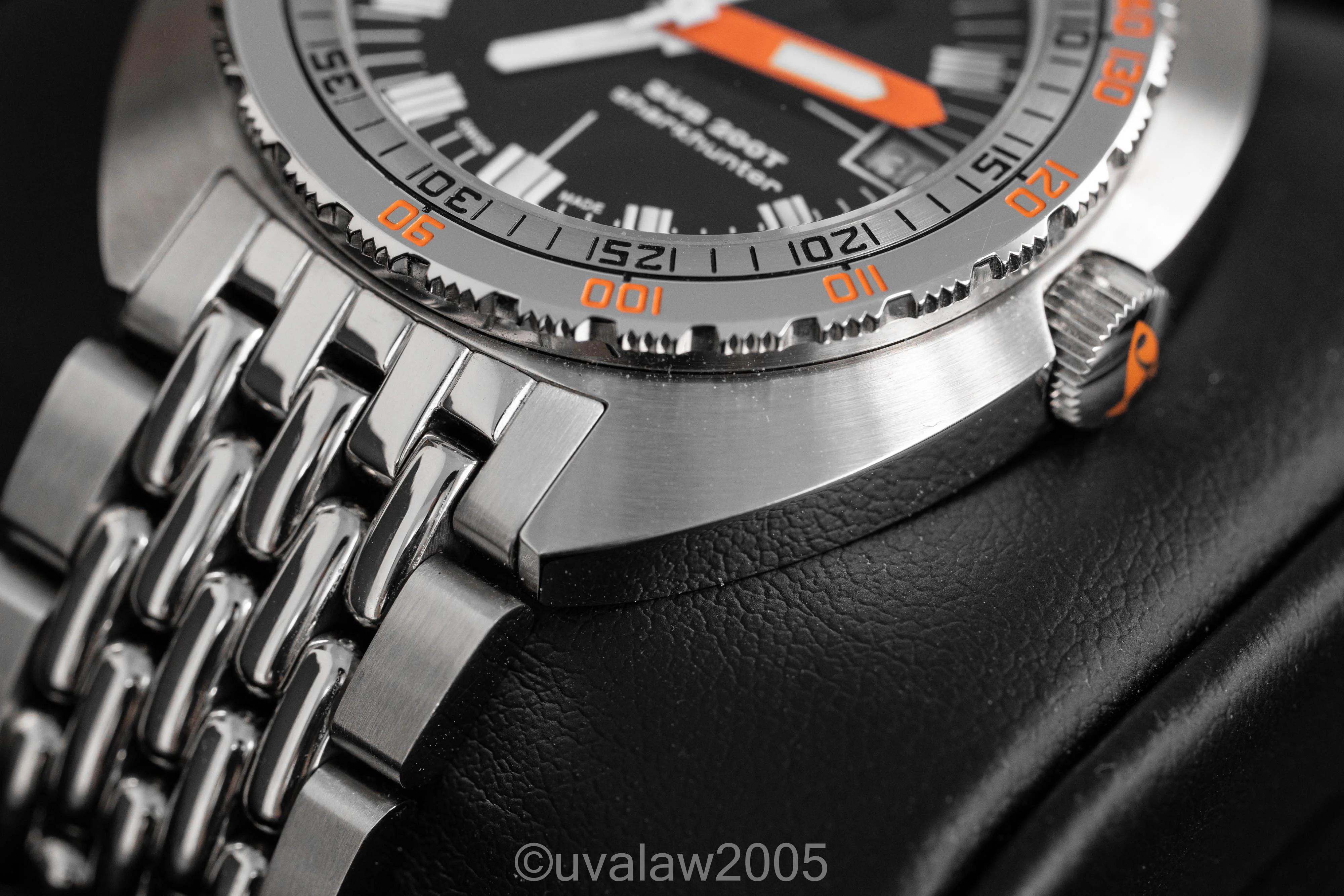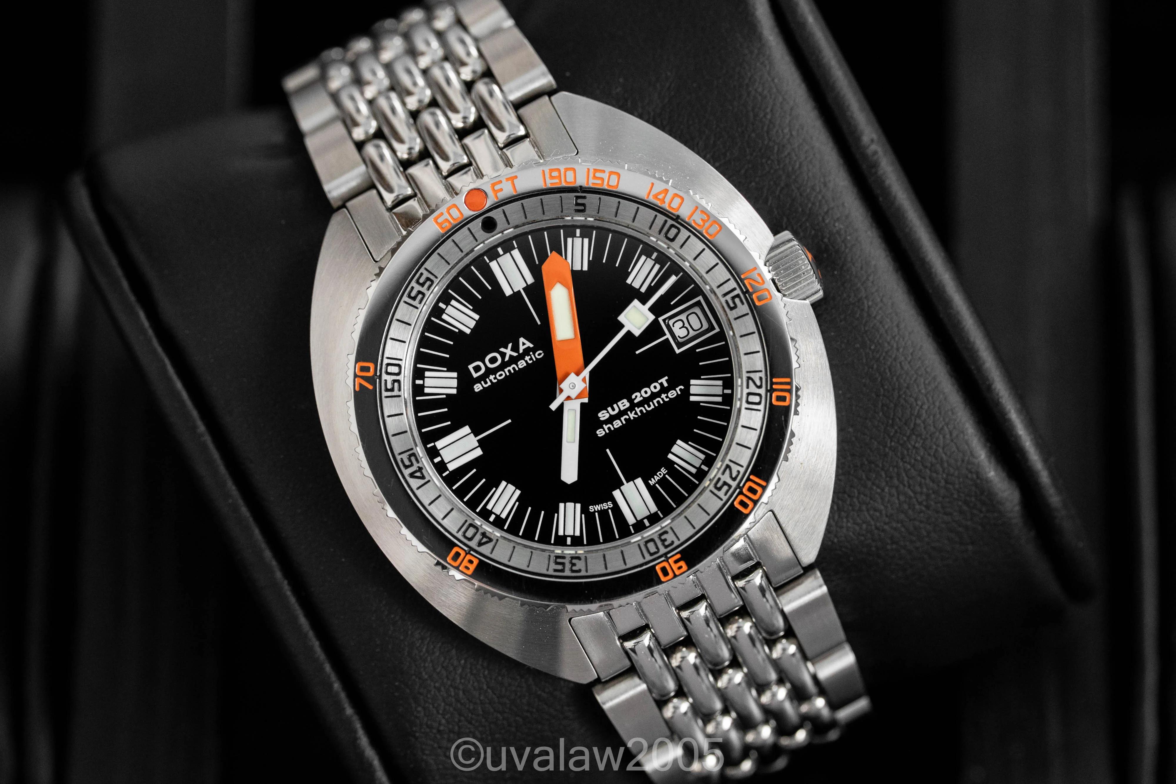For sale is my black iconic dial DOXA SUB 200t Sharkhunter on OEM bracelet. Light surface wear to the polished surfaces and clasp; bracelet has never been removed. Comes with inner/outer box, manual, hang tag, all bracelet links, original sales receipt, and two-year warranty card good through May 2026.