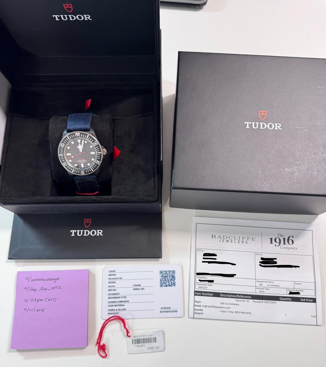Hi, everyone! Hope everyone survived the sugar rush from Halloween! 🍬🎃 Now that the ghosts and goblins are gone, here’s something *real* to get your heart racing — the **Tudor Pelagos FXD Red Bull Racing Carbon**. This watch looks *incredible* in person — ultra-light, rugged, and full of character — but it wears a bit large on my **6.75-inch wrist**, so I’d rather pass it on to someone who can enjoy it fully. Fresh timestamp just added. • **Brand:** Tudor • **Model:** Pelagos FXD Red Bull Racing Carbon • **Reference:** 25707KN • **Case Size:** 42 mm • **Year:** 2024 • **Set:** Box, original AD purchase receipt, and eBay authenticity card • **Condition:** Excellent overall — light, even patina in the bezel text between 10 and 12 (often seen on this model, barely noticeable in most light). **$2,875 shipped (CONUS)** **OBO** Fair offers welcome, but please keep it reasonable. • Payment: PayPal F&F, Zelle, or Venmo • Shipping: Fully insured USPS Priority within CONUS If you’ve been eyeing this Red Bull Racing edition, now’s your chance to grab it at a great price. Feel free to DM me with any questions or for timestamp photos. Thank you!