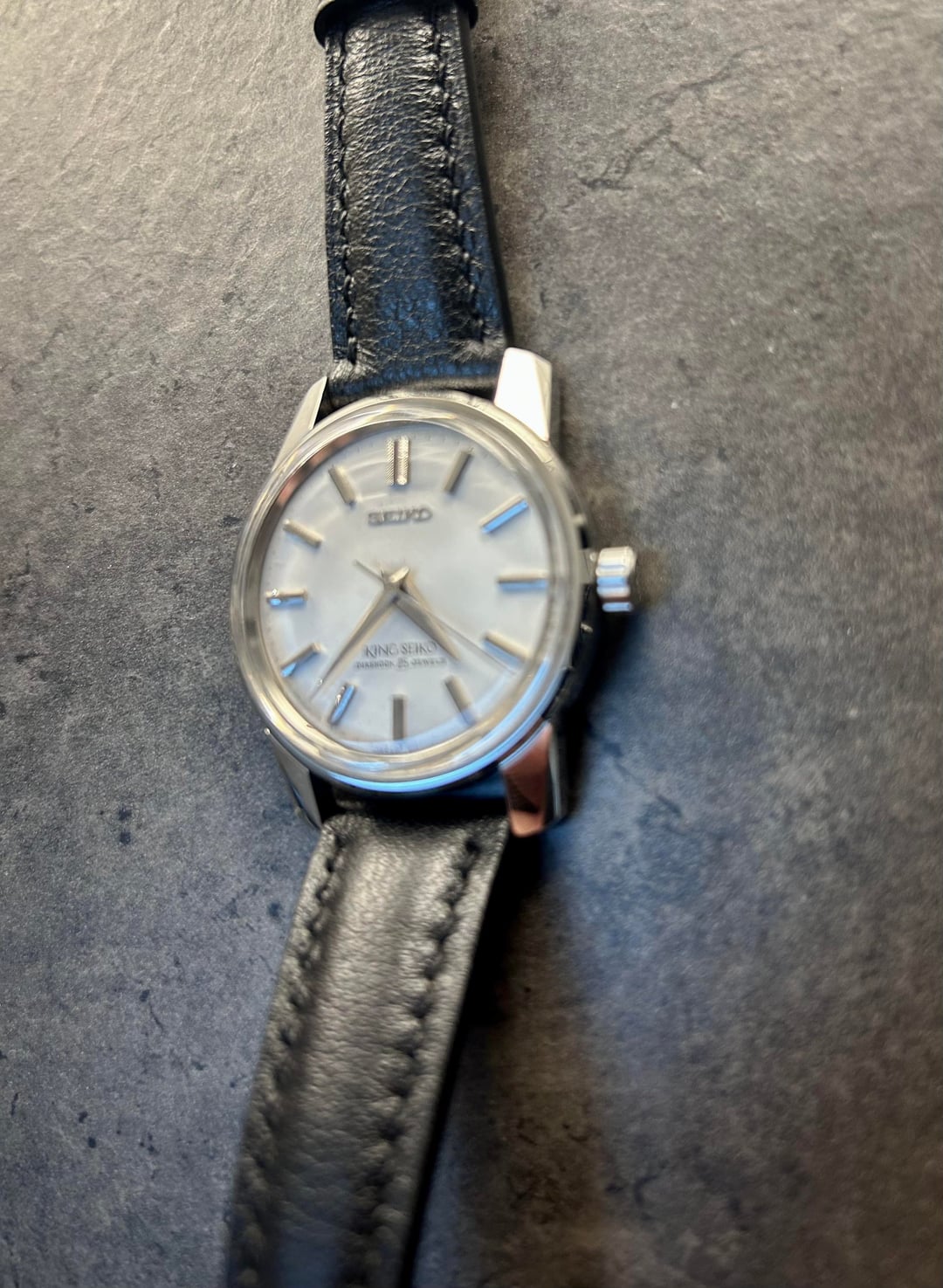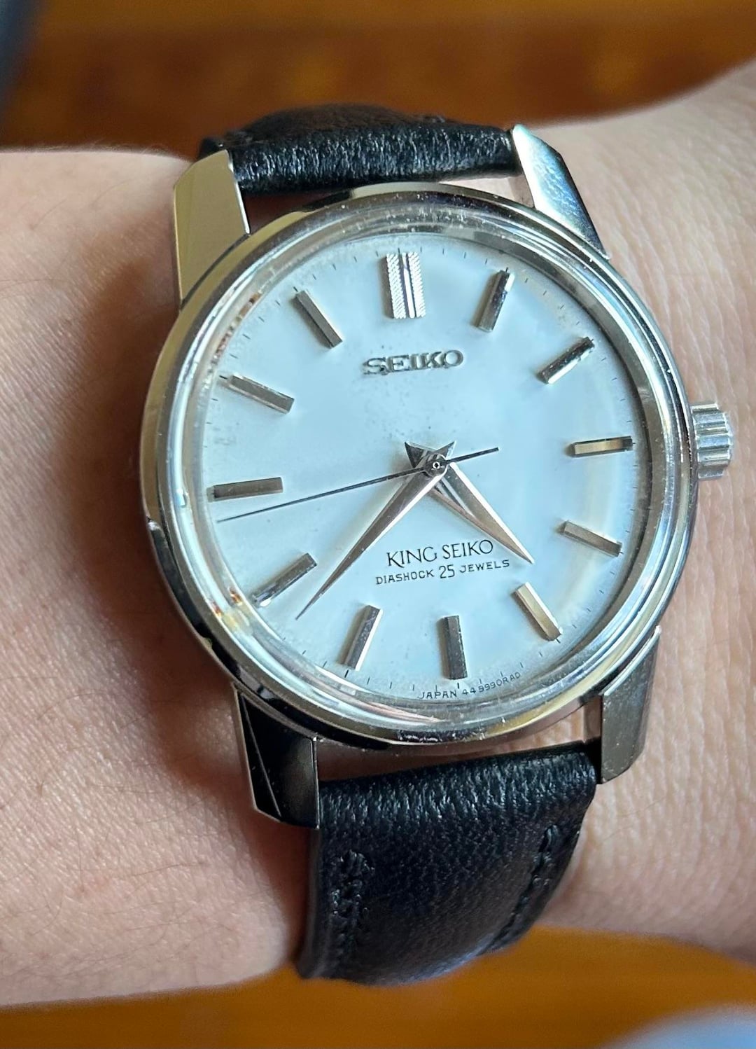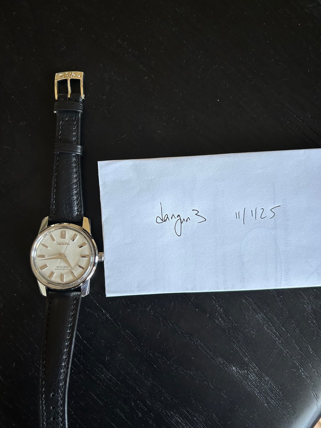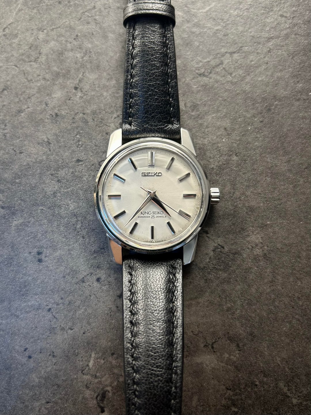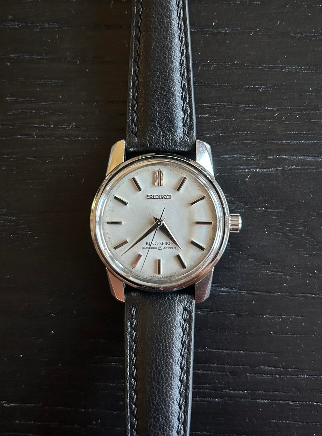 Selling my clean example of the vintage King Seiko 44-9990 — an early example of Seiko’s “Grammar of Design” era. Features the respected 44A hand-wound movement, razor-sharp case lines, and clean silver sunburst dial. Was just serviced - runs strong and keeps great time. Gold medallion on caseback is in near-mint condition. Has the updated/more reliable hacking movement. Comes with the original Seiko buckle. **Specs:** * 36.5mm stainless steel case * Manual wind 44A movement (updated hacking) * Original KS-signed crown * Case retains original sharp facets * New leather strap included **Price:** Reduced to $600 shipped CONUS (Zelle or Venmo) - located in CT if you're in the area. Thanks for looking & don't hesitate to reach out with any questions.
