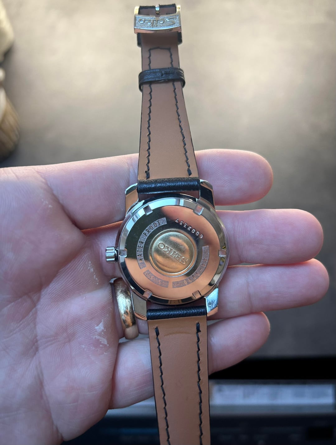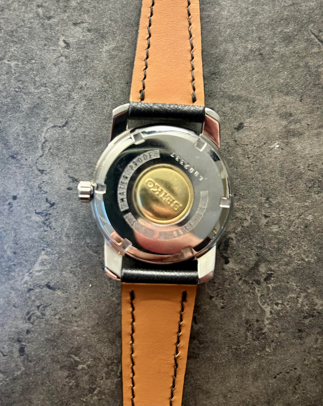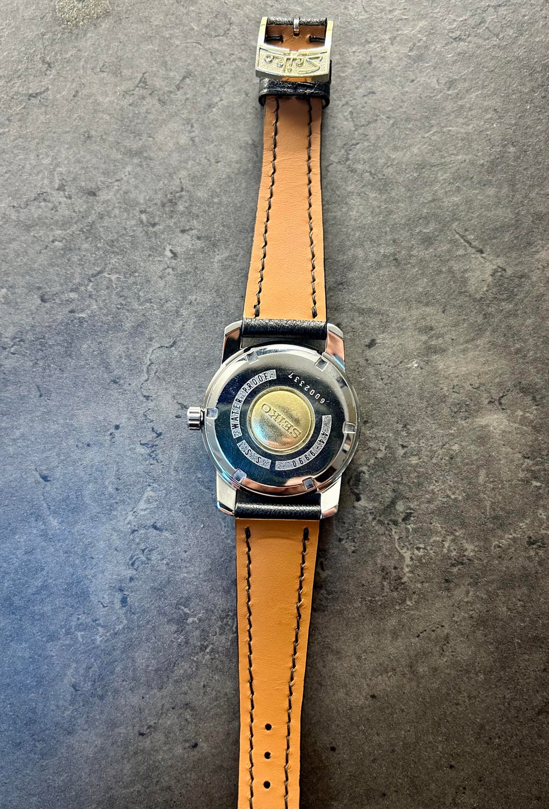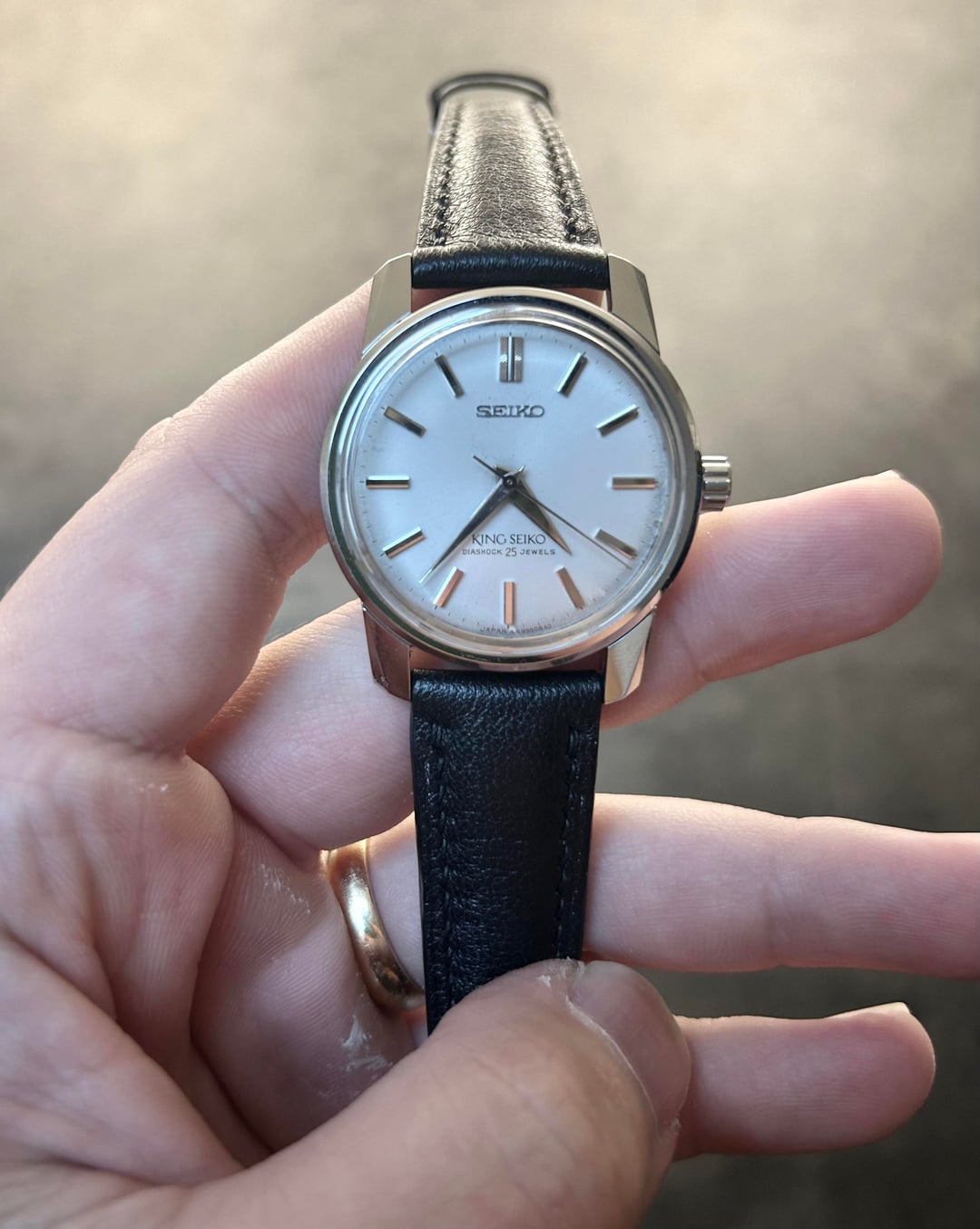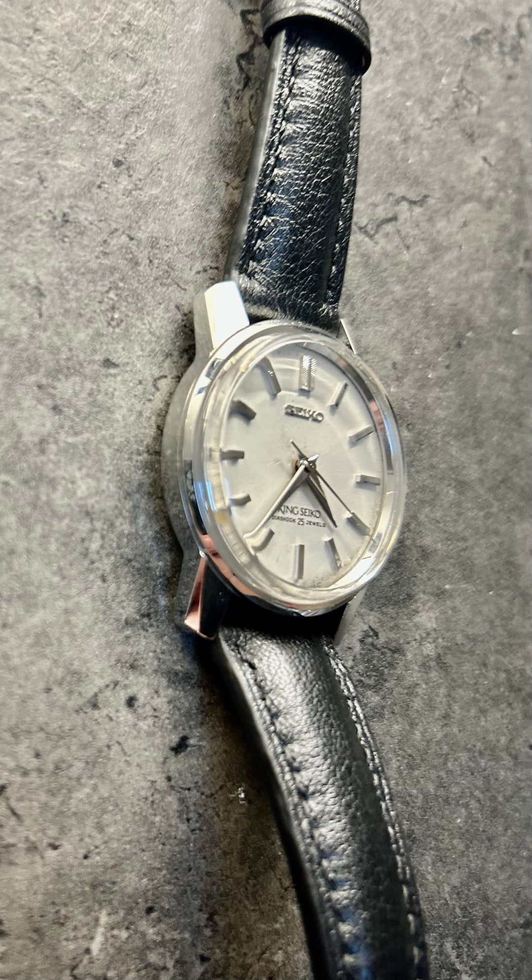 Selling my clean example of the vintage King Seiko 44-9990 — an early example of Seiko’s “Grammar of Design” era. Features the respected 44A hand-wound movement, razor-sharp case lines, and clean silver sunburst dial. Was just serviced - runs strong and keeps great time. Gold medallion on caseback is in near-mint condition. Has the updated/more reliable hacking movement. Comes with the original Seiko buckle. **Specs:** * 36.5mm stainless steel case * Manual wind 44A movement (updated hacking) * Original KS-signed crown * Case retains original sharp facets * New leather strap included **Price:** Reduced to $600 shipped CONUS (Zelle or Venmo) - located in CT if you're in the area. Thanks for looking & don't hesitate to reach out with any questions.