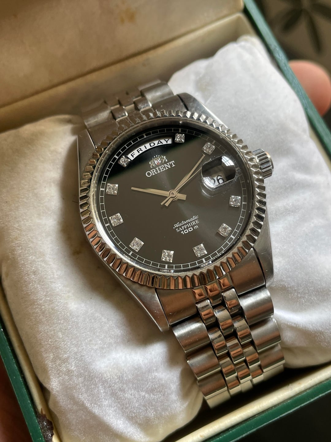 Greetings, Watchfam! Listed today for sale is this mint Orient President Day-Date in all steel with a striking black sunburst dial and faux diamond hour markers Automatic self winding movement 36mm diameter Original bracelet with signed Orient factory clasp and links supporting wrists up to 8.5 inches Runs great without any issues Comes with the Orient box Power reserve up to 38 hours once fully wound Priced to sell at 550$ with global tracked shipping Shipped via UPS/Aramex with a 4-5 working day transit No trades please Thank you