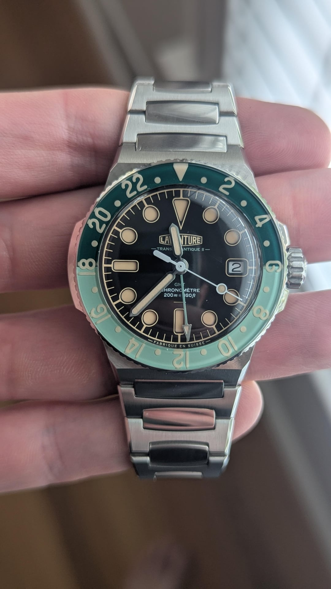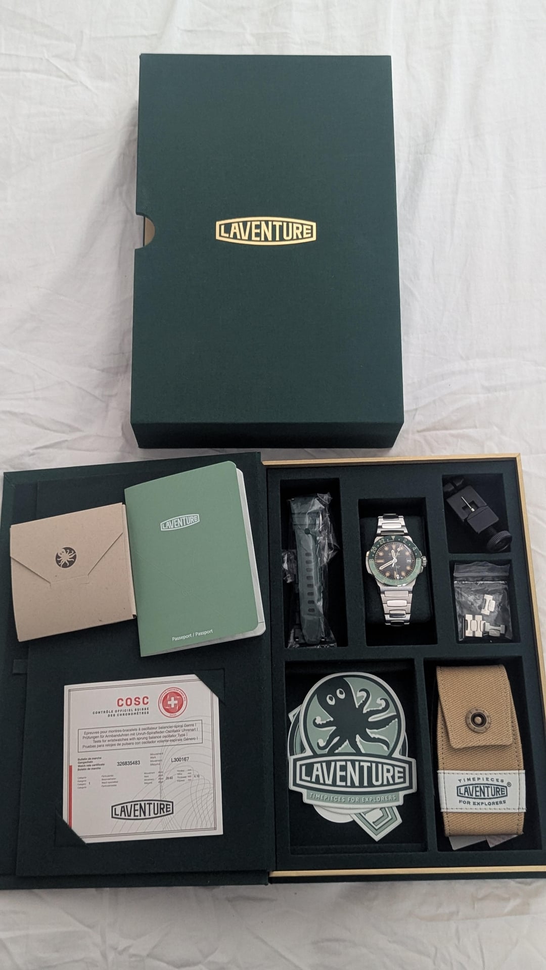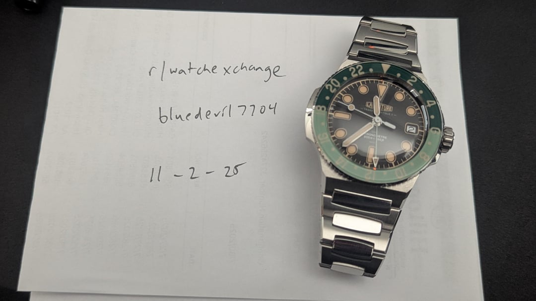 For sale is a Laventure Transatlantique II GMT. This is the newest version with the 38.9mm case. This watch feels like watches that cost $10K+. See the original website for specs and more information: [https://laventure.swiss/en/the-watches/transatlantique-ii-gmt-collection/laventure-transatlantique-ii-gmt-steel-black](https://laventure.swiss/en/the-watches/transatlantique-ii-gmt-collection/laventure-transatlantique-ii-gmt-steel-black) Condition: like new/mint. A few stickers still remain. Included is the watch, bracelet with all links, dark green rubber strap, COSC certification paperwork, bracelet sizing and spring bar tools, warranty card, travel pouch, microfiber cloth, inner and outer presentation boxes. Warranty card dated March 2025. Album: [https://imgur.com/a/yfVT1oi](https://imgur.com/a/yfVT1oi) Timestamp: [https://imgur.com/a/XRFZCRC](https://imgur.com/a/XRFZCRC) **Price: $5750 OBRO NET via PayPal or Venmo. This includes expedited shipping within CONUS. International sales accepted at buyer's expense of shipping. No trades at this time.** I have plenty of references here as a seller and buyer. Thanks for looking and message with any questions.