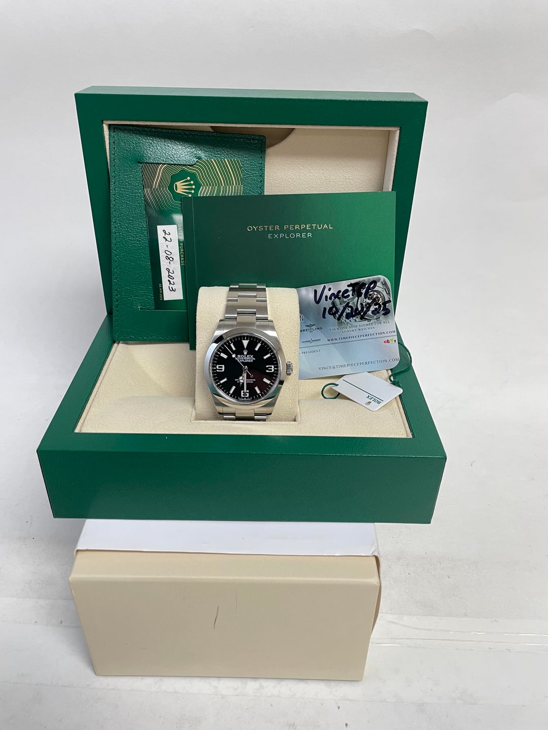 [timestaqmp](https://imgur.com/a/jflpVcQ) For sale is a mint condition Rolex Explorer I 40mm. It comes in pristine shape with only a minor hairline. It will be delivered as a fully complete set with all box, books, links, white tag, and 2023 Rolex warranty card. Asking $8400 Trades welcomed and preferred WW insured shipping Vince B Brick and mortar watch store w/ countless references since 2006 Payments in the form of bank wire or credit cards + fee’s Tax if shipped to PA/NJ/FL without resale cert