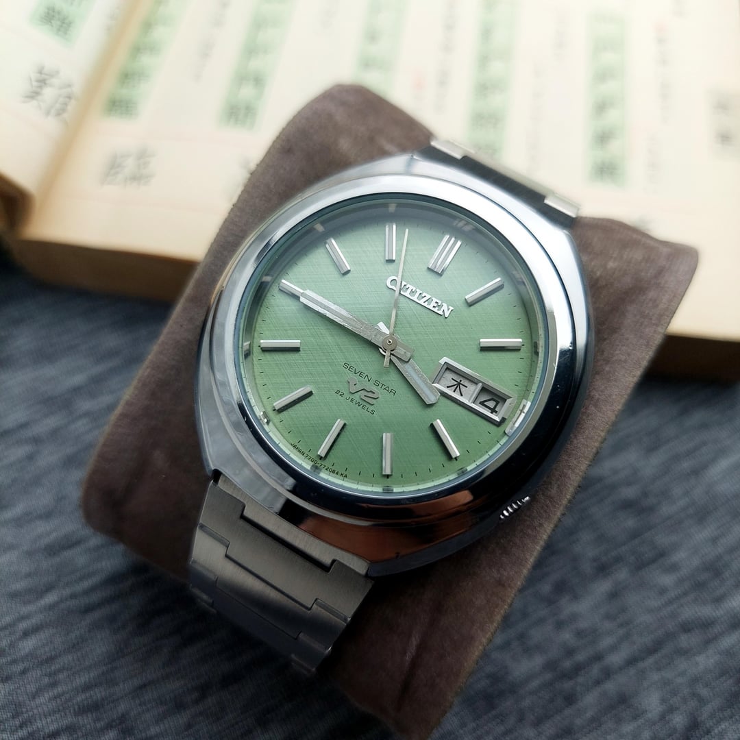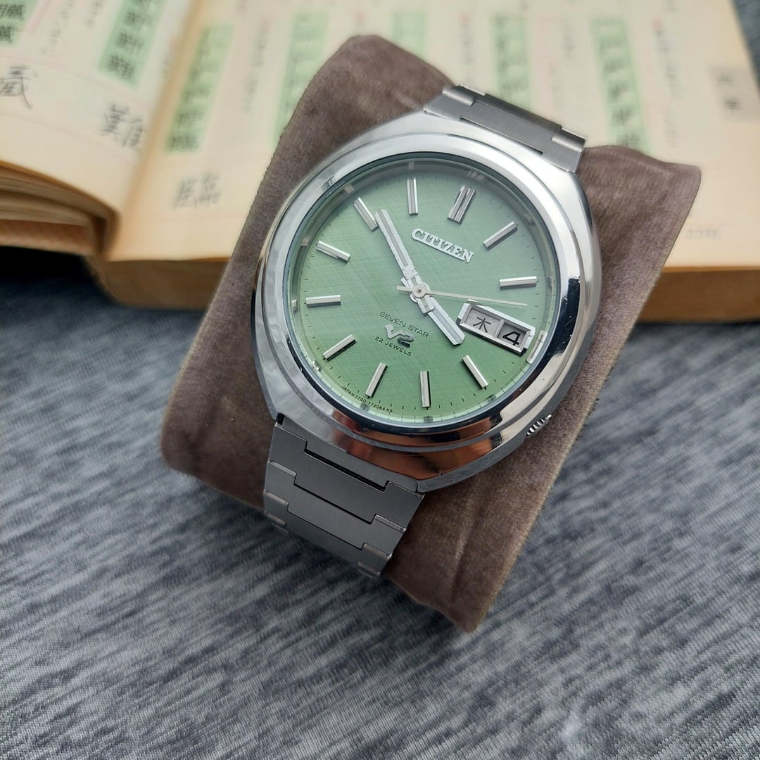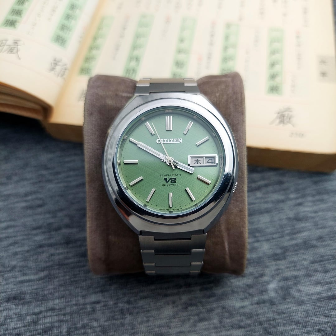 Up for sale Citizen V2 comes with beautiful light green matcha dial with linen texture which is rare to find, The watch is in good condition with time different +8 seconds in a day The watch also comes with solid after market bracelet fit up to wrist size 20 cm / 7.87 inch The Citizen V2 is a series of vintage automatic watches produced by Citizen, primarily during the late 1960s and early 1970s. The watch, particularly the Citizen Seven Star V2, was introduced around 1969. It was a successor to the original Seven Star models which used the earlier Calibre 52 movement. The watch were notable for housing the newer and improved Calibre 72 and Calibre 77 family of automatic movements. These movements typically featured a higher beat rate of 21,600 beats per hour (bph), compared to the older 18,000 bph movements, indicating a step up in precision for the time. Ref No : 4-770978-K Production year : 80's Case size: 37 mm (include crown) Lug to lug: 41 mm The case has received a gentle polish, enhancing its appearance while carefully preserving its original edge shape and the crystal is in good condition. Looking to get $250 shipped and tariffs covered for USA Payment via Paypal F&F and G&S + 4.8%. Video of watch : https://www.instagram.com/reel/DRFSGNwj_gP/?igsh=MXEwYTMzMjhqbzN2cA== for more collection please follow my instagram: https://www.instagram.com/lougeposh/ Please COMMENT FIRST before sending me a pm or chat. Tracking number (Airwaybill) will available within 3 days once payment confirmed