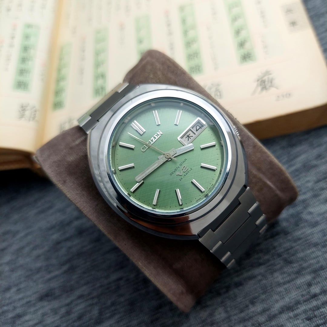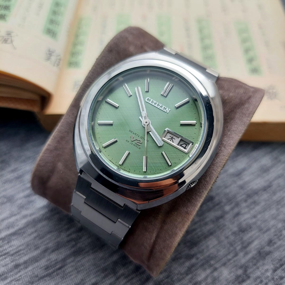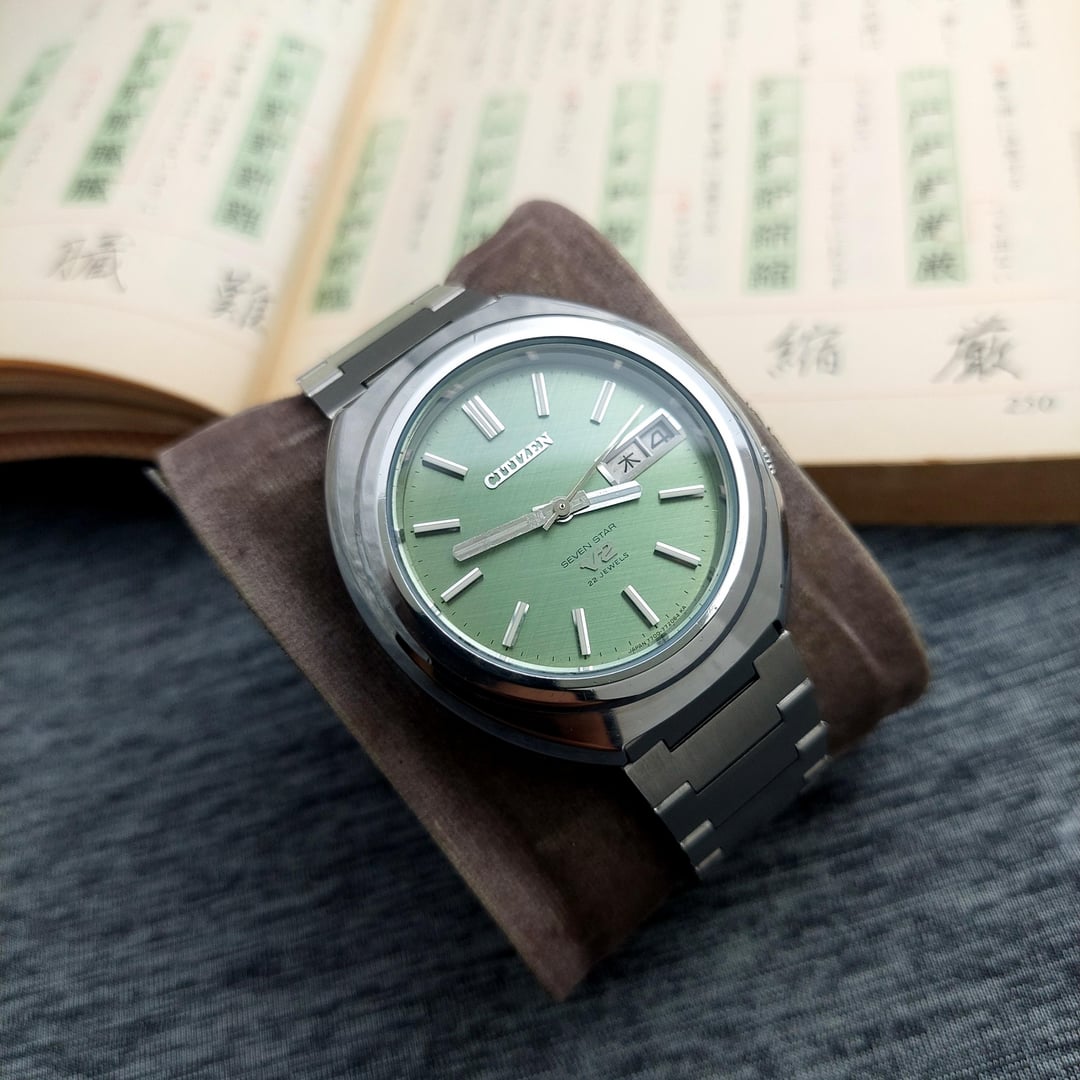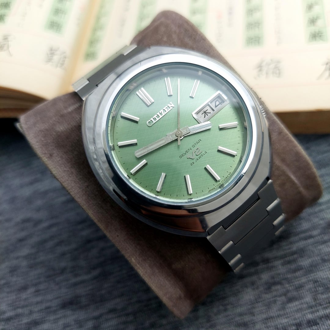 Up for sale Citizen V2 comes with beautiful light green matcha dial with linen texture which is rare to find, The watch is in good condition with time different +8 seconds in a day The watch also comes with solid after market bracelet fit up to wrist size 20 cm / 7.87 inch The Citizen V2 is a series of vintage automatic watches produced by Citizen, primarily during the late 1960s and early 1970s. The watch, particularly the Citizen Seven Star V2, was introduced around 1969. It was a successor to the original Seven Star models which used the earlier Calibre 52 movement. The watch were notable for housing the newer and improved Calibre 72 and Calibre 77 family of automatic movements. These movements typically featured a higher beat rate of 21,600 beats per hour (bph), compared to the older 18,000 bph movements, indicating a step up in precision for the time. Ref No : 4-770978-K Production year : 80's Case size: 37 mm (include crown) Lug to lug: 41 mm The case has received a gentle polish, enhancing its appearance while carefully preserving its original edge shape and the crystal is in good condition. Looking to get $250 shipped and tariffs covered for USA Payment via Paypal F&F and G&S + 4.8%. Video of watch : https://www.instagram.com/reel/DRFSGNwj_gP/?igsh=MXEwYTMzMjhqbzN2cA== for more collection please follow my instagram: https://www.instagram.com/lougeposh/ Please COMMENT FIRST before sending me a pm or chat. Tracking number (Airwaybill) will available within 3 days once payment confirmed