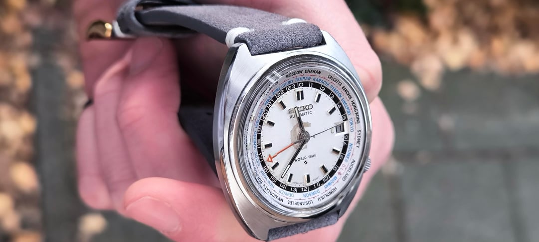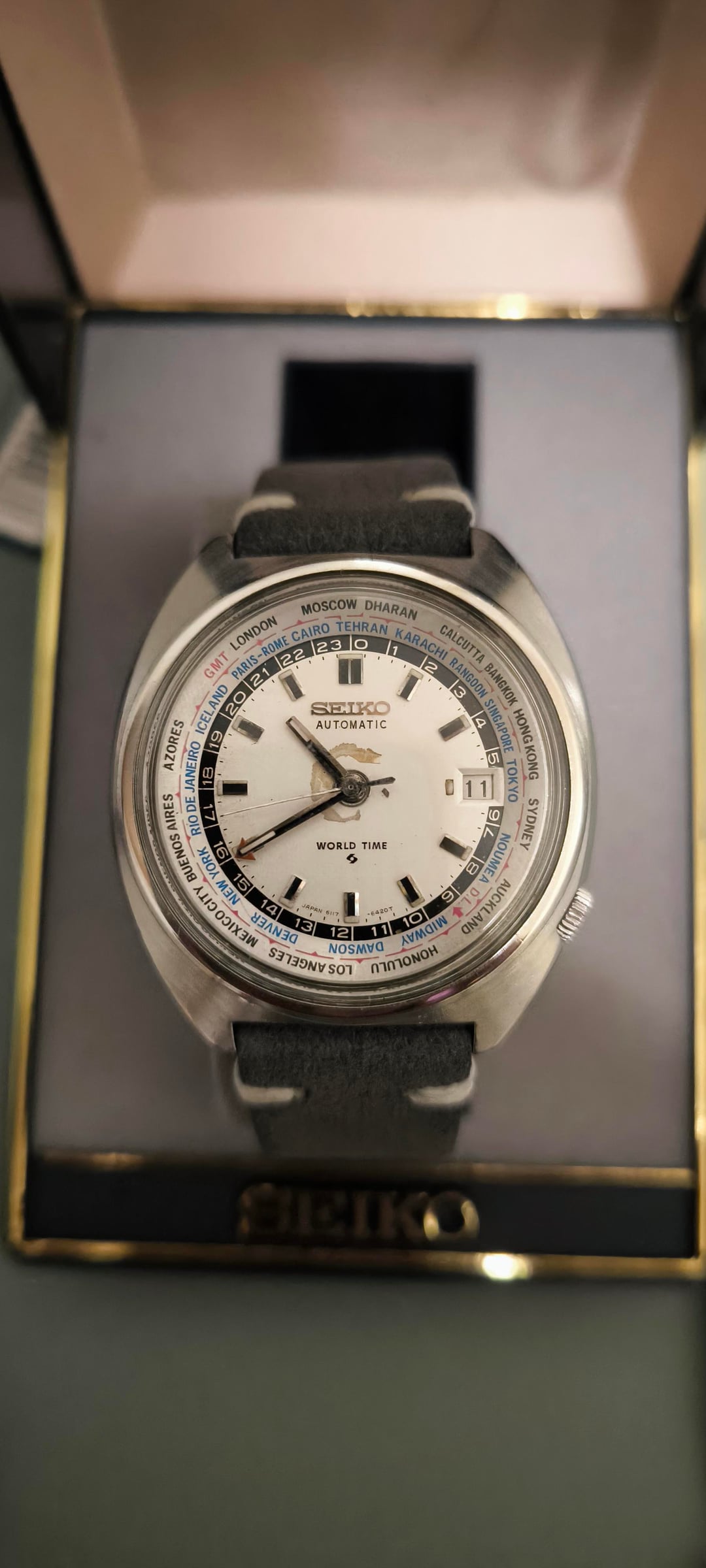 Hi everyone selling a piece of history today is the Seiko 6117-6400 World Timer from exactly 1970 (waterproof caseback + error bezel). Condition: The bad: The watch has a mark/patina/stain in the middle of the dial. The dial maintains great legibility and doesn't have any other marks besides the big one in the middle (no fading of the lettering on the dial or the bezel). The watch has some very slight/light hairline scratches from normal use. The Good: The case is in superb condition especially considering its age(55+ yr old) with no deep scratches, marks or dents and still has its sharp edges.Then crystal is without marks or scratches and so is the bezel that shows no signs of fading. Also good: the dial is only stained in the center the lettering and such is spotless. An ideal dial for a touch-up by a professional. Functionality The watch uses automatic winding and has no trouble winding and is keeping good time and all functions like date change, GMT and rotating the bezel operate without any issue or flaw. Forgot to add the photos of the movement: https://www.reddit.com/u/Ezodan/s/B3aFwlxwzs History: This specific watch dates back to august 1970 and because of this still has 'WATERPROOF' on the caseback, watches from 1971 and later have 'water resist(ant)' due to changes in (US) regulations at the time. That's not the only historical thing about this watch, the watch has the world timer bezel known as the 'error bezel' , an intended error though, London and GMT are placed beside each other instead of on top of each other. This is due to an experiment with British standard time that lasted only a few years. Replacement (not Seiko) dials: There are replacement dials available, they are great and almost look exactly like the real thing. In fact if you look at recent sales on ebay and what is for sale you will quickly notice most of the watches being sold have a fake Seiko dial, some saying nothing about it, others pretending it's a re-painted original dial. These can be easily spotted if you know the 1 minor flaw they all possess: This model (6117-6400 white dial) has a dial with the dial code 6117-6420 , the dial code 6117-6400 is the dial code used exclusively for a black dial (and the non-seiko white replacement dials as you just learned or already knew of). I'm selling it with the original dial for the buyer to decide whether they want to keep it original or maybe professionally clean it up (or get a replacement). I personally kinda liked the spot on the dial but it's priced low enough to get a replacement dial with it and still be below market. $379 shipping and insurance is included in the price. Payment: PayPal F&F or G&S for anyone with at least 1 transaction/reference on watchexchange (+4,3% fee for the buyer). Shipping: Worldwide with tracking, signature for delivery and insurance (FedEx to the US). Items will be properly packaged, waterproofed and treated with extreme care. Location: The Netherlands, Europe, local pick-up also available.