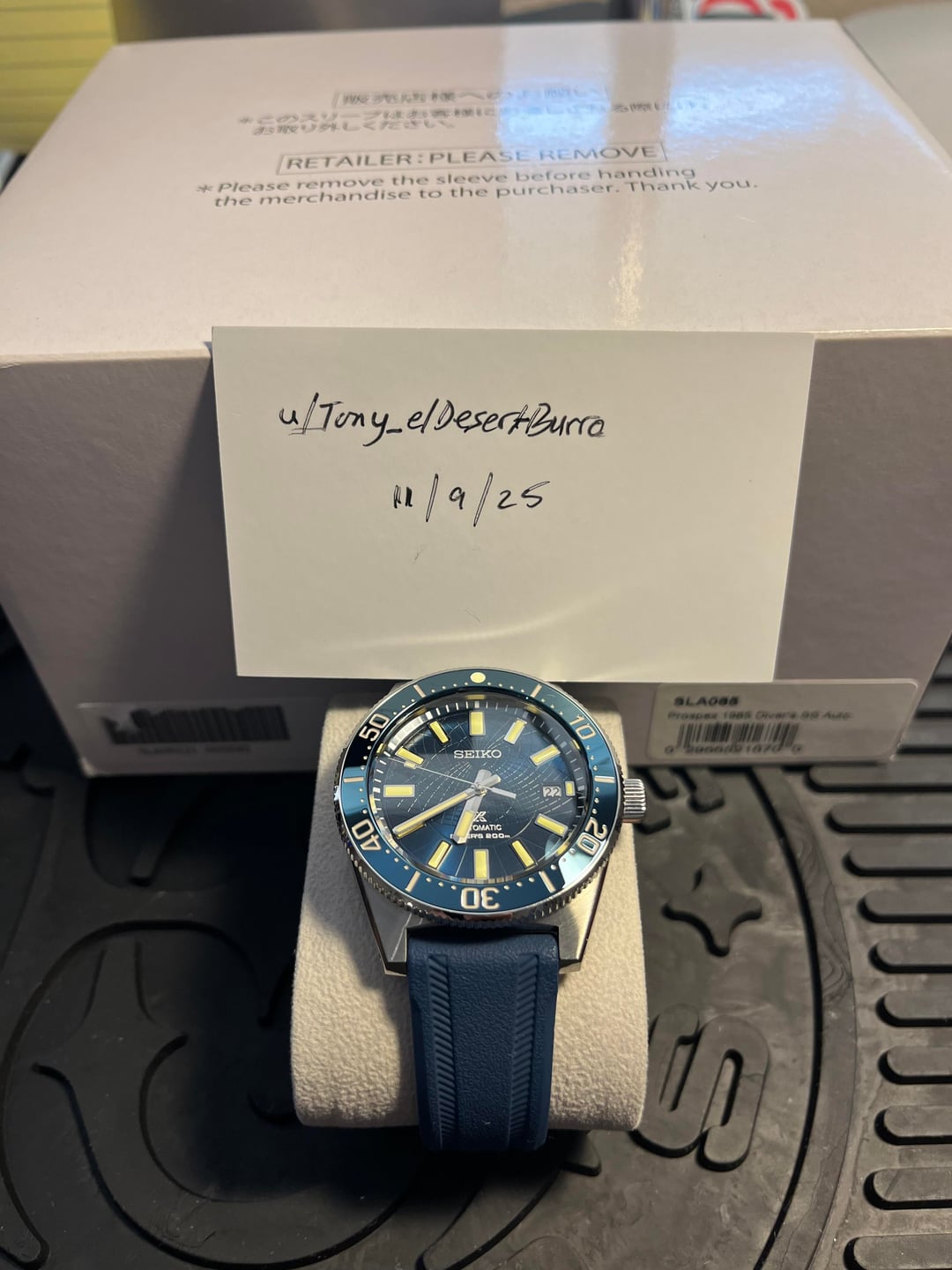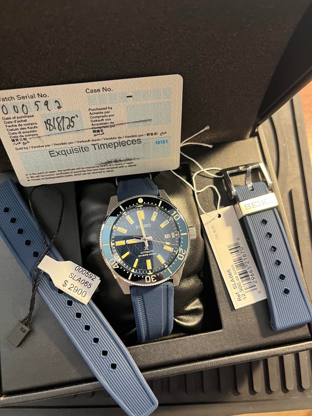 Seiko Prospex SLA065 “Save the Ocean” limited edition modern re-interpretation of the 62MAS. Condition: 9.5/10 Includes full kit, inner and outer box, outer sleeve, tags, warrnty card and booklets, original silicone strap (unworn but stickers removed), and an extra Seiko silicone strap shown in photos. Case dimensions: 41.3 mm dia., 13.1 mm thick, 47.6 mm lug to lug, 20 mm lug width Movement: 8L35 Limited to 1300 pieces (592/1300) Photo Album: [https://imgur.com/a/XICZzhq](https://imgur.com/a/XICZzhq) Timestamp: [https://imgur.com/a/aCxiQ75](https://imgur.com/a/aCxiQ75) From the Seiko Luxe website: "The caliber 8L35 26-jewel automatic movement, hand-assembled at Seiko’s Shizukuishi watch studio with the increased torque necessary for smooth operation of the enlarged diver’s watch hands, beats at a frequency of 28,800 vibrations per hour, with a power reserve of approximately 50 hours, and provides manual winding capability. Created for scuba diving to depths of 200 meters, this superbly functional watch, in stainless steel with fine Zaratsu polishing, also includes a date calendar, LumiBrite markers and hands for enhanced legibility, dual curved sapphire crystal with anti-reflective coating on the inner surface, screwdown crown and caseback, blue uni-directional rotating elapsed timing bezel and blue silicone strap. As part of Seiko’s “Save the Ocean” campaign, a portion of the proceeds from sales of this exceptional Limited Edition will be contributed to marine conservation. Packaged in a Limited Edition collectors’ box". Price: $1550 includes FedEx shipping within CONUS only, payment via Zelle, bank wire; PayPal for established WatchEx users. Open to an in-person cash transaction if you're in Southern California. No trade offers, please.