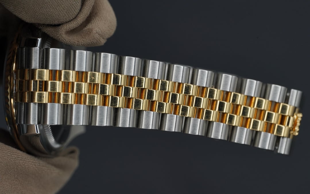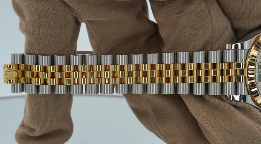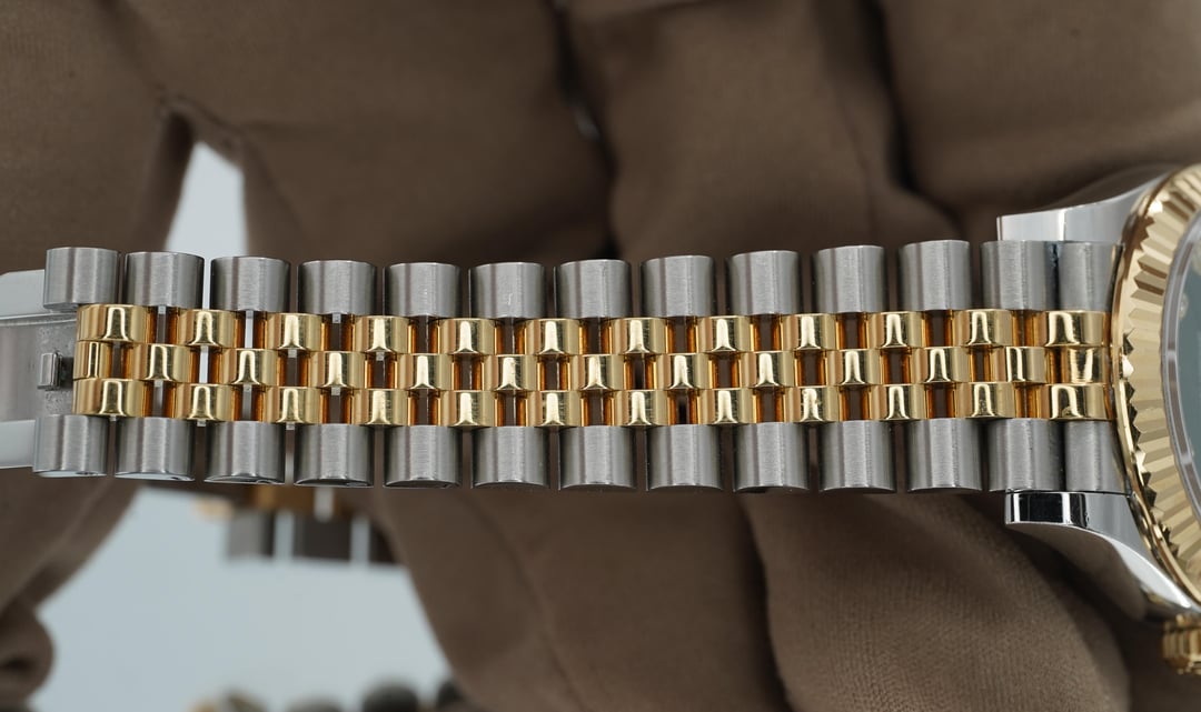 | ROLEX MENS DATEJUST 18K GOLD STEEL GREEN DIAL WATCH w/ FOLDED JUBILEE BRACELET purewatches (4871) |