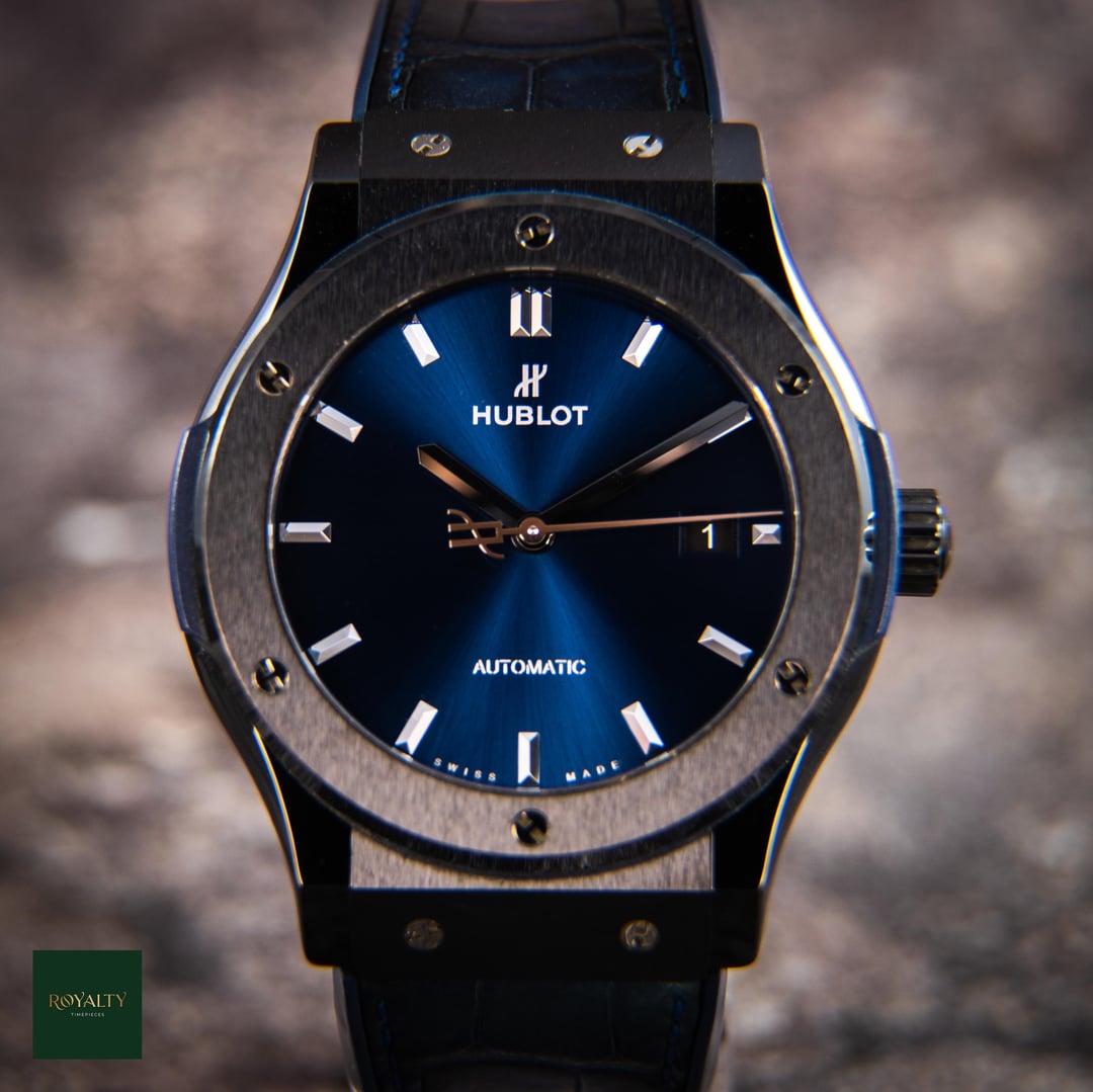 Hublot Classic Fusion Ceramic Blue Dial 542.CM.7170.LR Case: 42mm Condition: This timepiece is in excellent condition and presents beautifully, showing barely any signs of wear. It has been meticulously cared for by its previous owner. The sapphire crystal is flawless, and the ceramic case and bezel are clean. The watch is running well and all functions operate as intended. Accessories: This offering is a complete package for the discerning collector. The sale includes: * **Hublot Classic Fusion Ceramic** **542.CM.7170.LR** * **Original Hublot Box** (Please note: The box is experiencing some flaking on the exterior, which is very typical for Hublot boxes of this era. The interior remains presentable for storage.) * **Original Hublot Warranty Card** * **Original Hublot Instruction Manua**l * This watch **comes on its original Hublot blue crocodile leather strap** with a ceramic deployant clasp. Discover the Hublot Classic Fusion Ceramic 42mm, reference 542.CM.7170.LR. This timepiece is a masterful expression of Hublot's "Art of Fusion" philosophy, brilliantly blending traditional watchmaking elegance with cutting-edge, modern materials. The Classic Fusion strips away the excess to reveal a watch that is timeless, sophisticated, and undeniably Hublot. Its sleek black ceramic case offers exceptional scratch resistance and a lightweight feel, while the captivating blue sunray dial provides a stunning pop of color. This watch is not just an accessory; it's a statement of refined taste and modern luxury. $7️⃣5️⃣0️⃣0️⃣ + 🏷️ MSRP: \~10.2k Shipping available to anywhere in CONUS. Shop with confidence, many references available and authenticity guaranteed! NY residents subject to sales tax without resale certificate IG: royalty.timepieces Timestamp: [https://imgur.com/ZMHmEm5](https://imgur.com/ZMHmEm5)
