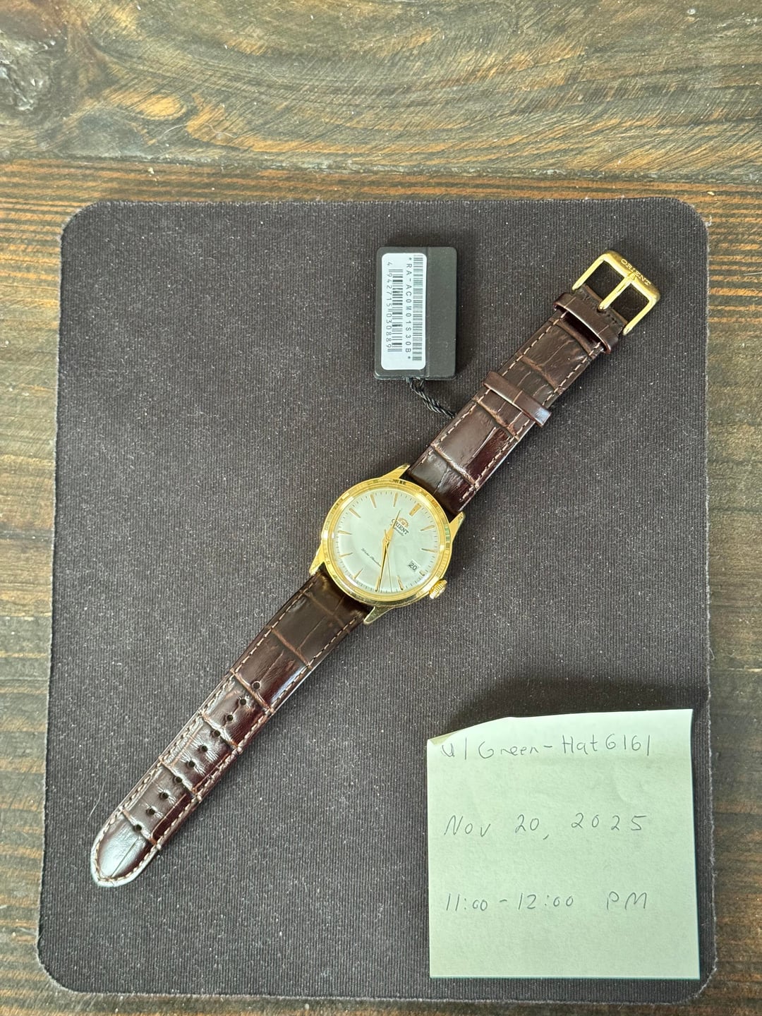**Orient 38mm Bambino Classic RA-AC0M01S10B** * Nice size of 38mm - Gold Tone Orient Bambino * Watch is in NM, never worn out of the house, keeping great time * Original box, hangtag and booklet included * Strap never worn… signed clasp in great shape Asking $150 - PayPal FF or Venmo Free USPS Shipping from USA east coast to 48 contiguous states only I’m downsizing and selling several watches, check my posts for more... *Thanks for looking!*