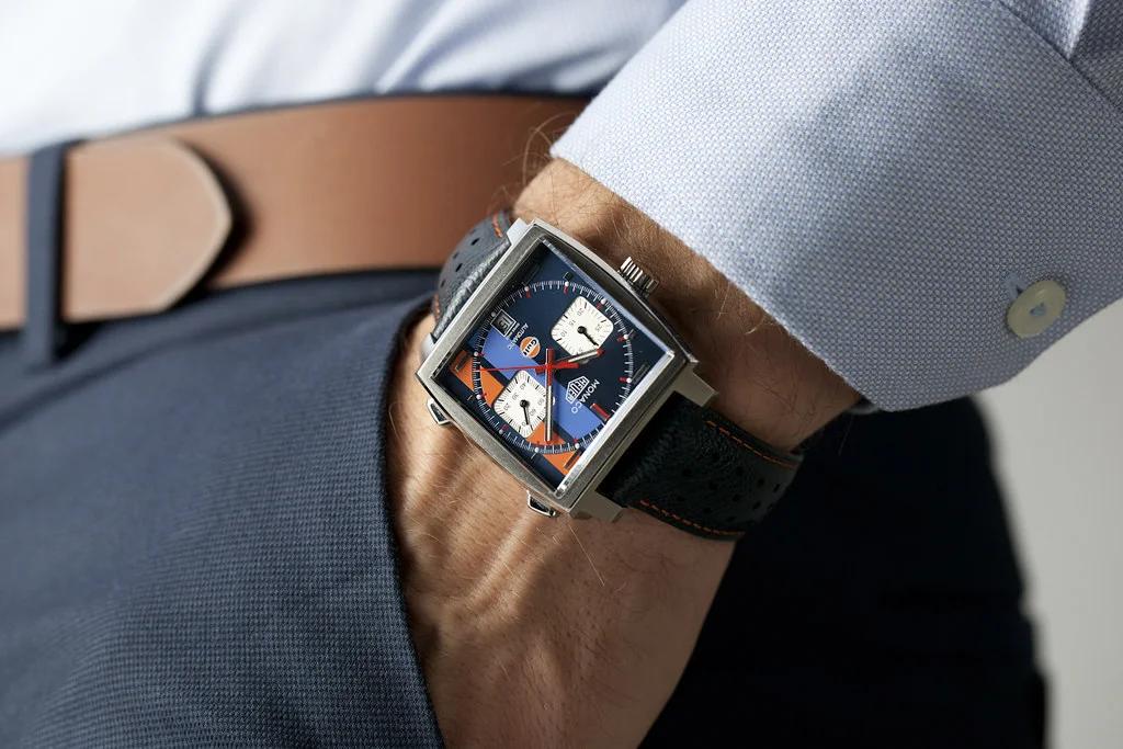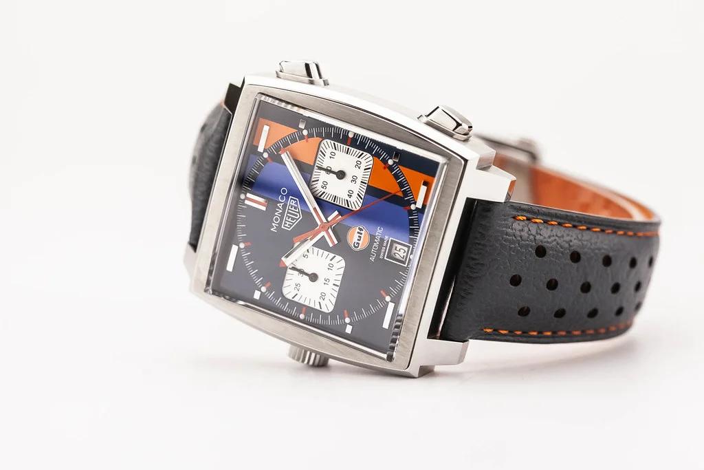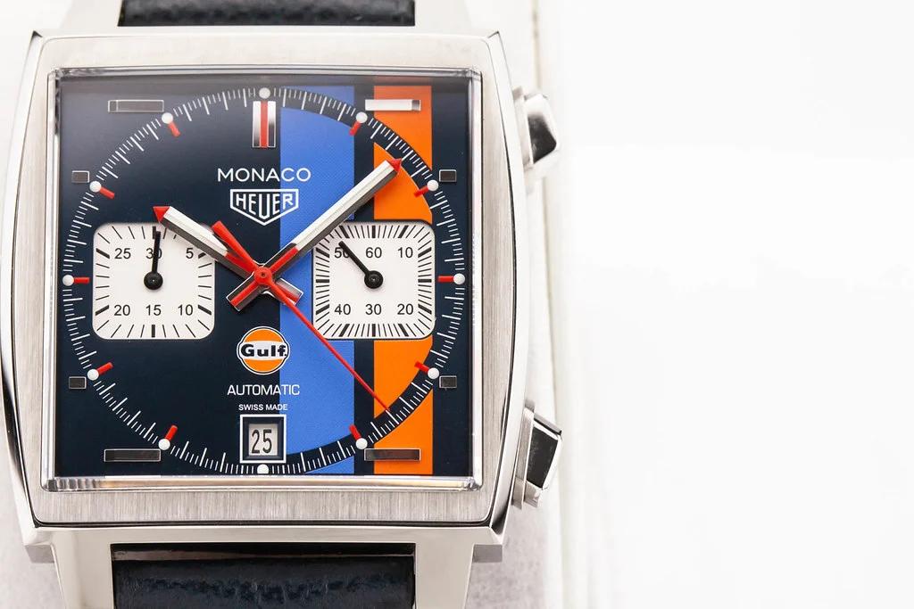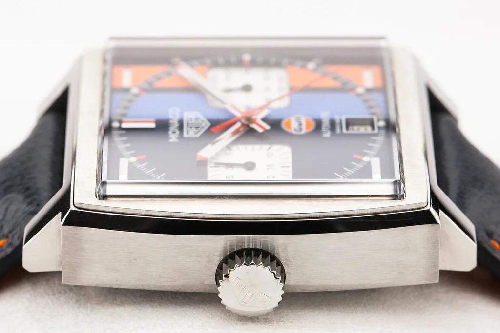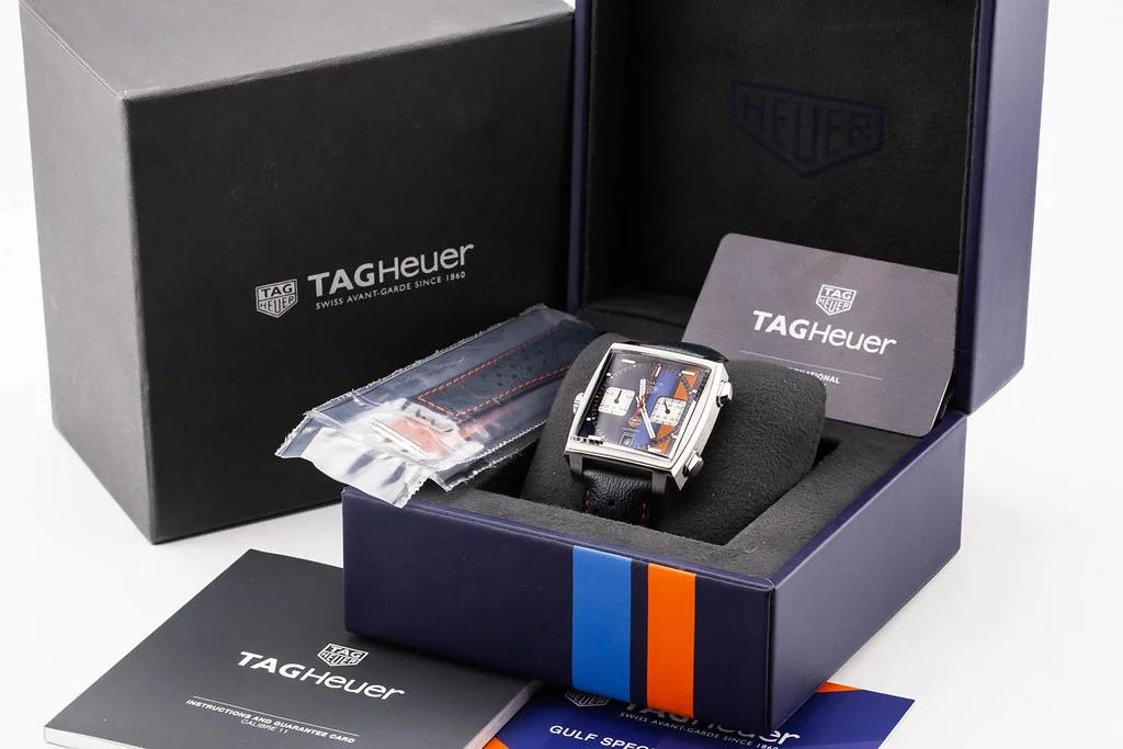 Up for sale is a mint condition Tag Heuer Monaco Gulf Special Edition, reference # CAW211R.FC6401. It comes complete with all boxes, papers, booklets, extra OEM strap and Tag Heuer Warranty Card dated October 2020.
