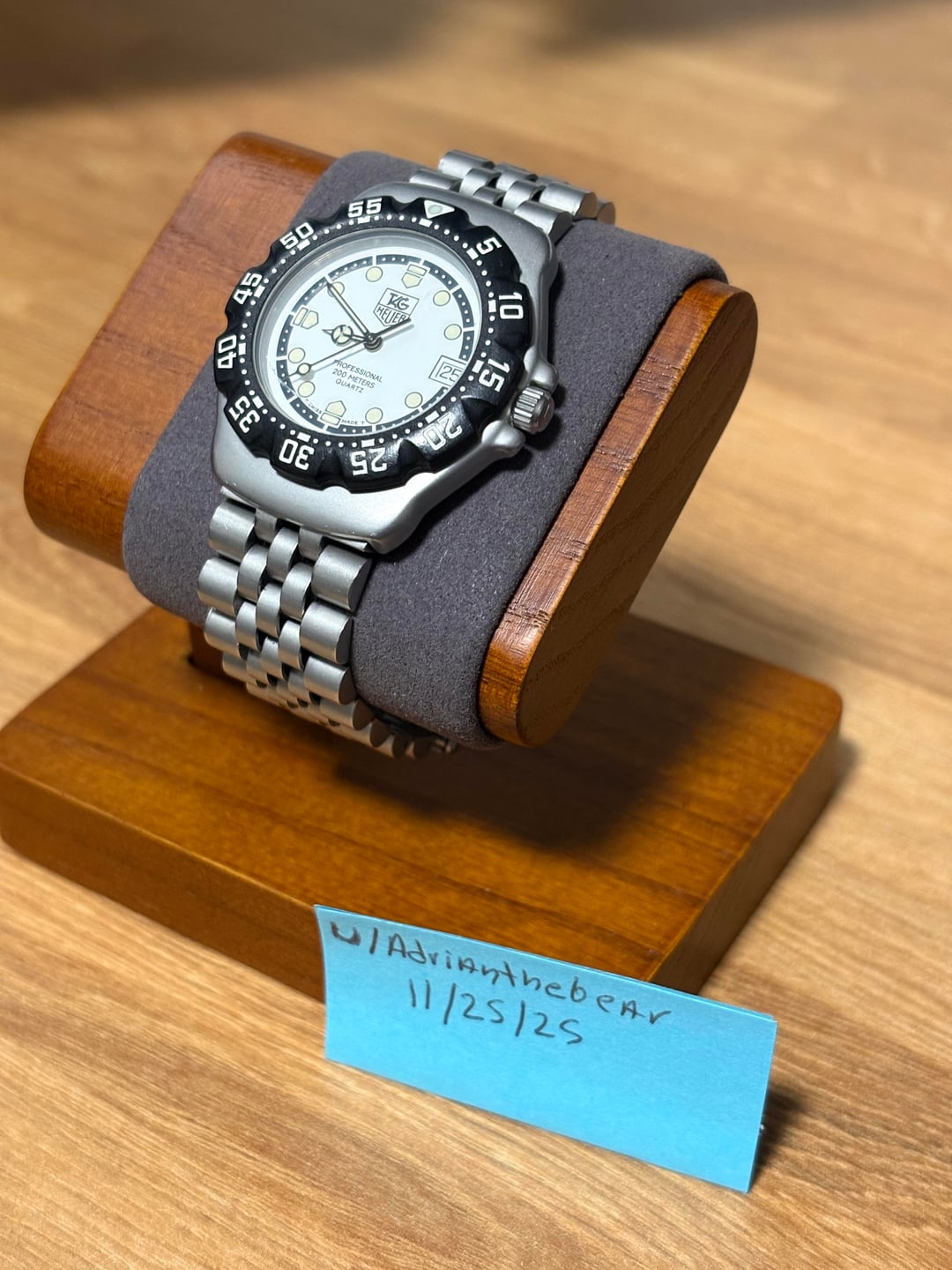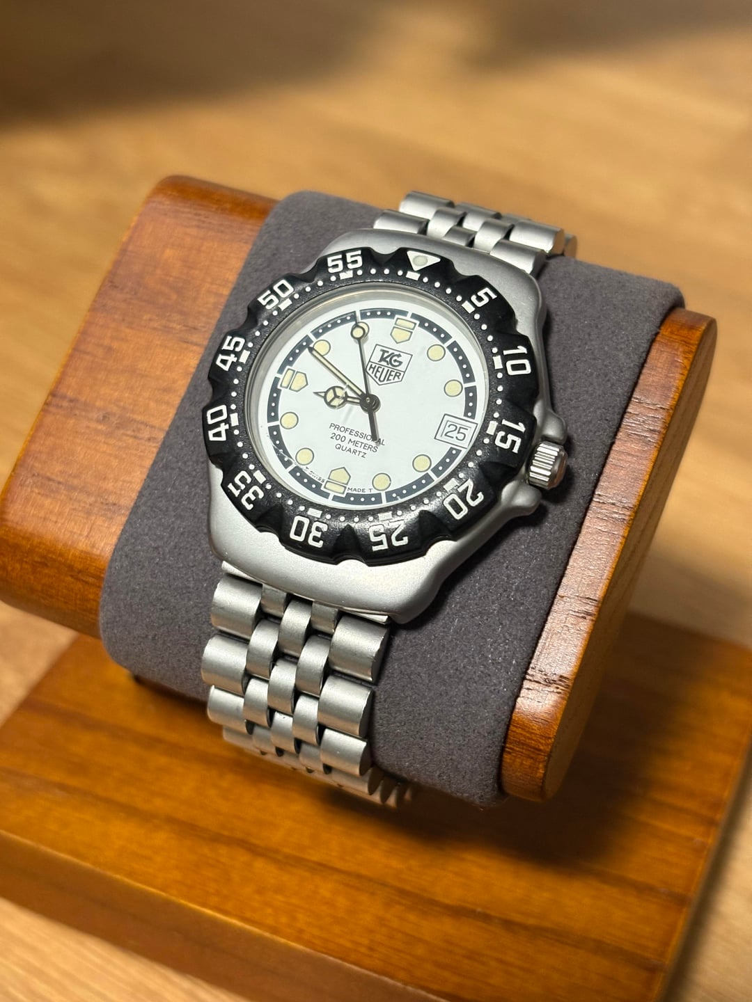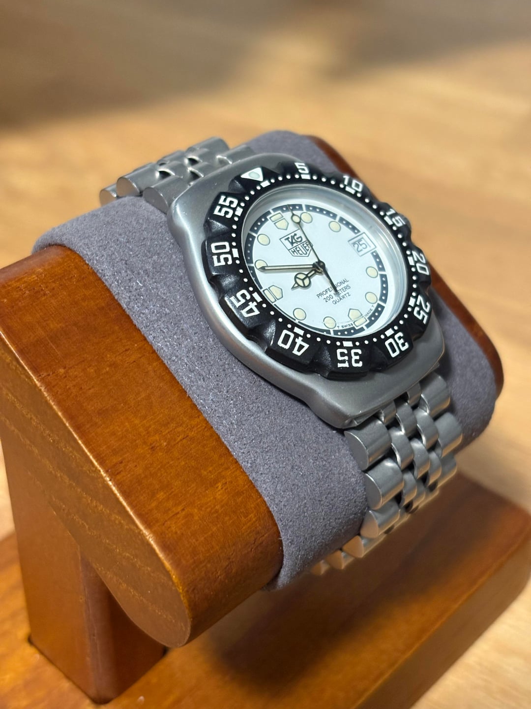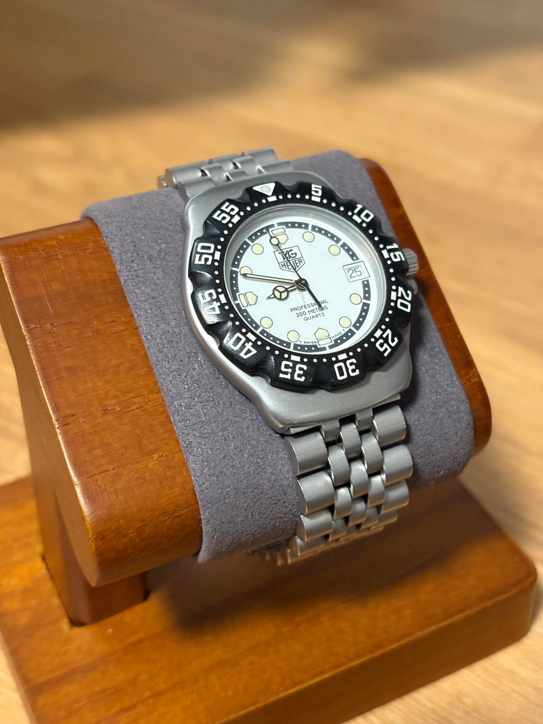 Hi WatchEx, For Sale: TAG Heuer Formula 1 – Vintage 200M Quartz (White Dial / Black Bezel) Selling my vintage TAG Heuer Formula 1 200M quartz diver in excellent overall condition. This is a clean, original example with the highly desirable white dial and black bezel configuration. The bezel is in great shape with crisp numerals, and the lume pip is intact and bright — rare for these models. The crystal has a single very light hairline scratch that’s barely visible and only noticeable under certain lighting angles. The original jubilee-style bracelet shows some normal wear but is overall in great vintage condition. The bracelet currently fits a 7-inch wrist without the deployable clasp. With the clasp installed, it should accommodate roughly 8–9 inches. Watch will come with a Tag Heuer box. Specs: • Model: TAG Heuer Formula 1 Professional 200M Quartz • Case Size: 35mm • Movement: Swiss Quartz • Dial: White with luminous markers • Bezel: Black uni-directional dive bezel (excellent condition) • Lume: Strong, with an intact lume pip • Crystal: Mineral (light hairline scratch, barely visible) • Bracelet: Original TAG Heuer jubilee-style stainless steel (shows normal wear) • Water Resistance: 200m • Condition: Excellent vintage condition – bezel and lume are great, bracelet clean, crystal hairline only visible at certain angles Price: $510 shipped within the Us