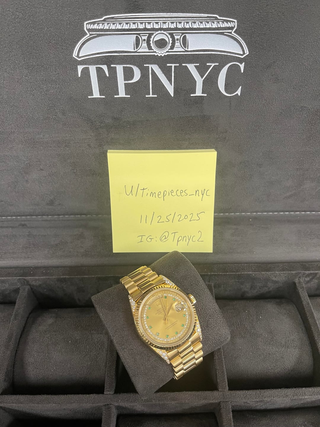 Price: $28,000 Shipped Watch: Rolex Reference Number: 18338 Comes With: Watch Only Condition / Specifics: This emerald string dial Daydate is in preowned clean condition with minor hairline scratches throughout. The crystal contains line marks on it that are really only visible when viewed upclose. The watch fits between a 7-7.25 inch wrist and the year is 1991. As always please reach out with any questions prior to purchasing! Additional Notes: • Pictures Accurately Display Condition, So Please View All Photos • Watch Currently Runs (Service History Unknown) • FREE 2 Day Insured FedEx Shipping • NO RETURNS, All Sales Are Final! We Accept: Bank Wire Transfer, Zelle, Crypto TRADES ARE ALWAYS WELCOME !!! Additional ways to contact us: Corresponding on Reddit can be a pain sometimes. If you have further questions and need another way to connect, you can visit our website tpnyc2.com or Instagram @tpnyc2! Reddit Followers Get Free Overnight Shipping and $50 Off This Purchase! (Only Applies If You Don’t Negotiate And Buy For Full Price)