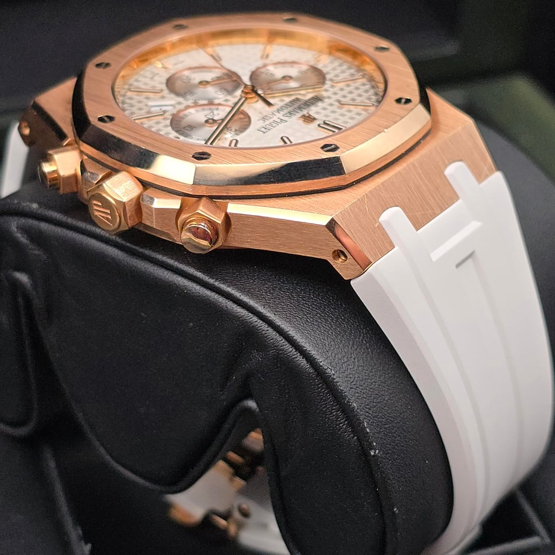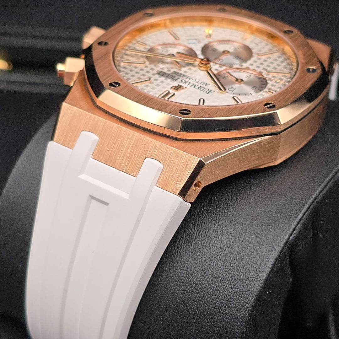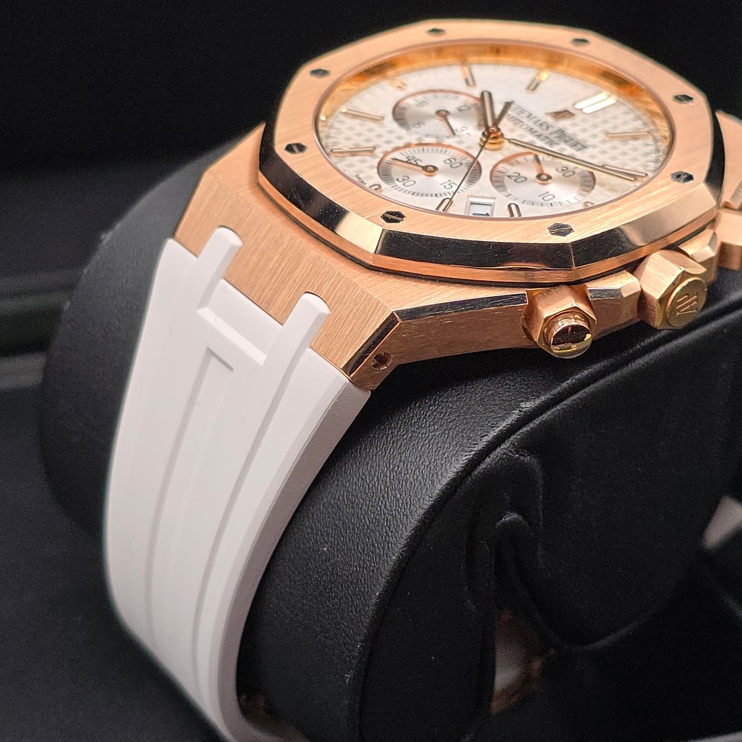 Up for sale here is an incredible timepiece. This variant of the AP Royal Oak Chronograph is made from solid 18k Rose Gold and sports a silvery white dial- perfectly paired with the white RubberB strap! The original leather strap and gold connecting lugs are included. Ref. 26320OR. Comes with the box and AP archive papers. Asking price is $43,750 **All watches sold by us come with a 1 year warranty on movement, case, and bracelet functionality.** We have been trading luxury timepieces since 2017 and operate out of the southeast United States. Accepted forms of payment are wire transfer, trades for other watches, or crypto +2%. Turn your digital coins and memes to IRL assets! After payment has been received, we ship out promptly using Fedex Priority Overnight, fully covered by a private insurance company. Packages are sent to a Fedex Office or Ship Center to be held for pickup. Armored carrier or personal delivery will be arranged for pieces valued over $150k. More pictures or video available on request! Plenty of references available, so deal with confidence! We pride ourselves on customer service, communication, and will do what you need to make this a comfortable transaction. Most brands and models of luxury timepiece are accepted on trade. Rolex, Audemars Piguet, Patek Phillipe, Richard Mille, Hublot, Panerai, Zenith, Breitling, Vacheron Constantin, F/P. Journe, A. Lange & Sohne, etc. I can do cash either way or multi-watch trades for the right deal! Check out our other listings on mechanical-art . com