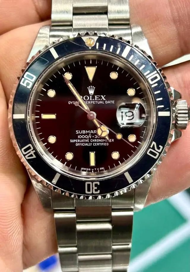 Hi WatchEx I always thought this was going to be one of my Forever watches, but bathroom remodel or watch that I don't wear often? I opt for the remodel. Recently serviced Rolex Submariner 16610 and running strong. This has the T<25 dial with the tritium indices and hands showing a beautiful, creamy patina that many watchmakers now mimic with a "faux" application. I included a side by side pic with my friend's newer Sub for comparison.Condition is vintage. Please see pics for condition. But please take note of the scratches on the bezel. Full set: * Warranty Certificate * Inner display and outer Box * Papers * Extra link * Rolex anchor * Calendar card. * Card holder There is a slight musty smell with the box and papers. Watch smells like a watch. When it comes to my $10k+ watches, I prefer to do Face to Face meet ups in SF. Will happily meet at a Rolex/ Rolex repair shop in SF where you can authenticate and inspect on your dime if you choose. Otherwise, wire or Zelle to reputable members. Thank you!