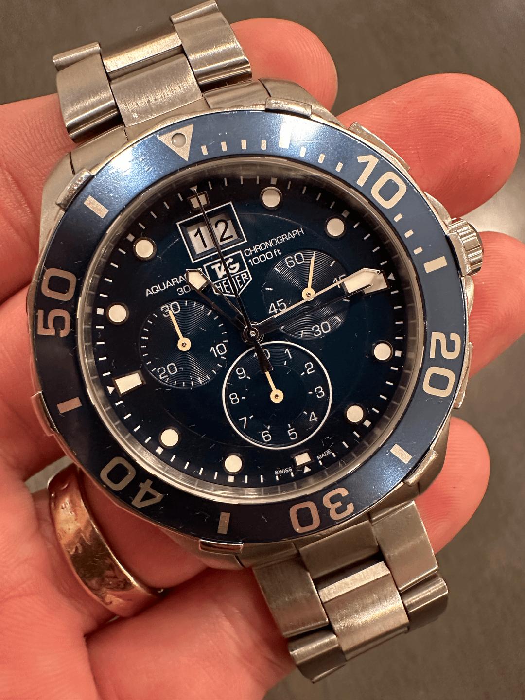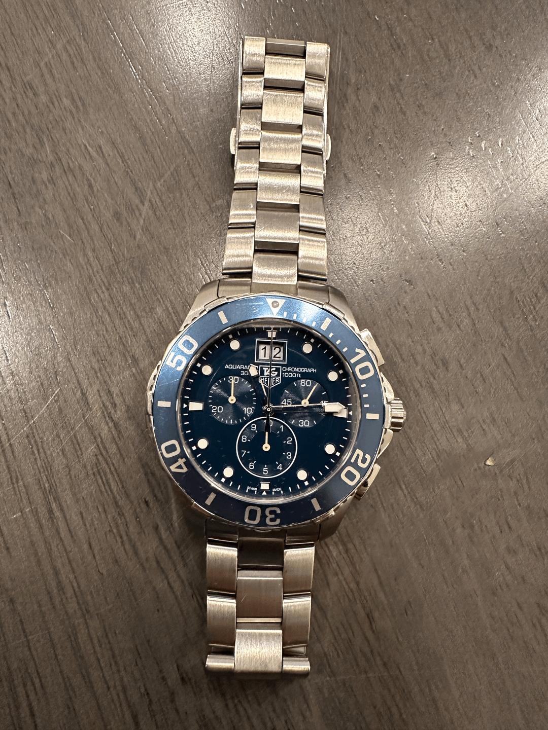 Selling my TAG Heuer Aquaracer Chronograph Grande Date Quartz, ref. CAN1011-FT8011. Awesome dive chrono, just losing out on wrist time to my other watches. Condition: Good overall. Some scratches on the bezel (visible in the photos), but crystal and case are clean. Chronograph functions and date all working as they should. Watch only — no box or papers. Currently sized to fit a 7" wrist. Specs: Case size: 43 mm Case thickness: \~12 mm **Asking** **$700 + Shipping to US.**