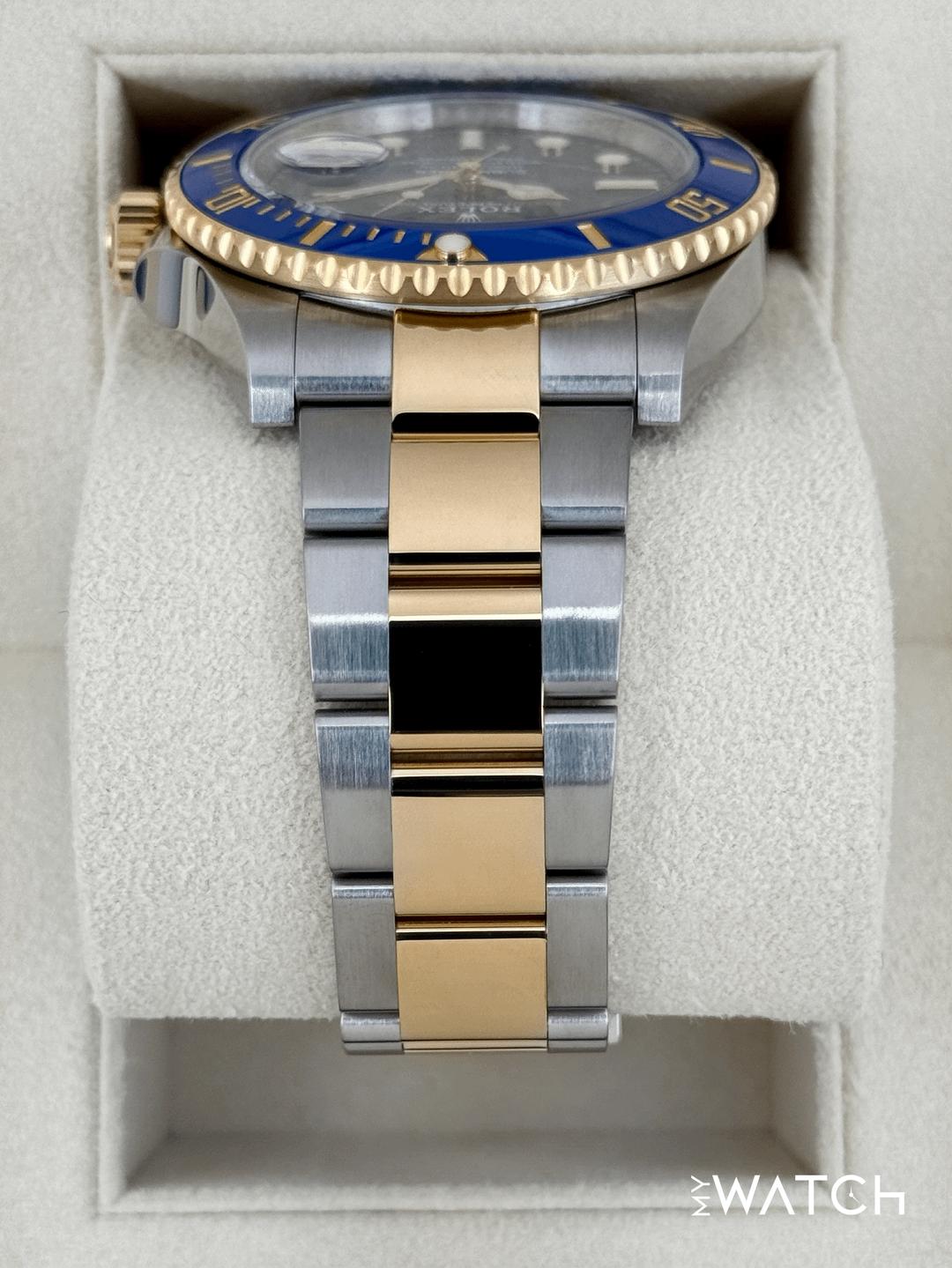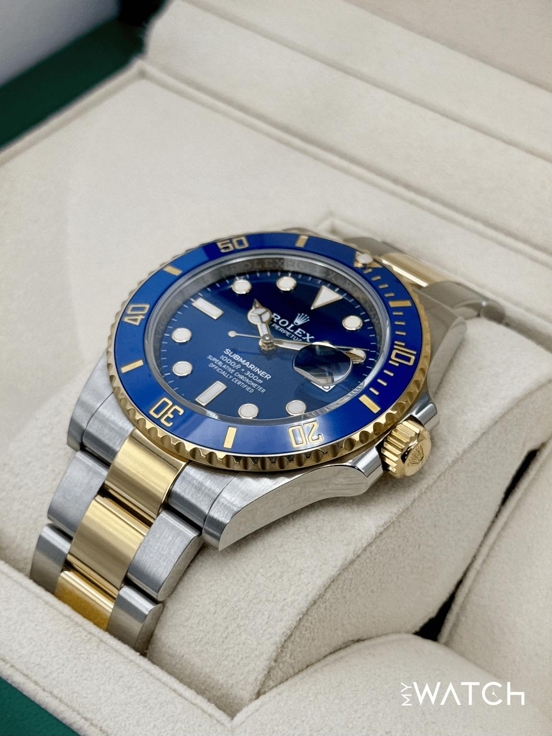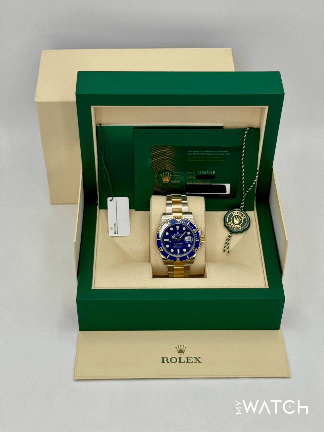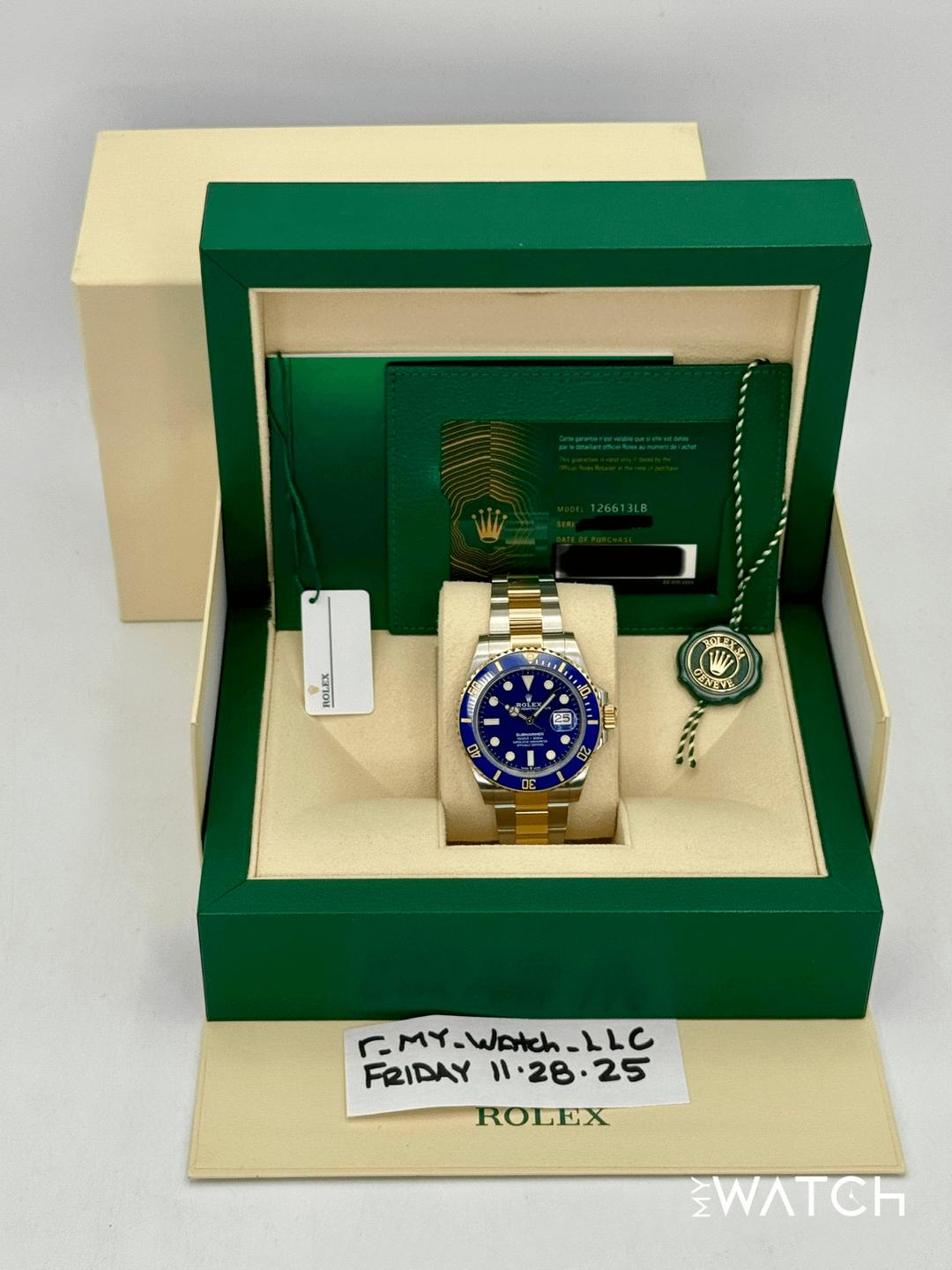🔵**2022 Rolex Submariner Date "Bluesy" 41mm 126613LB Two-Tone Stainless Steel and 18kt Yellow Gold Royal Blue Dial Oyster Bracelet** 🔵**TRADE or SELL us your luxury watch, all brands considered. Message me details.** **Includes the following:** **✔️Original Rolex Double Boxed** **✔️Box and Papers - Yes** **✔️Warranty card dated November 2022** **✔️Reference: 126613LB** **✔️Material: Oystersteel and 18kt Yellow Gold** **✔️5 year manufacturer warranty** **✔️Manual and Warranty booklets** **✔️Green and White Hang Tags included** **✔️Size: 8.25inch wrist (Full Links)** **✔️Watch is in excellent overall condition. Please see photos for details.** **✔️**[**Trades**](https://mywatchllc.com/pages/sell-rolex-watch) **welcome** Business Name: **My Watch LLC** LOCATION: Oak Park, Michigan ✔️[MyWatchLLC.com](http://mywatchllc.com/) for current inventory ✔️Google Business Listing [https://g.co/kgs/Cmd6FPW](https://g.co/kgs/Cmd6FPW) ✔️Business Hours M-F 9-6 ✔️Facetime/Video chat/calls welcome to view the watch interested. ✔️Contact: 248-422-0909 via text or call for quickest response. 🟢TERMS: Visit [MyWatchLLC.Com](http://mywatchllc.com/) for payments accepted 🟢REFERENCES/REVIEWS: We are well reviewed on all platforms from google, trust pilot, rolexforums, additionally we have 300+ reference in multiple FaceBook watch groups, reference checks welcome. 🟢SHIPPING: If you are not local, we offer Fully Insured FedEx overnight shipping in the USA for a fee. International shipping available. [https://mywatchllc.com/products/2022-rolex-submariner-bluesy-41mm-126613lb-two-tone-blue-dial](https://mywatchllc.com/products/2022-rolex-submariner-bluesy-41mm-126613lb-two-tone-blue-dial)