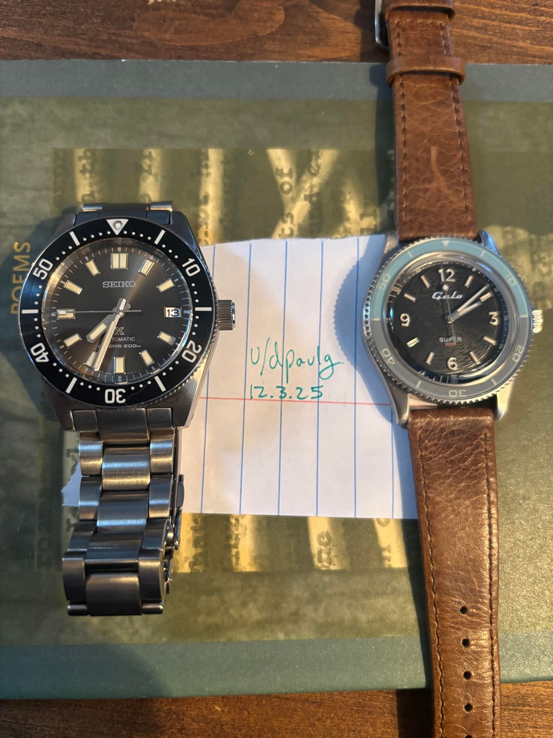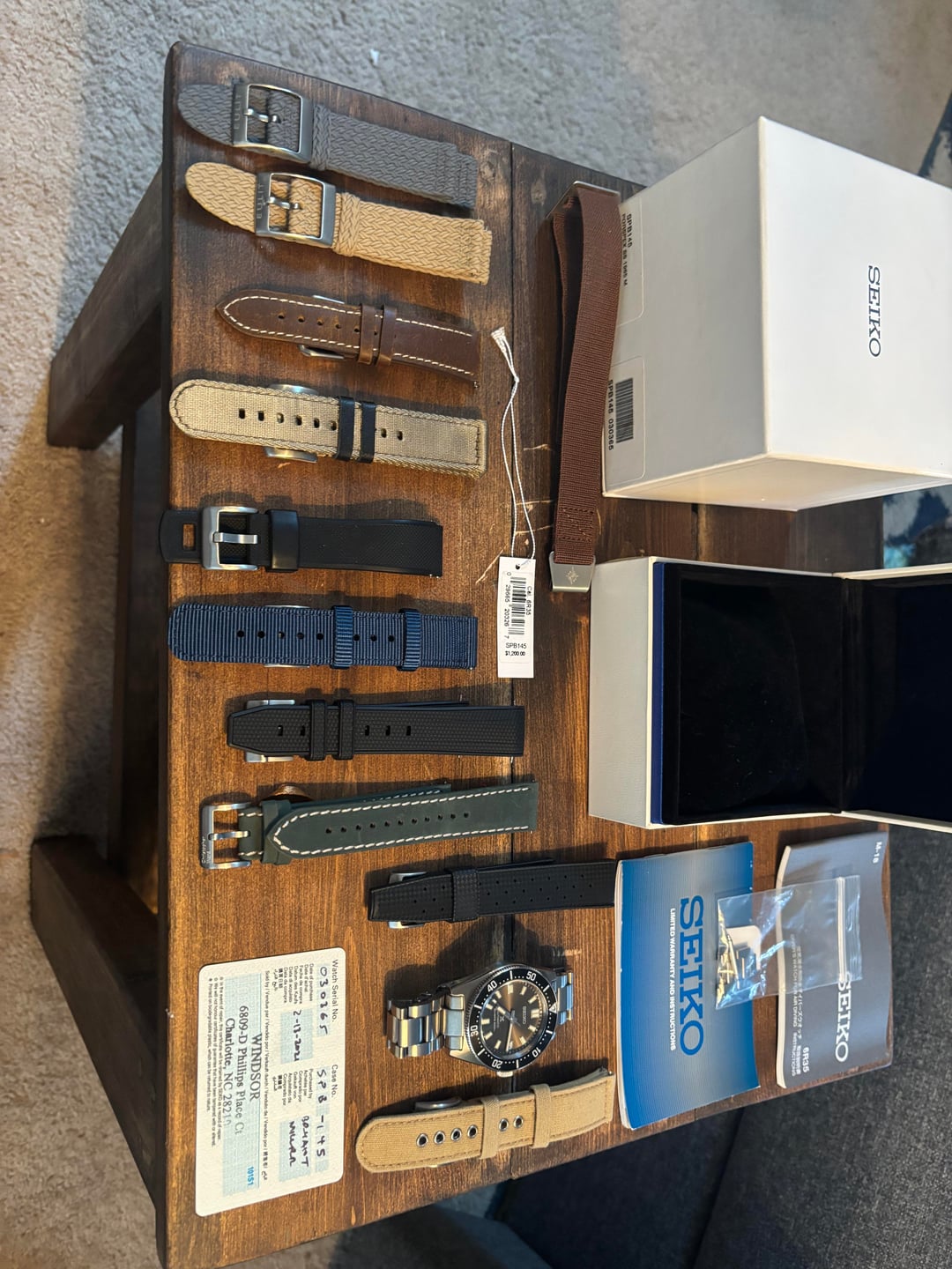 Up for sale today is my Seiko SPB145, a boutique edition version of the first 62mas reissue. Its color is burnt umber according to Seiko, but I’d call it a rich, sunburst brown. Condition is good, approx. 8 of 10. Note the crystal scuffs between 12 and 1 and at 2. The SPB145 is a full set - box, papers, instruction manual, hangtag, pillow, extra links, and I even have extra “skinny fat” spring bars if you want. I have a lot of extra 20mm straps including a vintage oak leather CW in green, a two piece seatbelt nato from Dryden, a small uncle Seiko tropic, and two piece eulit perlon. You can pick one or two of these for no extra charge. General specs: 6R35 movement, 40.5mm diameter, 47.6mm lug to lug, 13.2mm thick, sapphire crystal More pics at: https://drive.google.com/drive/folders/1ISCC1FMTneLmroPL4gtSm0gSTg97i-Wn Price is a firm $550 to me via PayPal (FF or GS, buyer pays GS), UPS ground shipping included. I’ve priced the SPB145 in mind of its condition.