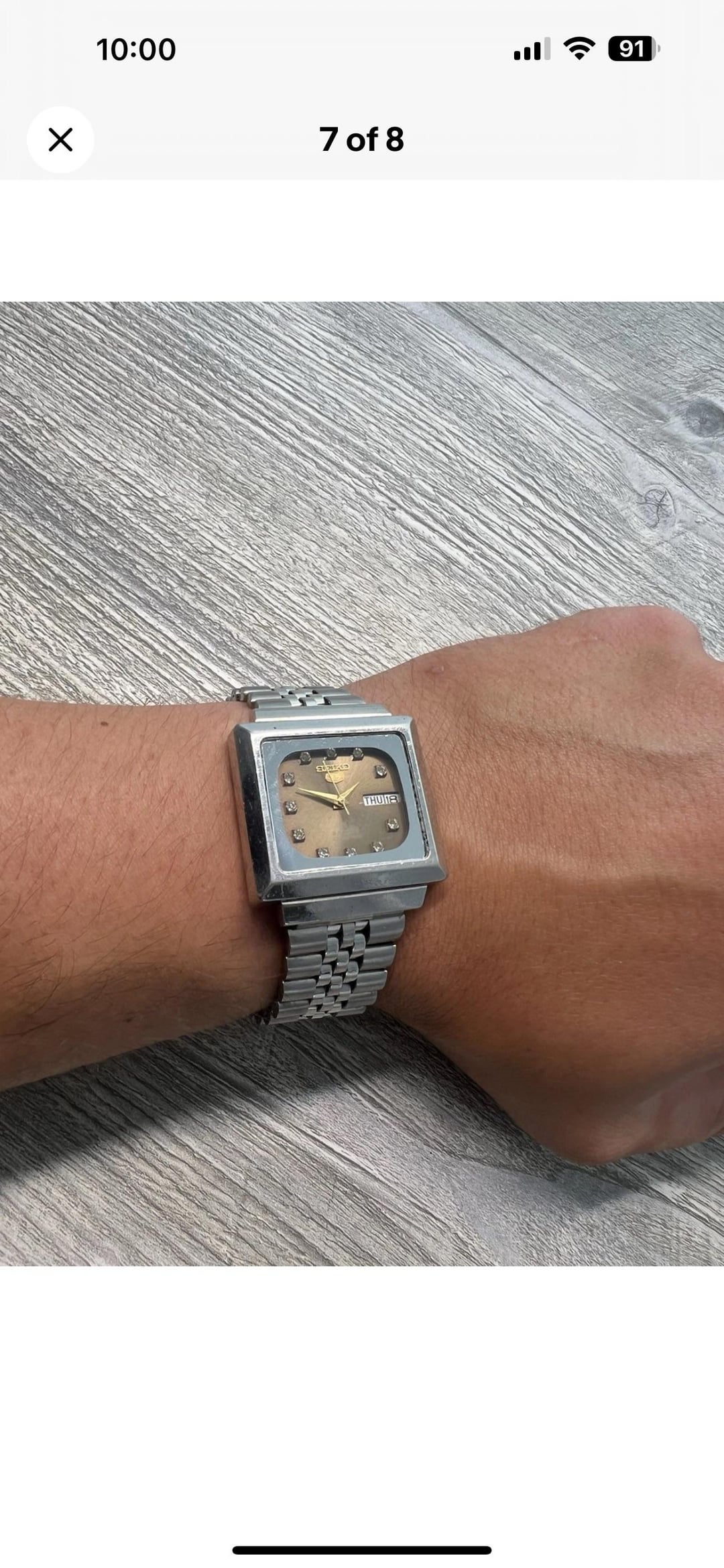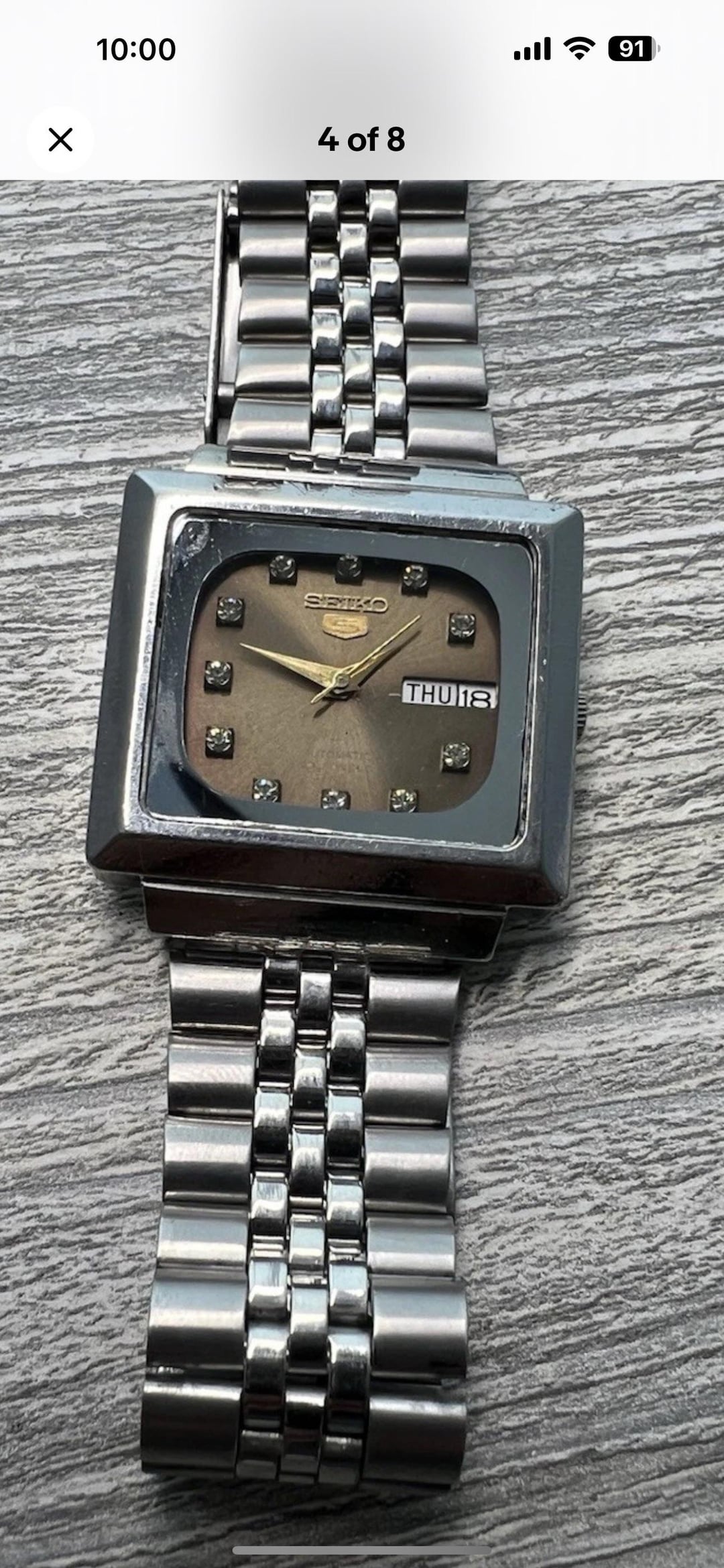 Selling a vintage Seiko 5 with the classic TV-case design and a brown sunburst dial with crystal markers. It’s 36mm across and easy to wear (it doesn’t feel chunky). I think it could , look great on a simple brown leather strap if you want a different look from the bracelet. Potential inexpensive holiday gift. Details • ~36mm case • Automatic movement — running • Day/date (Spanish/English) • Period bracelet included • Ref: 6309-6070A Condition: vintage wear; dial has nice patina. Price: $99 shipped CONUS — and if you’re interested, just make an offer. Thanks for looking.