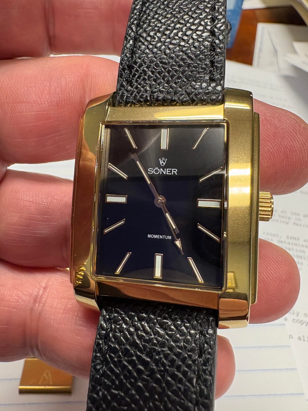 Up for sale is my Soner Momentum tank in Gold plating with matching gold bracelet and after market black leather strap with gold plated deployent clasp. Great watch with tons of wrist presence. 8 layers of Ar on the sapphire crystal means a crisp clear dial all the time. The watch is hardness coating, cutting down on scratches and worries. Seiko movement means a reliable, easily adjusted and repaired timepiece. A steal at my asking price. No trades, reasonable cash offers considered.
