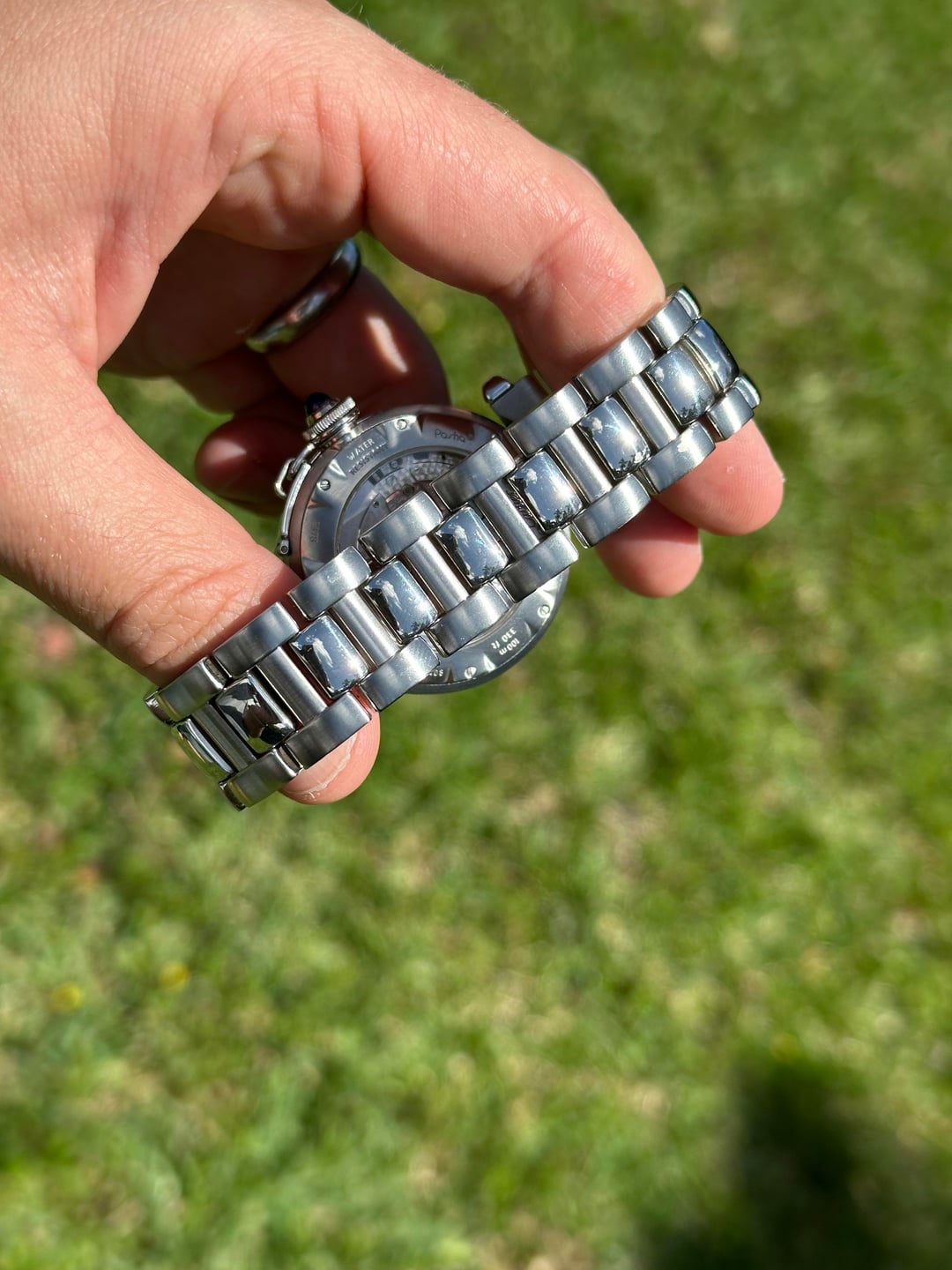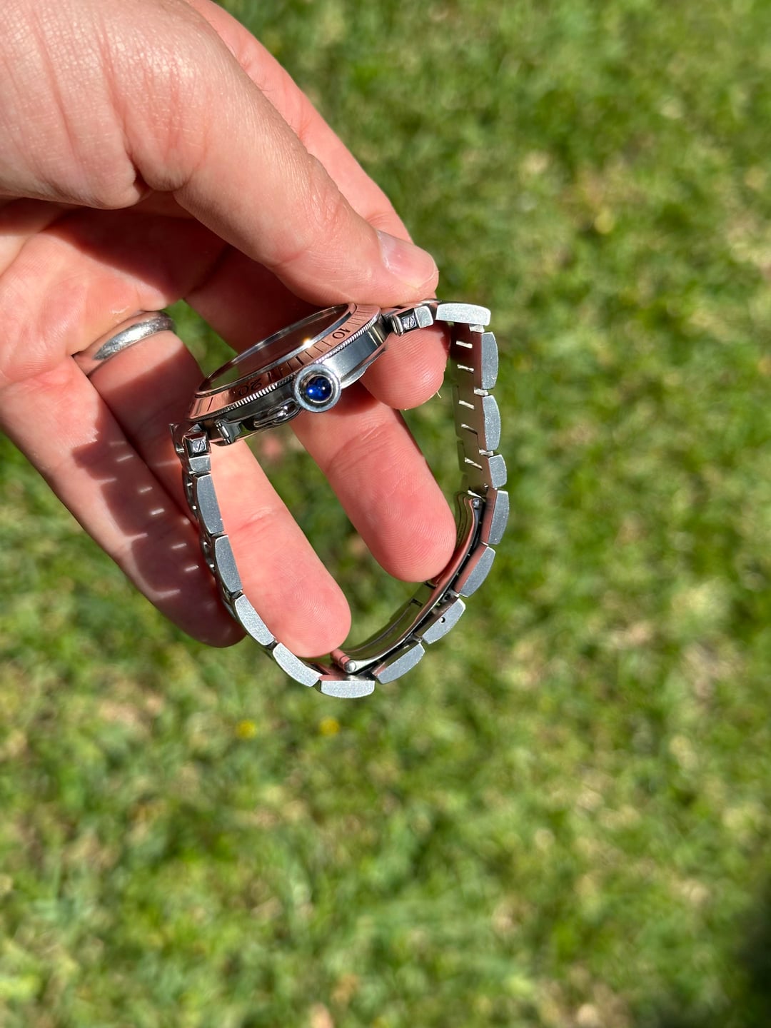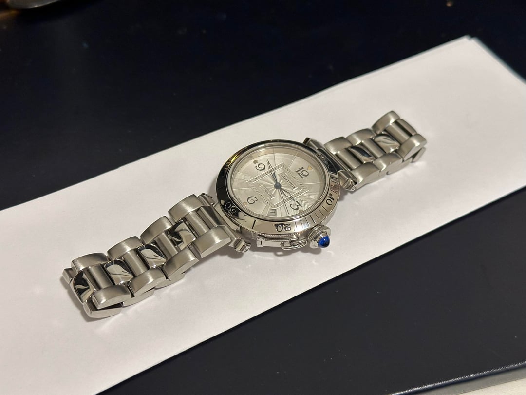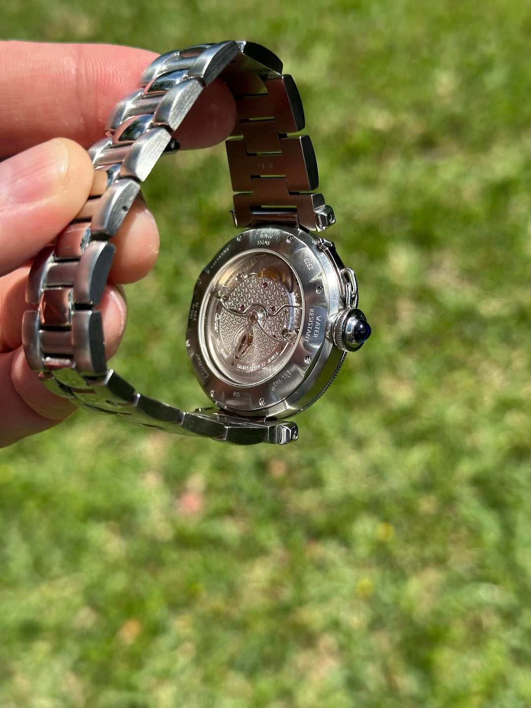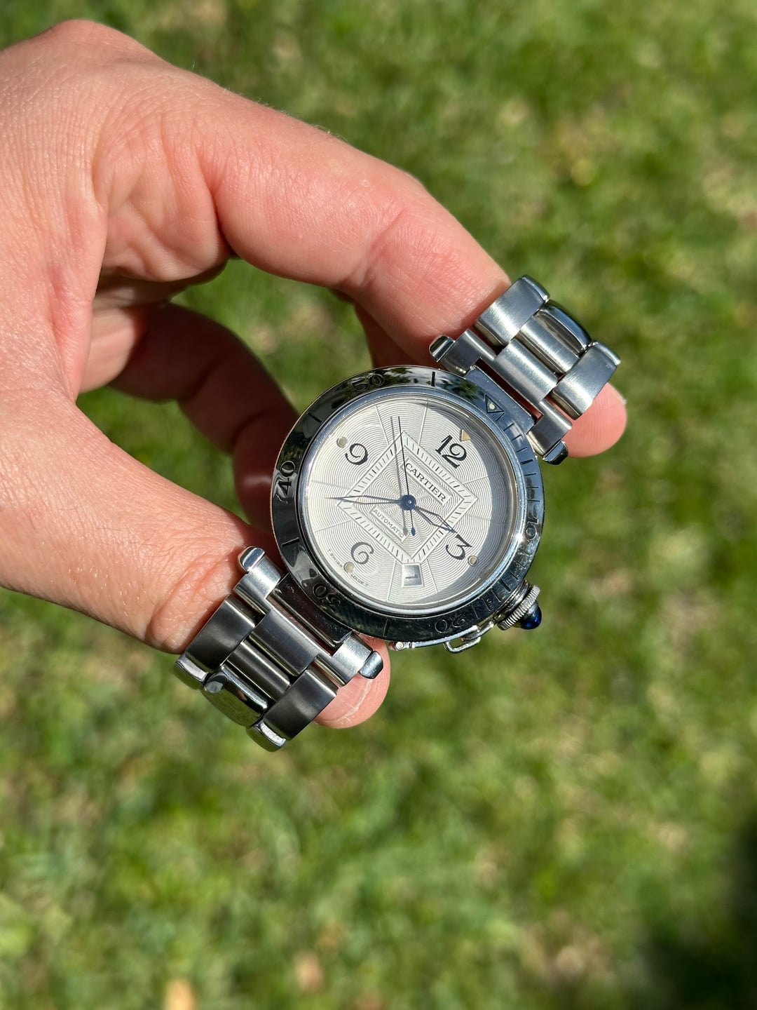 The legend behind the Cartier Pasha is that in the 1930s, the Pasha of Marrakech, Morocco, sought a watch with waterproof resistance beyond that available at the time, and in response Cartier designed the Pasha, most uniquely distinguishable for its large waterproof crown cover chained to the side of the watch. Originally a custom watch, Cartier put variants of the model into production, running from 1985 through to today. Up for sale is one of those such models--a Cartier Pasha Reference 2738, dating back to the 2000s. This Pasha measures in with a robust 38mm diameter stainless steel case. The watch comes on its original Cartier bracelet. It features a guilloche finish silver dial in the front, with its automatic and Cartier-decorated automatic movement visible through a display caseback once the watch is flipped. The Pasha is a true Cartier sport watch, while at the same time never abandoning Cartier's commitment to design. This watch features tritium on the indices that has darkened and no longer glows due to its age. The blued steel sword hands for the watch originally had tritium lume, but I asked my watchmaker to skeletonize the hands. I think it makes for a nice compliment to the display case back. The movement in this watch is an automatic Cartier Caliber 191, which is currently running at approximately +5 seconds per day. **Price:** $1,999 **Timestamp:** in photos **Videos:** I can send a video of the watch through my instagram, @WarmDials **Payment and Shipping:** to be agreed upon by the buyer and myself, taking the buyer's purchase history into consideration. **Trades:** I am open to trades, including up, down, or sideways. If you message about a trade, please provide a valuation with some comps. My trade value for this watch likely will be higher than the list price. I'm located in the United States and frequent user in this community. I have bought and sold often, and I'm happy to answer any questions you may have / provide more photos or a video. You can find me on instagram at @WarmDials. Don't hesitate to reach out if you have any questions or want to chat
