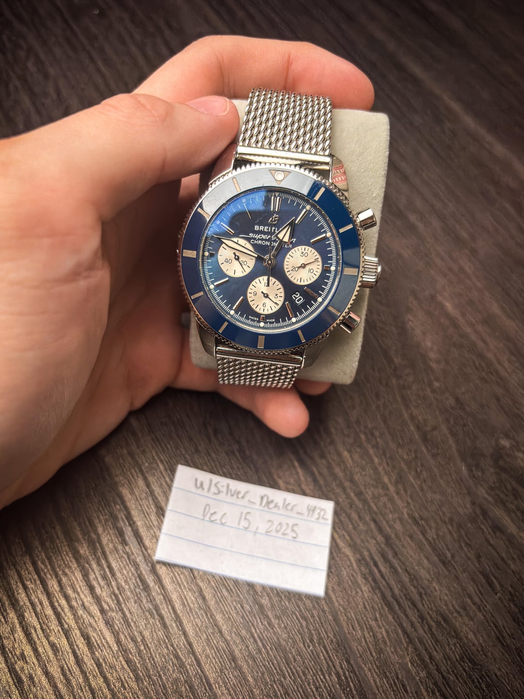 **Follow for more watch deals!** + **I accept trades!** Condition – Case shows normal light surface wear consistent with careful use — small hairlines and light marks on polished surfaces, but no dents, dings, or deep scratches. Bezel is clean and vibrant with strong color, sharp markers, and only minor handling wear visible under angled lighting. Crystal has hairline scratches (see photos). They are not deep, but they are present and fully disclosed. Dial is excellent — rich sunburst blue with crisp printing, clean subdials, and evenly aged lume plots. Hands are clean with no corrosion or discoloration. Chronograph pushers and crown operate smoothly, with the chronograph starting/stopping/resetting properly. Mesh bracelet is in very good condition with light surface wear and no broken links. Clasp shows typical hairlines from normal desk use, with Breitling engraving sharp and clean. Movement is running strong at +6 s/d, 331° amplitude, and 0.1 ms beat error, indicating a healthy Breitling Caliber B01 (photo included). Box & Papers: Watch-only (no box or papers). Mesh bracelet and clasp included as shown. Price – $2,799 Shipped Zelle and Bank Wire preferred; Venmo/Apple Pay +15.. *sales tax applicable to buyers in GA or IL Shipping: Ships within 24 hours of cleared payment via FedEx 2-Day, insured for full value. US only. Timestamp: Included in photos. Overview: The Breitling Superocean Heritage II Chronograph (Ref. AB0162) brings together the classic 1950s Superocean design with Breitling’s in-house Caliber B01, known for its reliability, accuracy, and 70-hour power reserve. The blue sunburst dial and matching blue bezel make this one of the most attractive configurations of the Heritage line, especially paired with the stainless-steel mesh bracelet. This example runs extremely well, shows honest light wear, and offers a strong value for an in-house Breitling chronograph — priced competitively due to disclosed crystal hairlines.