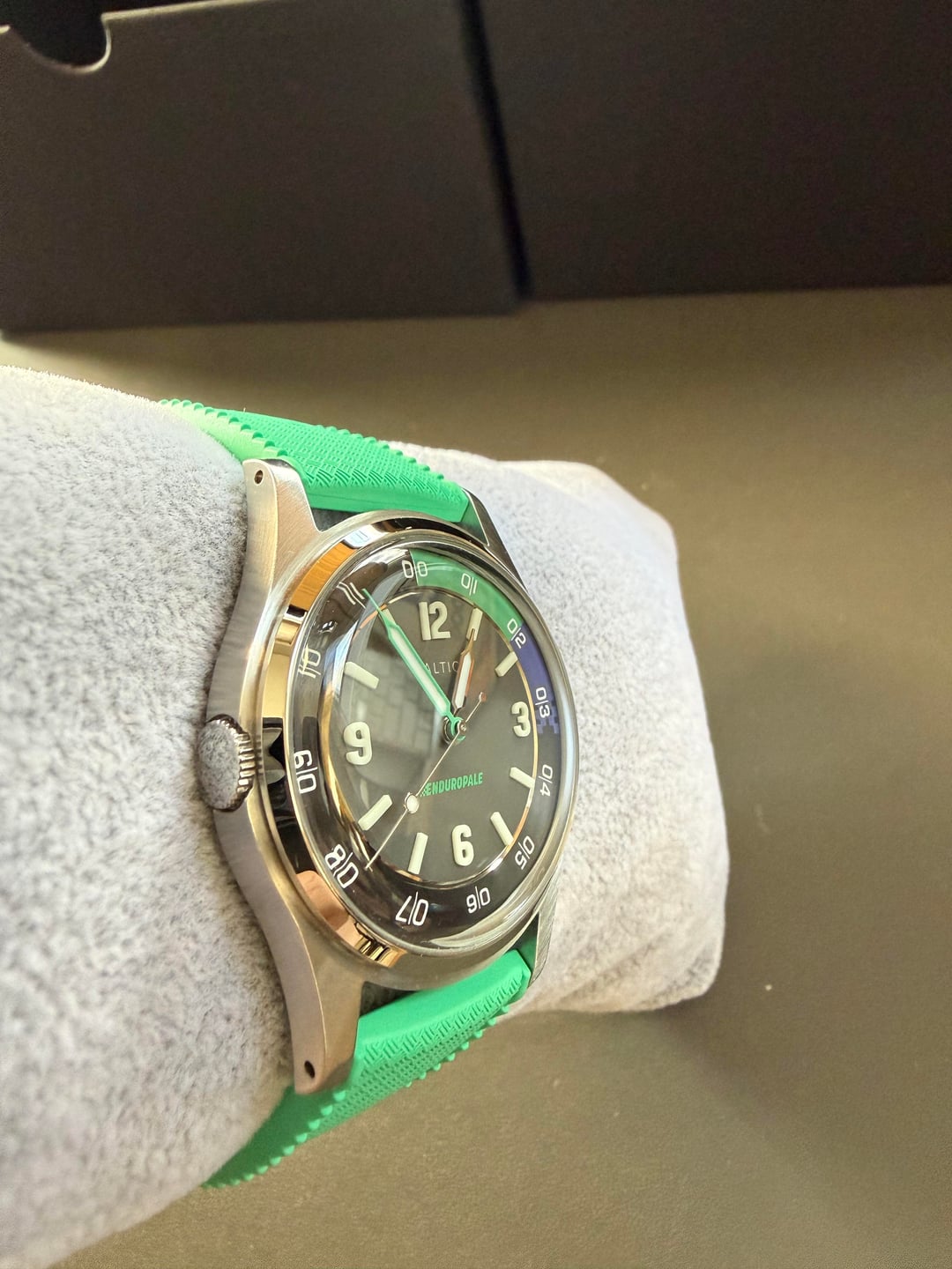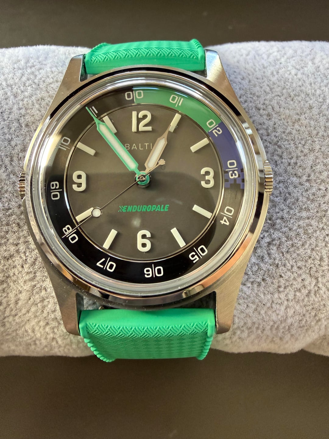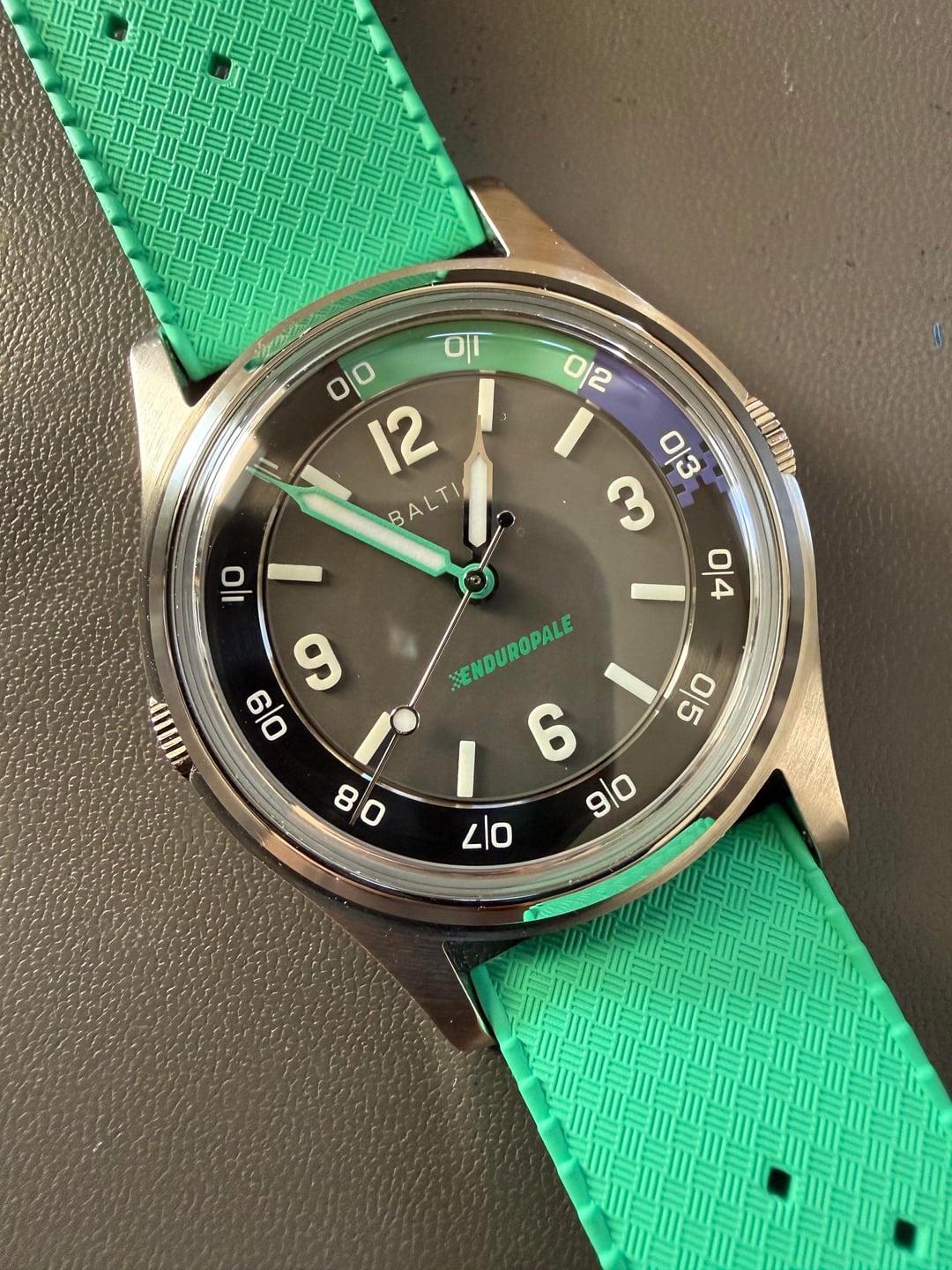 For sale is a Baltic Hermetique Dual Time Enduropale. This is a limited edition of 200 pieces. The crown on the left is used to rotate the internal bezel. The indices and hour markers use 3D lume blocks which make for a very intense lume at night. 37mm diameter, 20mm lug width, 46mm lug-to-lug lenth. Comes with the full kit, including box, warranty card dated February 2025, and original green rubber strap and buckle. Watch is in very good condition overall. Some minor hairline scratches on the case. Dial and sapphire glass are clean and free from imperfections. Asking **$650 shipped** to anywhere in the USA. Prefer payment via Paypal F&F (+3% for G&S), Zelle, or Venmo. No trades at this time. Please let me know if you have any questions! Timestamp is in the last photo.