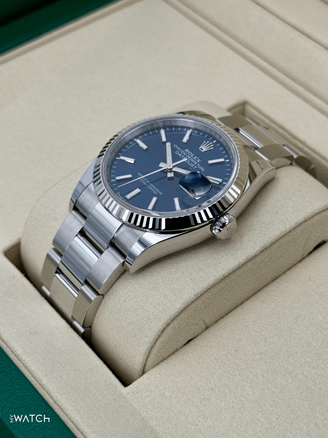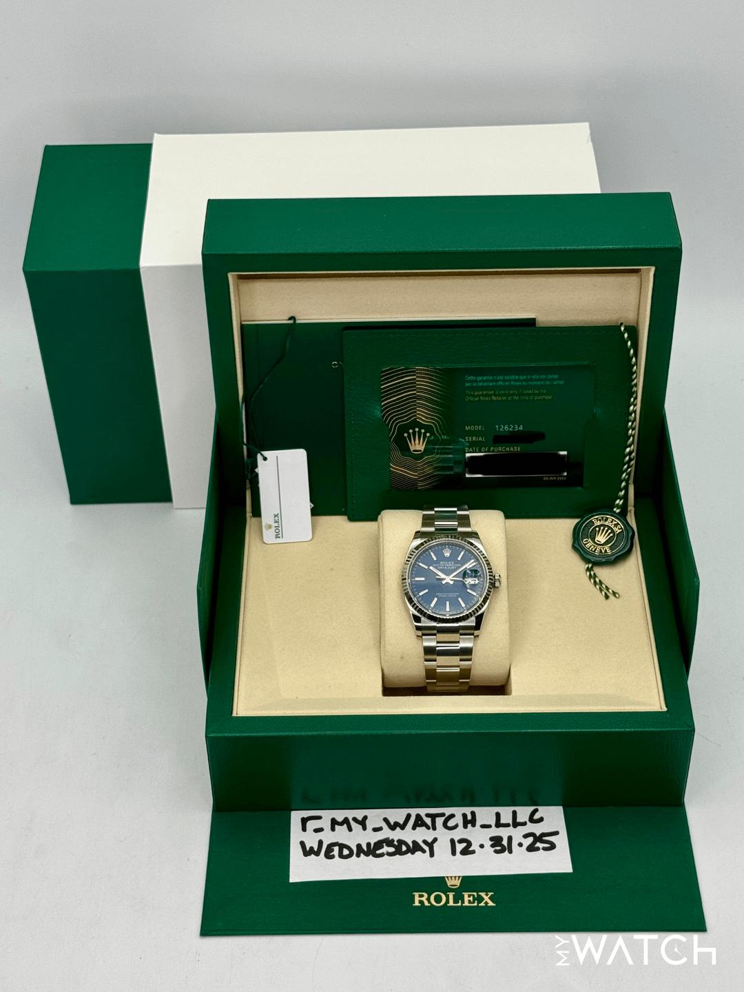🔵**NEW 2025 Rolex Datejust 36mm 126234 Stainless Steel Oyster Bracelet Blue Dial and 18K White Gold Fluted Bezel** 🔵**TRADE or SELL us your luxury watch, all brands considered. Message me details.** **Includes the following:** **✔️BRAND NEW 2025 UPDATED ROLEX BOX (Double Boxed)** **✔️Box and Papers - Yes** **✔️Warranty card dated 2025** **✔️5 year manufacturer warranty** **✔️Manual and Warranty booklets** **✔️Green and White Hang Tags included** **✔️Size: 7.5inch wrist (Full Links)** **✔️Material: Oystersteel and 18k White Gold Fluted Bezel** **✔️Watch is BRAND NEW/UNWORN** **✔️Trades welcome** Business Name: **My Watch LLC** LOCATION: Oak Park, Michigan ✔️[MyWatchLLC.com](http://mywatchllc.com/) for current inventory ✔️Google Business Listing [https://g.co/kgs/Cmd6FPW](https://g.co/kgs/Cmd6FPW) ✔️Business Hours M-F 9-6 ✔️Facetime/Video chat/calls welcome to view the watch interested. ✔️Contact: 248-422-0909 via text or call for quickest response. 🟢TERMS: Visit [MyWatchLLC.Com](http://mywatchllc.com/) for payments accepted 🟢REFERENCES/REVIEWS: We are well reviewed on all platforms from google, trust pilot, rolexforums, additionally we have 300+ reference in multiple FaceBook watch groups, reference checks welcome. 🟢SHIPPING: If you are not local, we offer Fully Insured FedEx overnight shipping in the USA for a fee. International shipping available. [https://mywatchllc.com/products/olex-datejust-36mm-126234-oyster-blue-dial](https://mywatchllc.com/products/olex-datejust-36mm-126234-oyster-blue-dial)