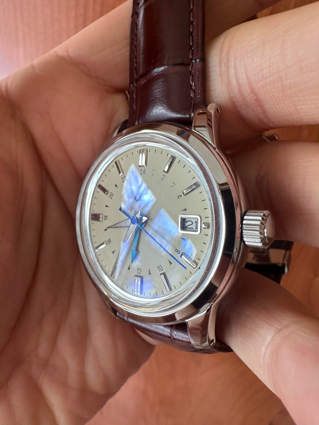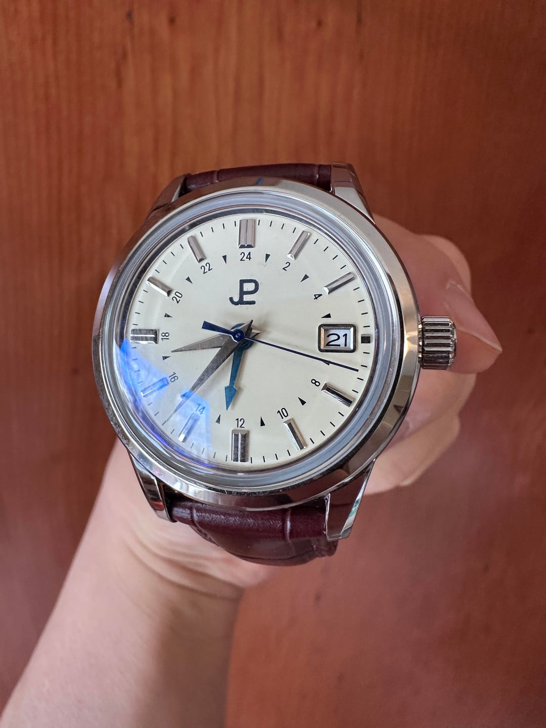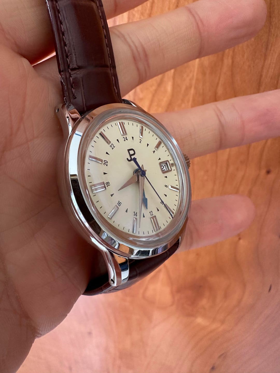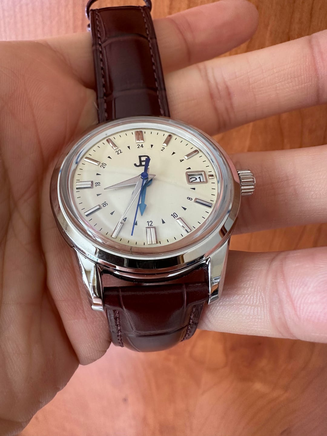 Here for sale is a faithful homage to the Grand Seiko SBGM221 by JPL Watchworks. Everything is spot on from the cream colored dial to the blued GMT hand. The seconds hand is also blued, which I think is a deviation from the GS. The watch runs strong and has been worn minimally. Like new leather alligator strap with deployment clasp. $120 shipped CONUS.