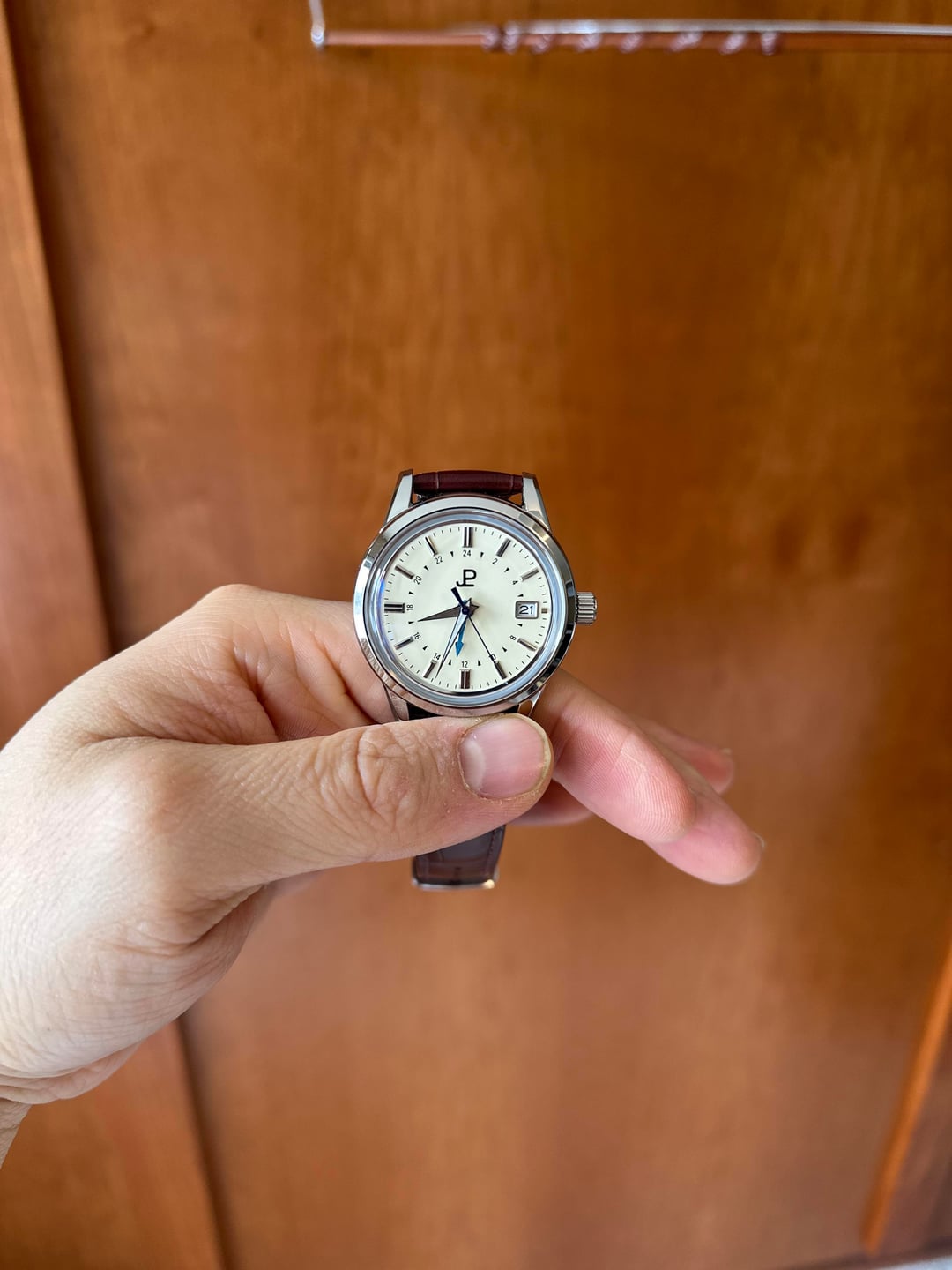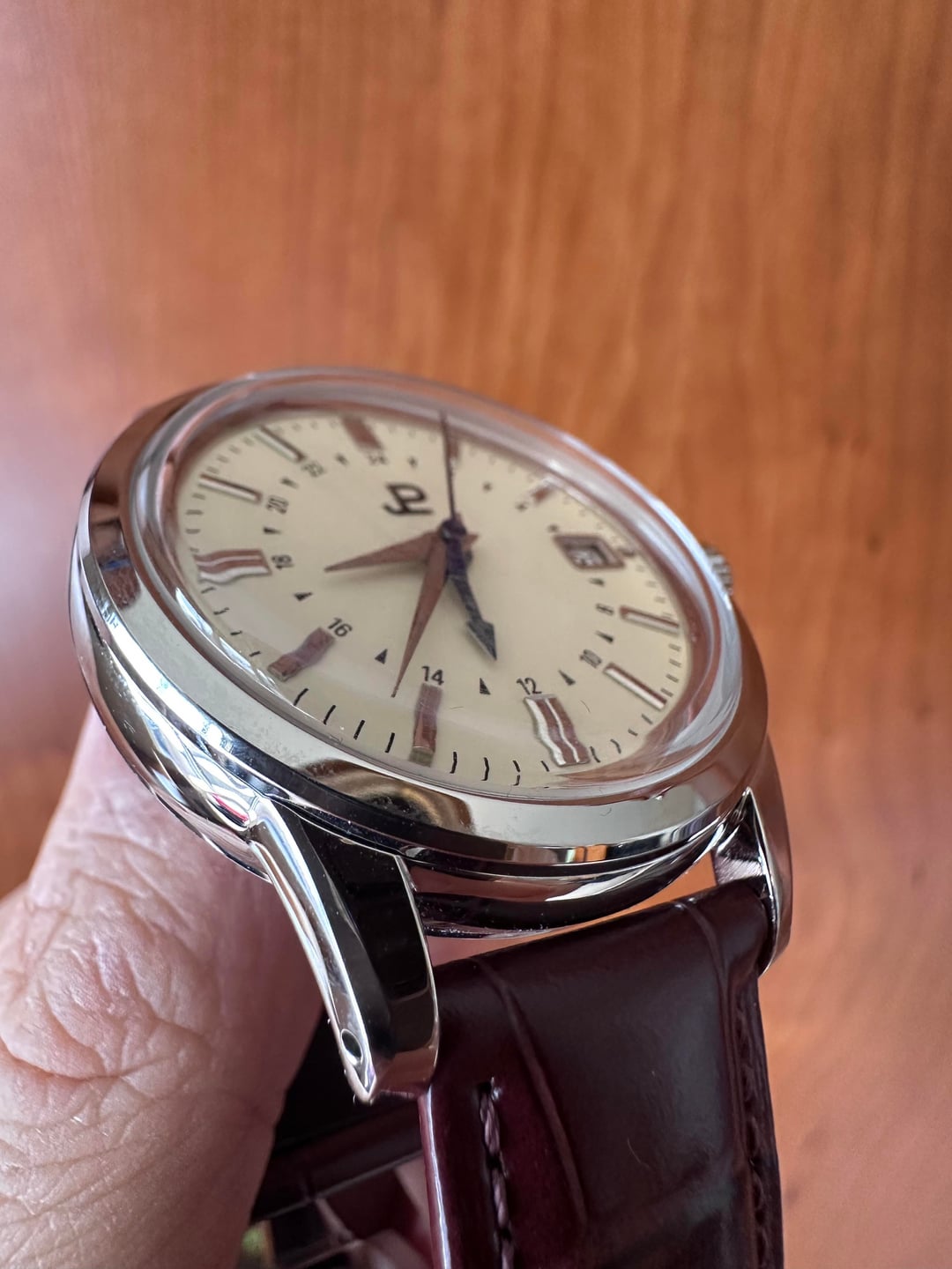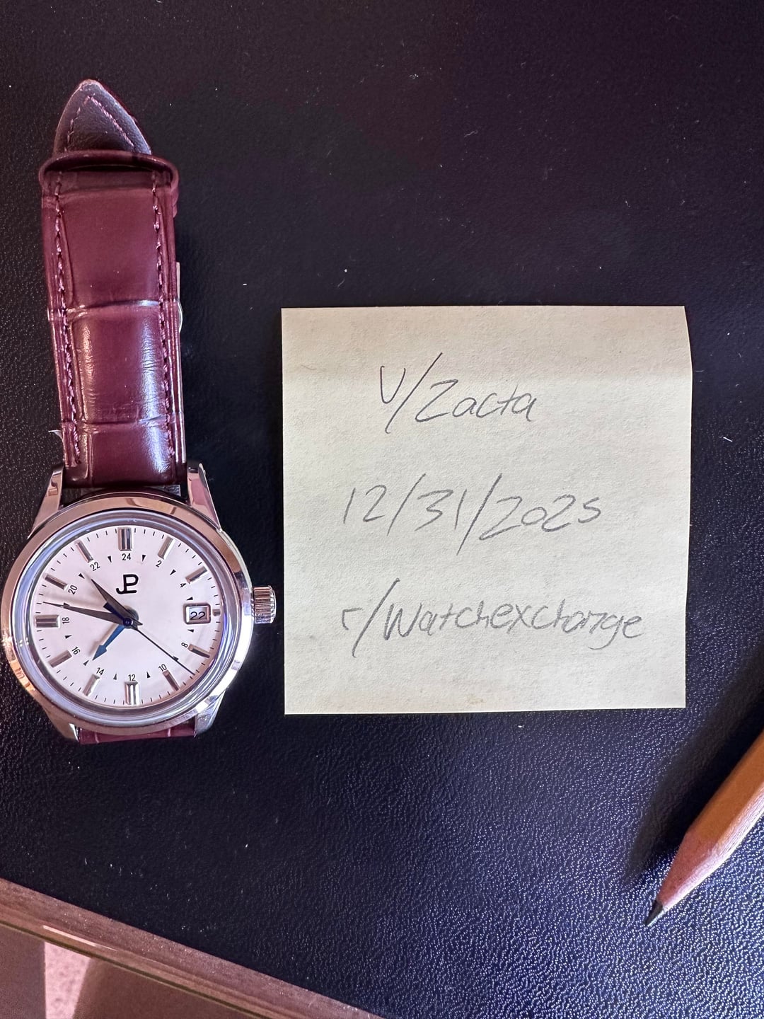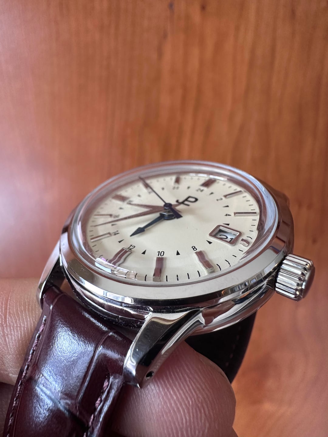 Here for sale is a faithful homage to the Grand Seiko SBGM221 by JPL Watchworks. Everything is spot on from the cream colored dial to the blued GMT hand. The seconds hand is also blued, which I think is a deviation from the GS. The watch runs strong and has been worn minimally. Like new leather alligator strap with deployment clasp. $120 shipped CONUS.