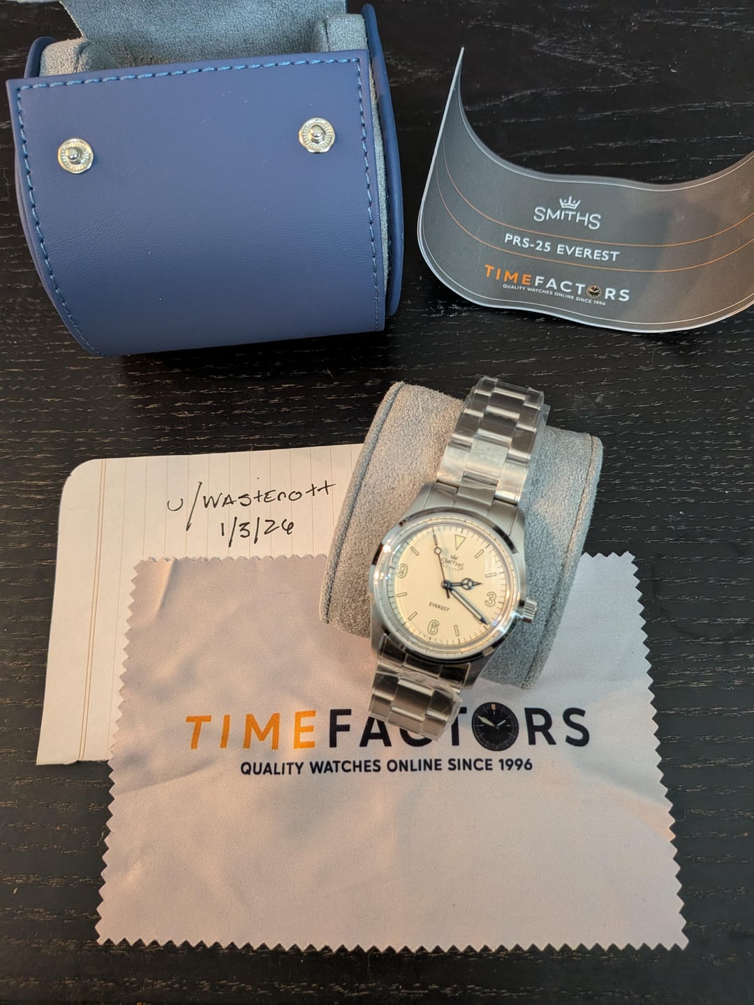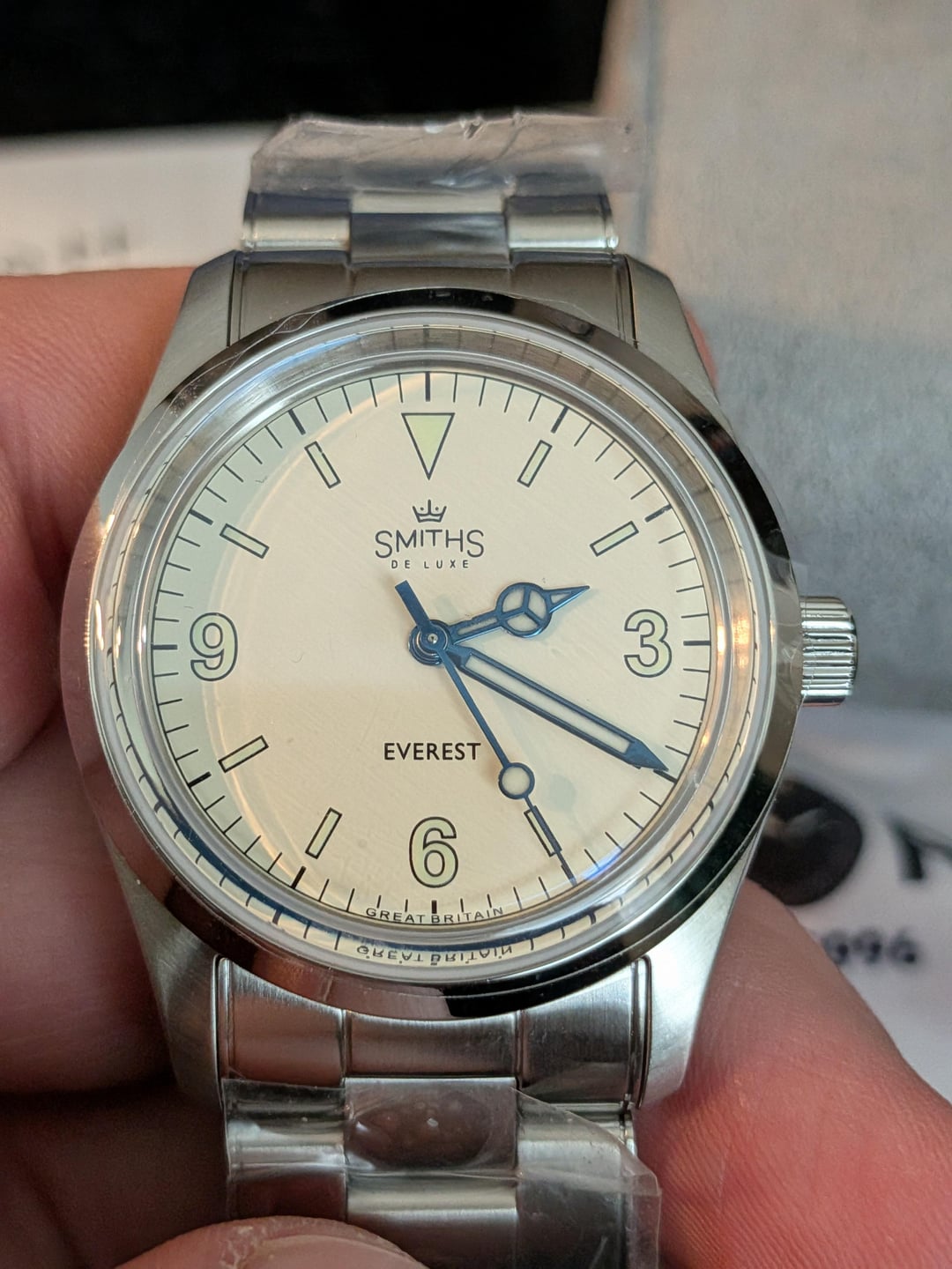 Up for sale is a white dial, 36mm Smiths Everest. This watch was purchased in March of 2023 directly from Timefactors and is completely unworn with protective plastic still in place. Includes outer box, watch roll, warranty card dated 03/2023, stainless steel bracelet, and cleaning cloth. Asking $485 shipped (PayPal F+F), CONUS only. Watch specs: Case • 316L stainless steel, brushed top with polished sides • Diameter 36mm, 39.3mm including crown • Lug to lug height 43.5mm • 11.4mm to the top of the hi-dome sapphire crystal • Lug spacing 20mm • Anti-magnetic 20,000A/m with anti-magnetic movement cover • Water Resistance 10ATM/100 metres/330 feet • 140 grammes including bracelet • Screw back, screw down crown, drilled lugs • Everest caseback design Dial • Pale cream with black printed minute track • Triangle, numbers and indices SuperLuminova X1-C3 Hands • Mercedes hands, heat blued steel • Luminous: SuperLuminova X1-C3 Crystal • Hi-dome sapphire with anti-reflective coating on the underside , 30.4mm diameter x 2.5mm thick Movement • Miyota 9039, 24 jewel automatic, 28,800 BPH Bracelet • Stainless steel oyster bracelet tapering from 20mm to 16mm with screwed links, solid end links and signed push-button clasp