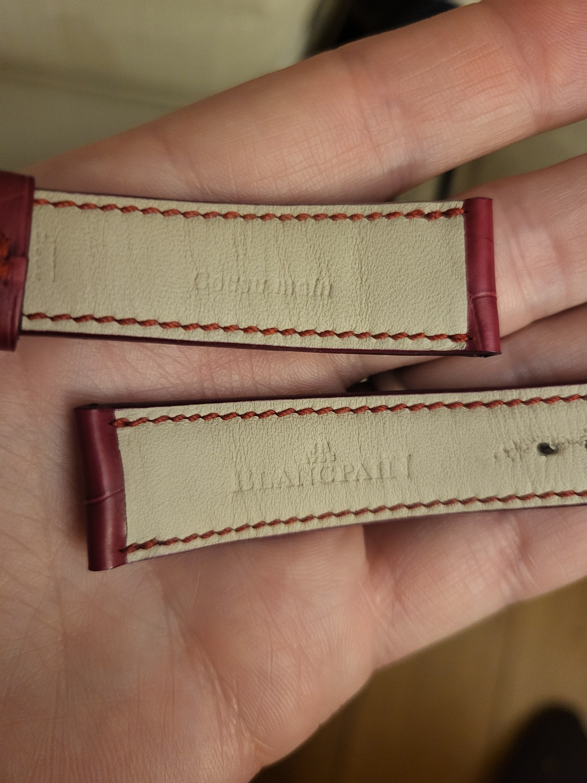 Diamètre de 34mm hors couronne. Boîtier et boucle or 18k, bracelet Blancpain alligator bordeaux. Cadran blanc porcelaine. Jours et mois en français.