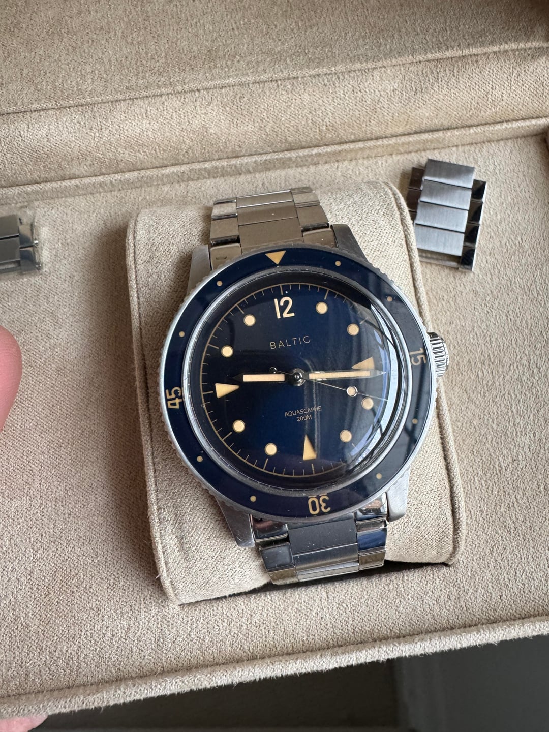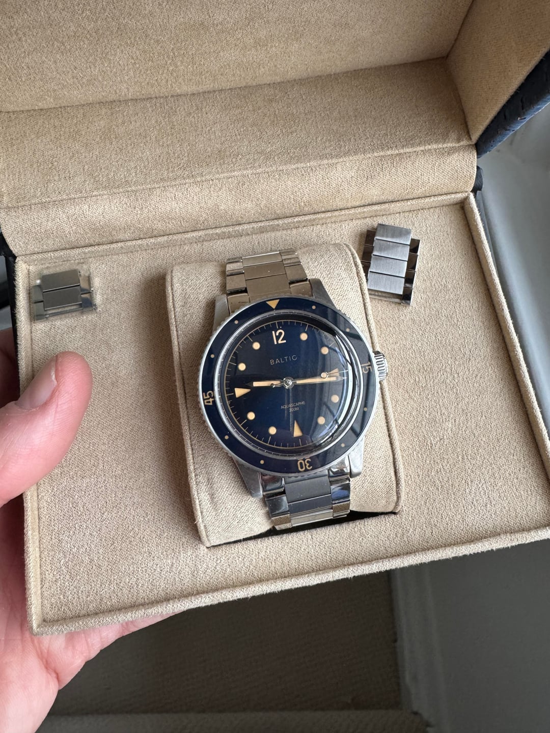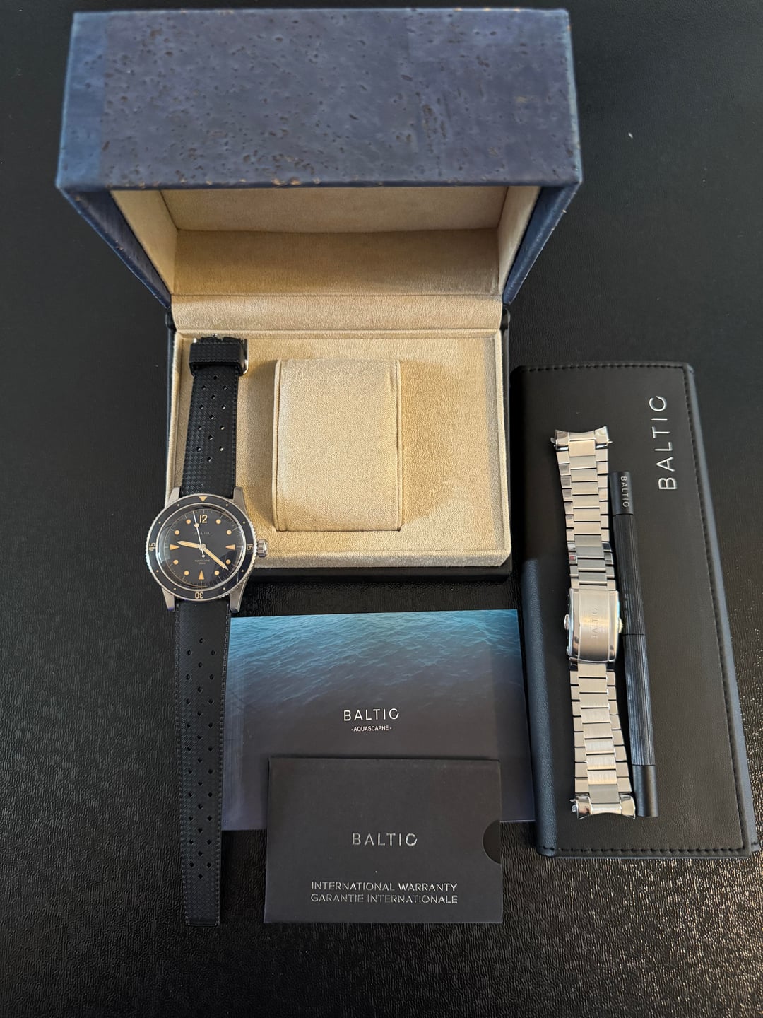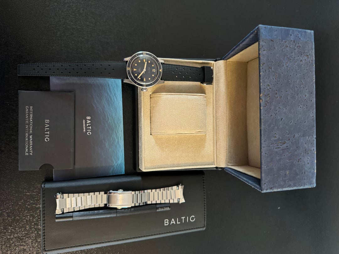 Baltic Aquascaphe Classic Blue Gilt **Price:** $625 shipped CONUS, including add-on Baltic stainless steel flat link bracelet **Condition:** Excellent **Payment:** Venmo, PayPal, Zelle Included in the sale: Full set with inner and outer boxes, papers, and Baltic warranty card Comes on OEM Black Tropic Rubber strap (quick release) Includes Baltic Flat Link bracelet (quick release) with separate box, Baltic pouch, and Baltic bracelet adjustment tool – all links included, sized currently for 6.5 inch wrist Flat link bracelet shows some very light desk diving marks on the clasp but otherwise case, dial, bezel are clean. Watch and band + bracelet must be bought as a set. Specs: · **Case material:** Stainless steel 316L · **Case diameter:** 39mm · **Lug to lug:** 47mm · **Thickness:** 13mm (11mm without glass) · **Lug width:** 20mm · **Bezel:** Unidirectional (120 clicks), sapphire crystal · **Glass:** Double dome sapphire · **Dial finish:** Sunray blue · **Super-Luminova®:** C1 · **Movement:** Automatic Miyota 9039 · **Power reserve:** 42 hours · **Crown:** Screwed · **Water resistance:** 200m (20ATM) Imgur album with timestamp: [https://imgur.com/a/WFWL4Ae](https://imgur.com/a/WFWL4Ae)