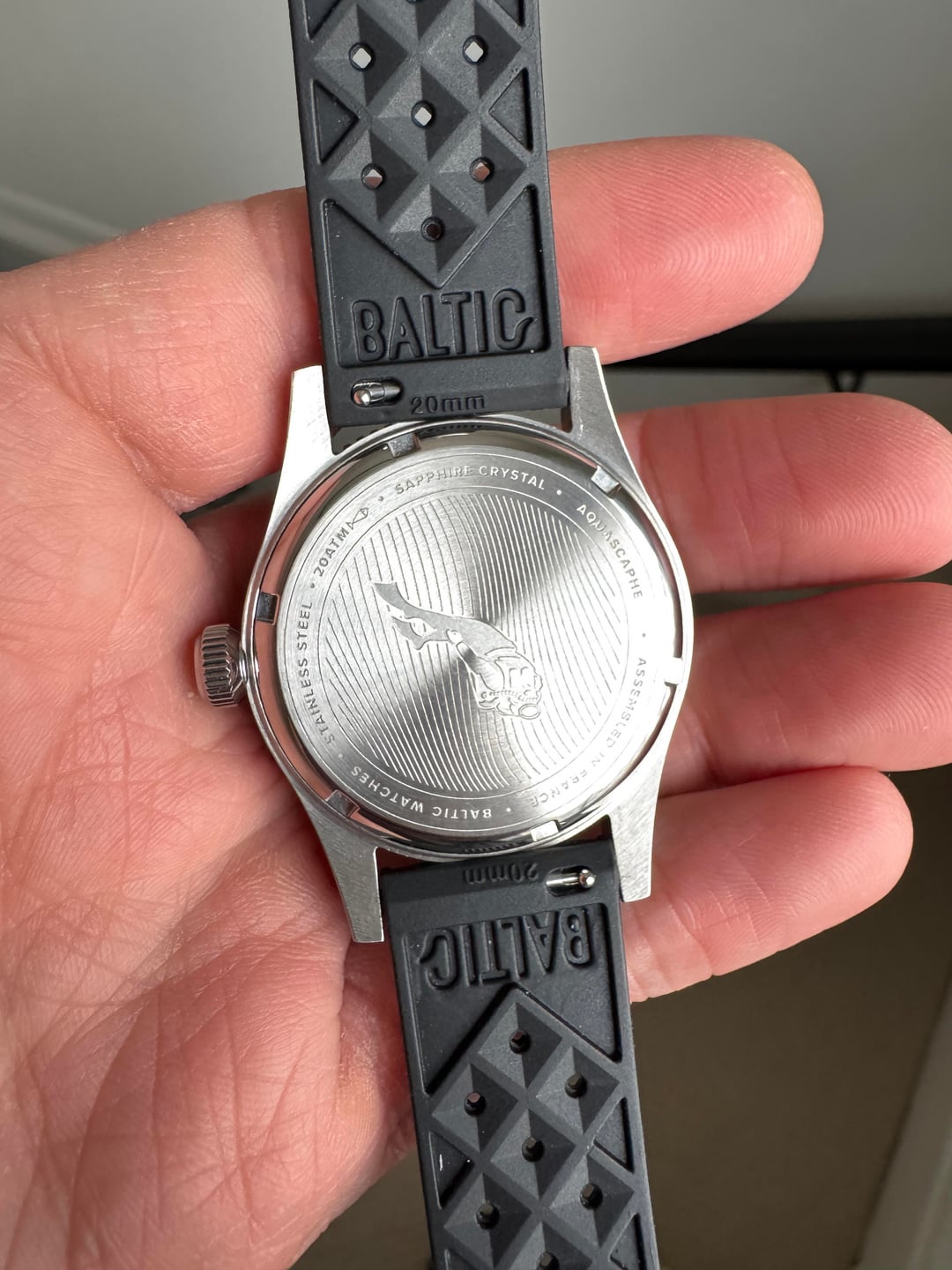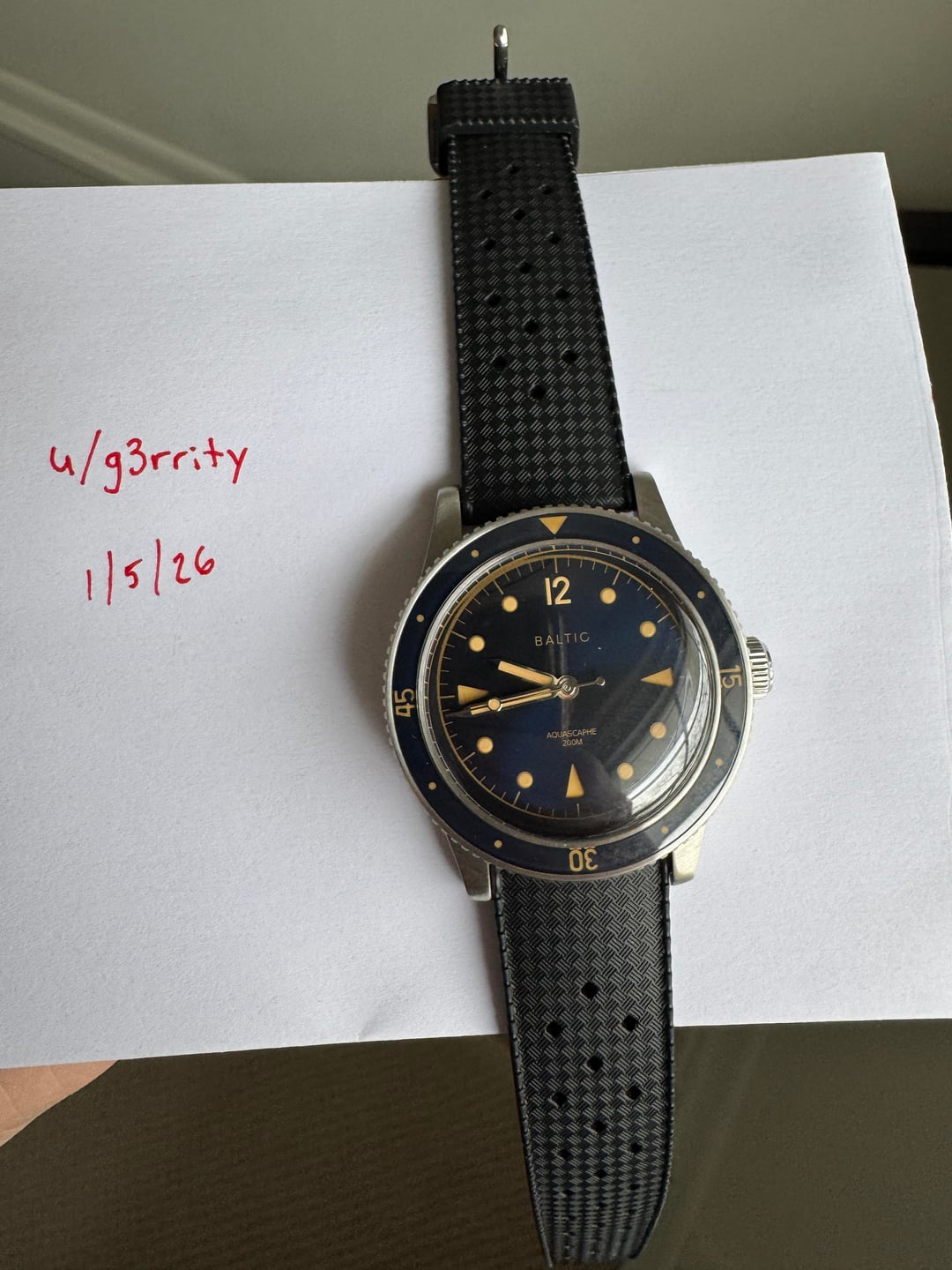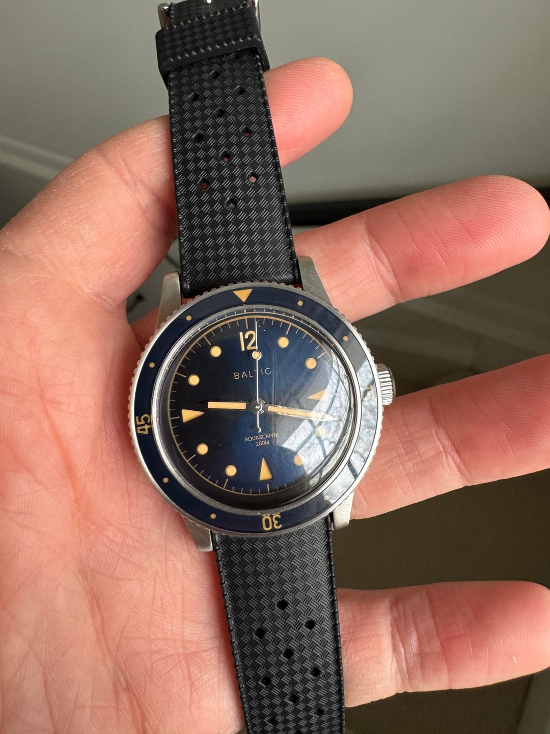 Baltic Aquascaphe Classic Blue Gilt **Price:** $625 shipped CONUS, including add-on Baltic stainless steel flat link bracelet **Condition:** Excellent **Payment:** Venmo, PayPal, Zelle Included in the sale: Full set with inner and outer boxes, papers, and Baltic warranty card Comes on OEM Black Tropic Rubber strap (quick release) Includes Baltic Flat Link bracelet (quick release) with separate box, Baltic pouch, and Baltic bracelet adjustment tool – all links included, sized currently for 6.5 inch wrist Flat link bracelet shows some very light desk diving marks on the clasp but otherwise case, dial, bezel are clean. Watch and band + bracelet must be bought as a set. Specs: · **Case material:** Stainless steel 316L · **Case diameter:** 39mm · **Lug to lug:** 47mm · **Thickness:** 13mm (11mm without glass) · **Lug width:** 20mm · **Bezel:** Unidirectional (120 clicks), sapphire crystal · **Glass:** Double dome sapphire · **Dial finish:** Sunray blue · **Super-Luminova®:** C1 · **Movement:** Automatic Miyota 9039 · **Power reserve:** 42 hours · **Crown:** Screwed · **Water resistance:** 200m (20ATM) Imgur album with timestamp: [https://imgur.com/a/WFWL4Ae](https://imgur.com/a/WFWL4Ae)