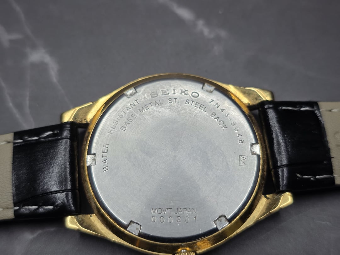 Vintage **Seiko quartz** with a classic black dial and gold-tone case. Japan movement, running well with a fresh battery. Clean, simple design that wears great. **Condition:** * Running properly, day/date working * Dial in good shape * Case shows normal wear and some gold-tone plating loss (see photos) * Crystal has light marks * Aftermarket leather strap (not Seiko) * Stainless steel caseback / base metal case **Specs:** * Quartz movement (Japan) * Day/Date at 3 o’clock * Approx. 36mm case (no crown) * 18mm lug width **💵 Price:** **$99 shipped CONUS** PayPal preferred. Ships fast. Photos show exact condition—happy to answer questions.