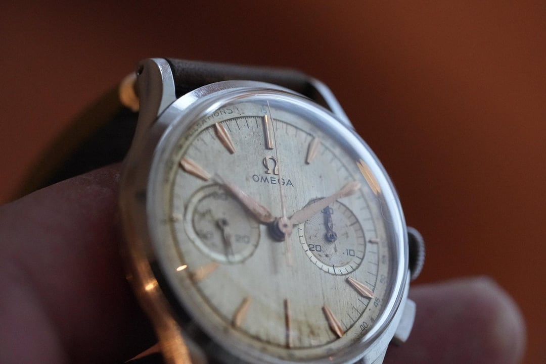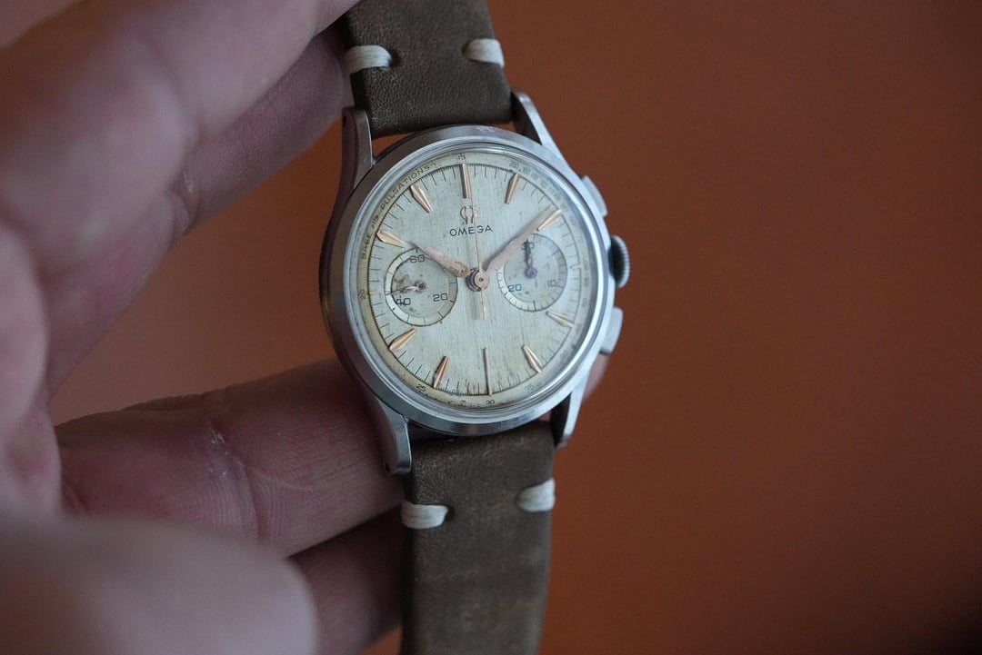 I've had this cutie patootie in my vintage collection for many years. Rare pulsations dial for the docs. Note the crown is not original. Chronograph works as it should. Ships from Denver $3,500 + $35 Fedex 2 day shipping in North America. Zelle, PayPal, Venmo f&f to established accounts. From Ai: The **Omega Calibre 320** is one of the most prestigious vintage chronograph movements ever produced by Omega. While the famous Calibre 321 powered the Speedmasters that went to the moon, the **Calibre 320** is its equally refined, **two-register** (bi-compax) sibling. Produced between **1942 and 1968**, this movement is a "column-wheel" chronograph, a technical architecture that is highly prized by collectors today for its smooth operation and historical importance. # Key Specifications * **Movement Type:** Manual-wind, column-wheel chronograph. * **Registers:** Two sub-dials (Small seconds at 9:00, 30-minute counter at 3:00). * **Beat Rate:** 18,000 A/h (2.5 Hz). * **Power Reserve:** Approximately **44 hours**. * **Base Movement:** Developed by **Lemania** (Calibre 27 CHRO).. # Why Collectors Love It * **The "321 Connection":** It shares about 90% of its parts with the legendary Calibre 321. The main difference is that the 320 lacks the 12-hour totalizer, resulting in a cleaner, more symmetrical dial. * **Elegant Design:** While the 321 is associated with "tool" watches like the Speedmaster, the 320 was almost exclusively used in **elegant dress chronographs**. You will often find it in solid 18k gold cases with beautiful "leaf" or "dauphine" hands. * **Relative Rarity:** Because it was produced in smaller quantities than the three-register versions, finding an original, unpolished Cal 320 is a milestone for vintage Omega enthusiasts.