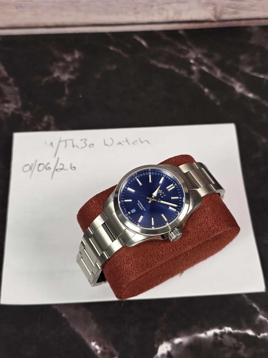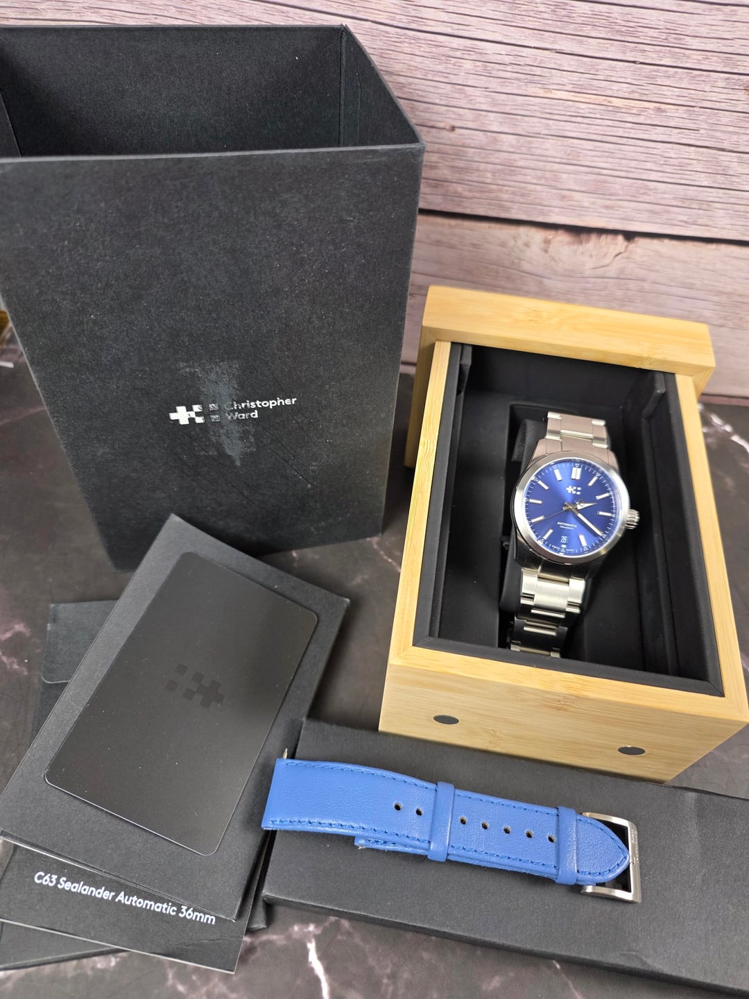 Available for sale! Christopher Ward Sealander 36mm – Morpho Blue Dial Ref: C63-36ADA3-S00B9 Great Pre-Owned Condition • Crystal is clean • Case has minor wear • Bezel has minor wear • Bracelet shows very light wear • Clasp has minor wear Includes box, papers, warranty card, and extra blue strap. Asking: $750 + label Ships from NJ (CONUS only) Zelle preferred, PayPal & Venmo FF accepted NJ buyers subject to sales tax Pics and references available.
