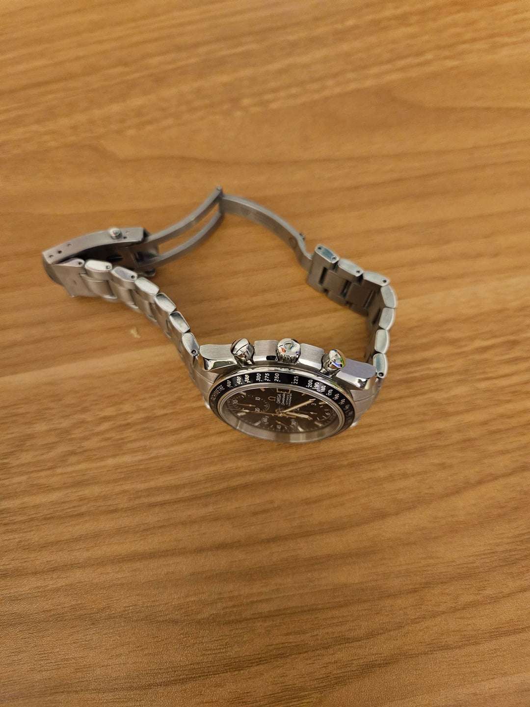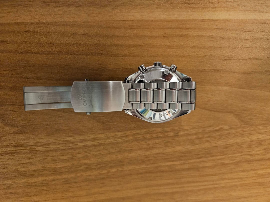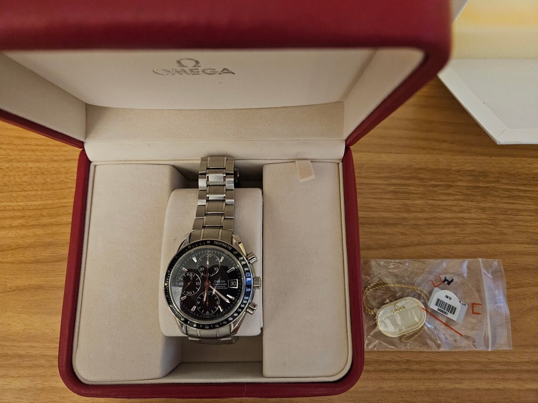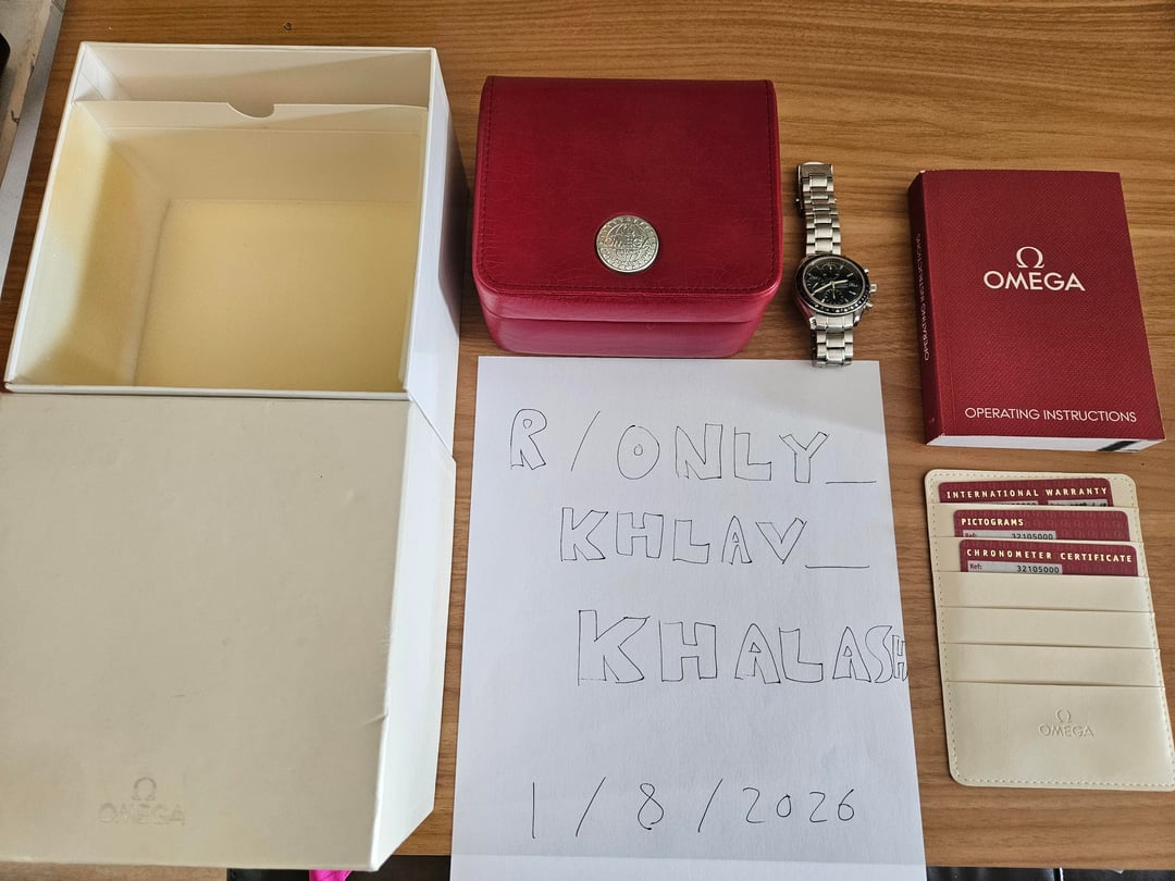Selling a 2009 Omega Speedmaster Date 40mm watch. Bought this on Chrono24 in 2023, have only worn a handful of times so looking to get it a new home. Comes with the box and papers, **one additional link.** It's fitted to about 7.5". Overall great condition, a couple of light scratches on the side of the bezel (visible in one of the pics), a few scuffs on the band and bottom of the case. No scuffs or marks on the face. Has not been serviced since I got it, but keeps time well. Looking for Paypal G&S, US shipping only or local (I'm in Rockville, 20850). I have several confirmed transactions on r/hardwareswap , and 100% feedback with \~300 transactions on Ebay. Message with any questions!