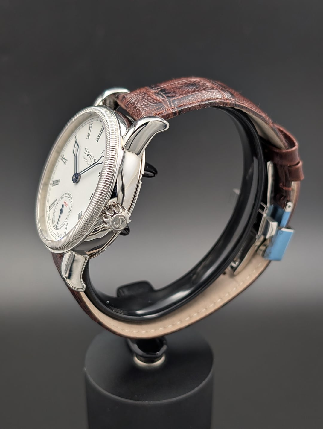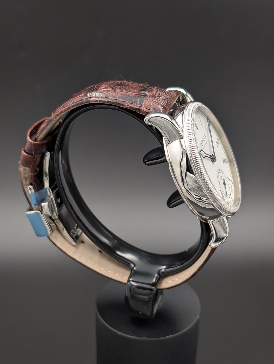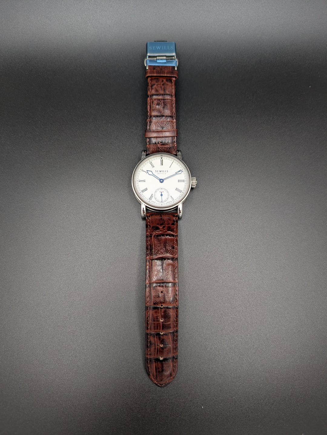 This watch, with a distinctive marine chronometer style, was designed as a tribute to marine chronometer serial no. 4608 (Joseph Sewill, English) that was used on the famous English tea clipper ship 'Cutty Sark'. Limited to 100 numbered pieces. Original retail was approx. $1,400. The watch is in like-new, unworn condition. The watch winds, sets, and runs. No box or papers. Model: Sewills Ferreira Limited Edition Manual Wind ref. PRS-39 Note: Limited to 100 numbered pieces Movement: Swiss-made Unitas 6498 hand-winding movement extensively modified with screwed Glucydur balance with Nivarox hairspring, swan-neck regulator, 3/4 top plate with Geneva stripes, anglage and blued screws Dial: white, custom blued hands Case: 42mm Thickness: 10.75 mm Strap: Alligator calf grain with Sewills double deployment clasp **Watch offered at $899 OBO shipped. USA shipping only. No trades.**