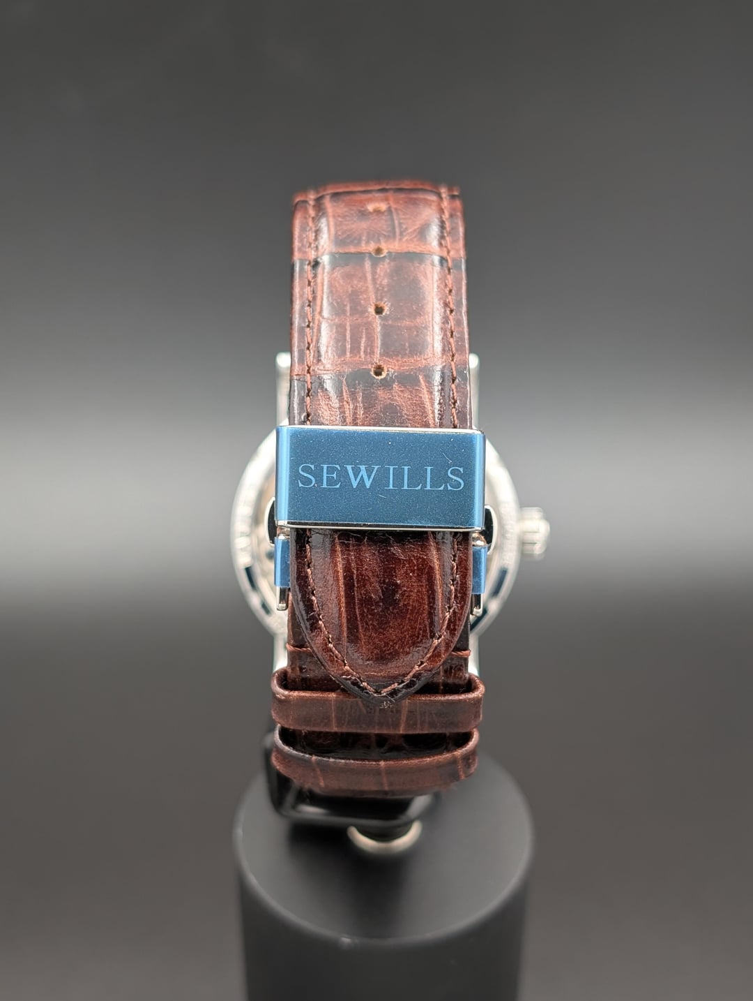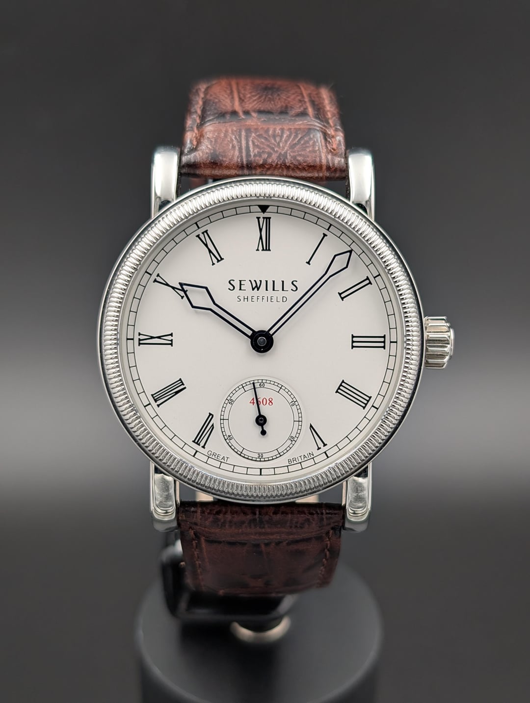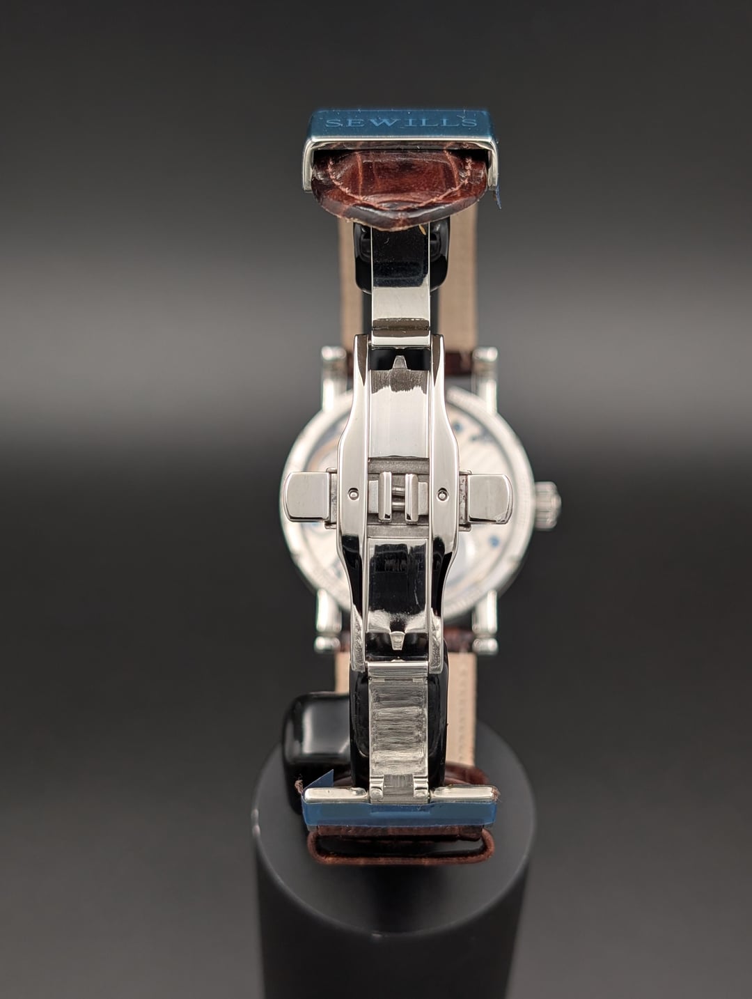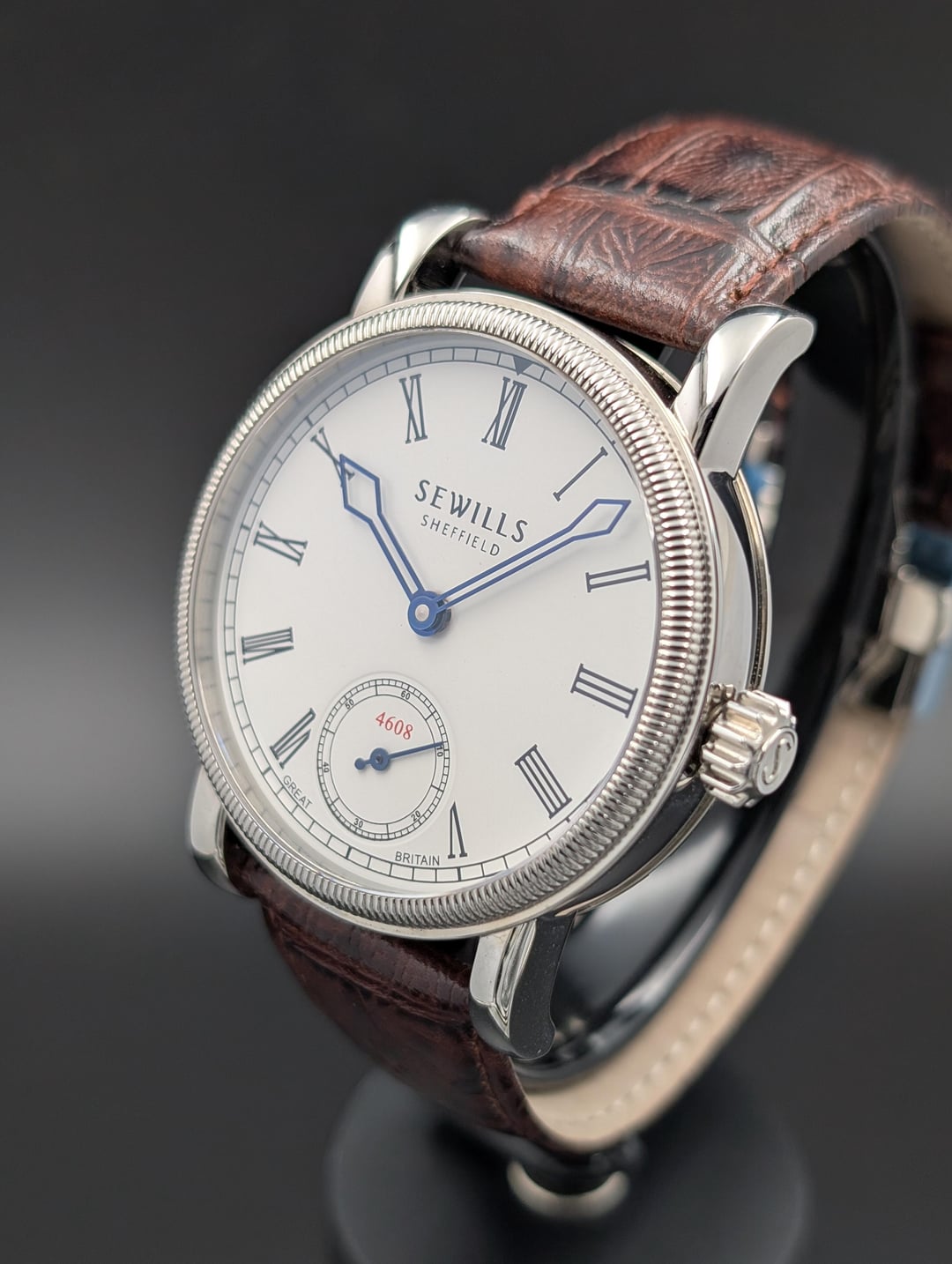 This watch, with a distinctive marine chronometer style, was designed as a tribute to marine chronometer serial no. 4608 (Joseph Sewill, English) that was used on the famous English tea clipper ship 'Cutty Sark'. Limited to 100 numbered pieces. Original retail was approx. $1,400. The watch is in like-new, unworn condition. The watch winds, sets, and runs. No box or papers. Model: Sewills Ferreira Limited Edition Manual Wind ref. PRS-39 Note: Limited to 100 numbered pieces Movement: Swiss-made Unitas 6498 hand-winding movement extensively modified with screwed Glucydur balance with Nivarox hairspring, swan-neck regulator, 3/4 top plate with Geneva stripes, anglage and blued screws Dial: white, custom blued hands Case: 42mm Thickness: 10.75 mm Strap: Alligator calf grain with Sewills double deployment clasp **Watch offered at $899 OBO shipped. USA shipping only. No trades.**
